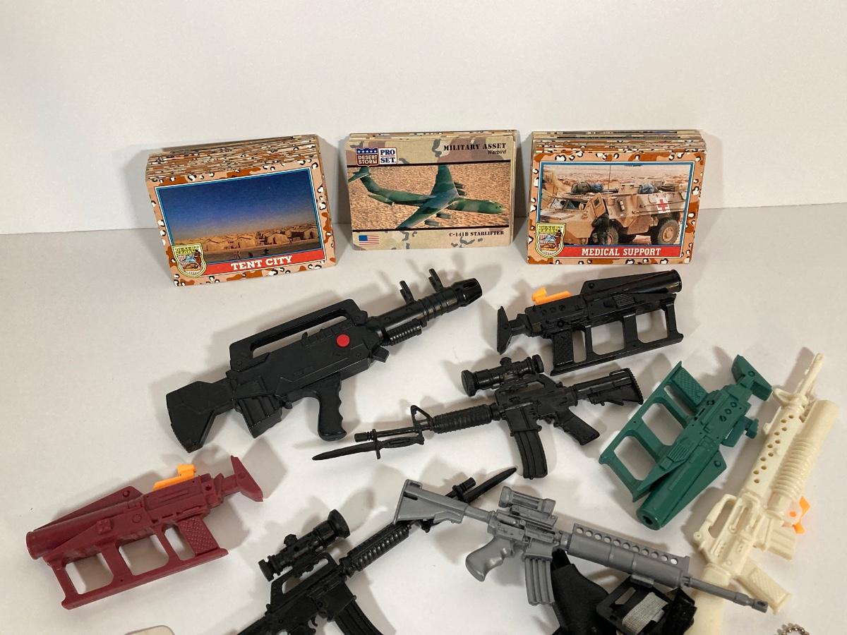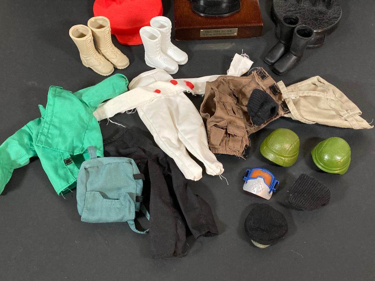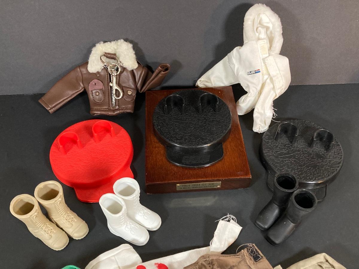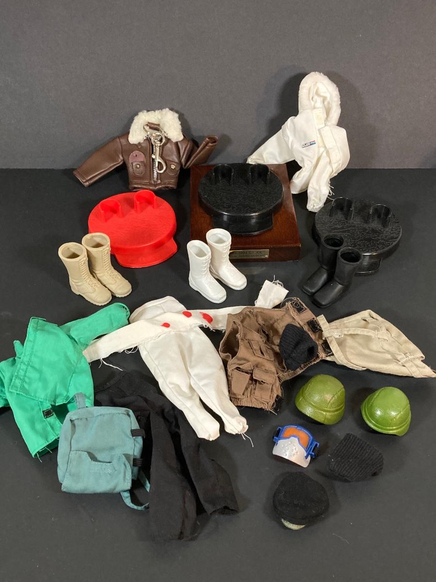 LOT 68: Collection of G.I. Joe Action Figures, Stands, Clothing, Parts, Desert Storm Cards and More