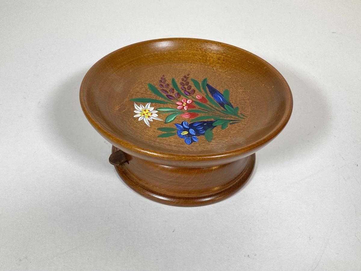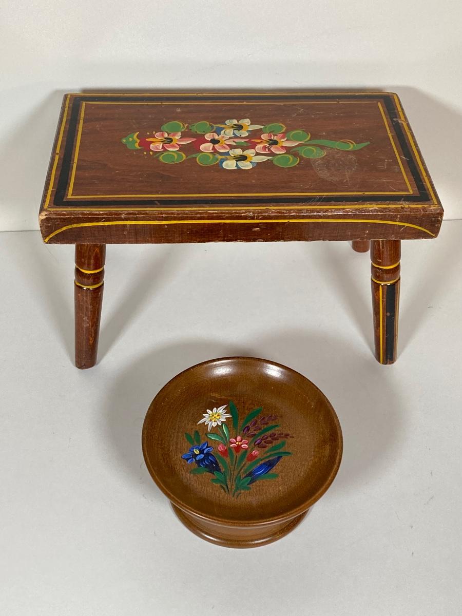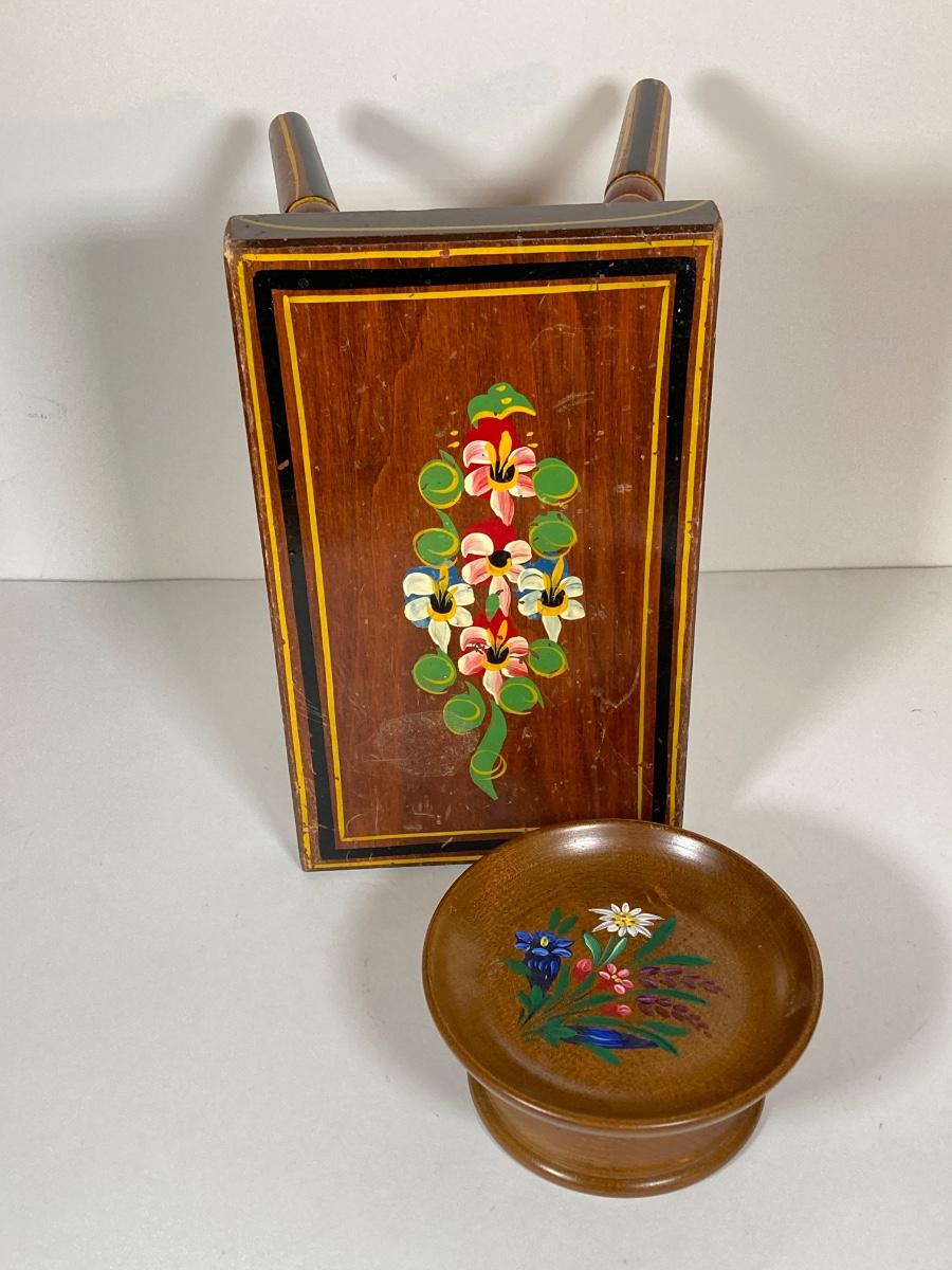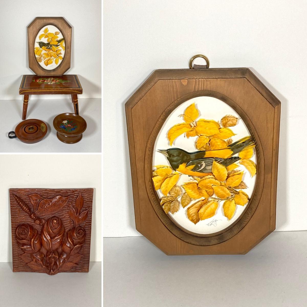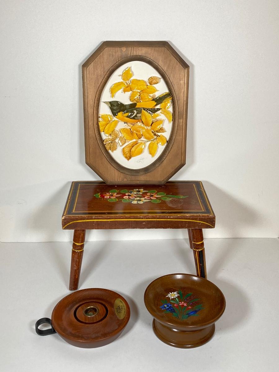 LOT 74: Collection of Hand Crafted Wood Decor - 3D Bird Wall Hanging, Cuendet Rotating Swiss Musical Bowl, Painted Stool, Carved Wall Hanging and Candle Holder