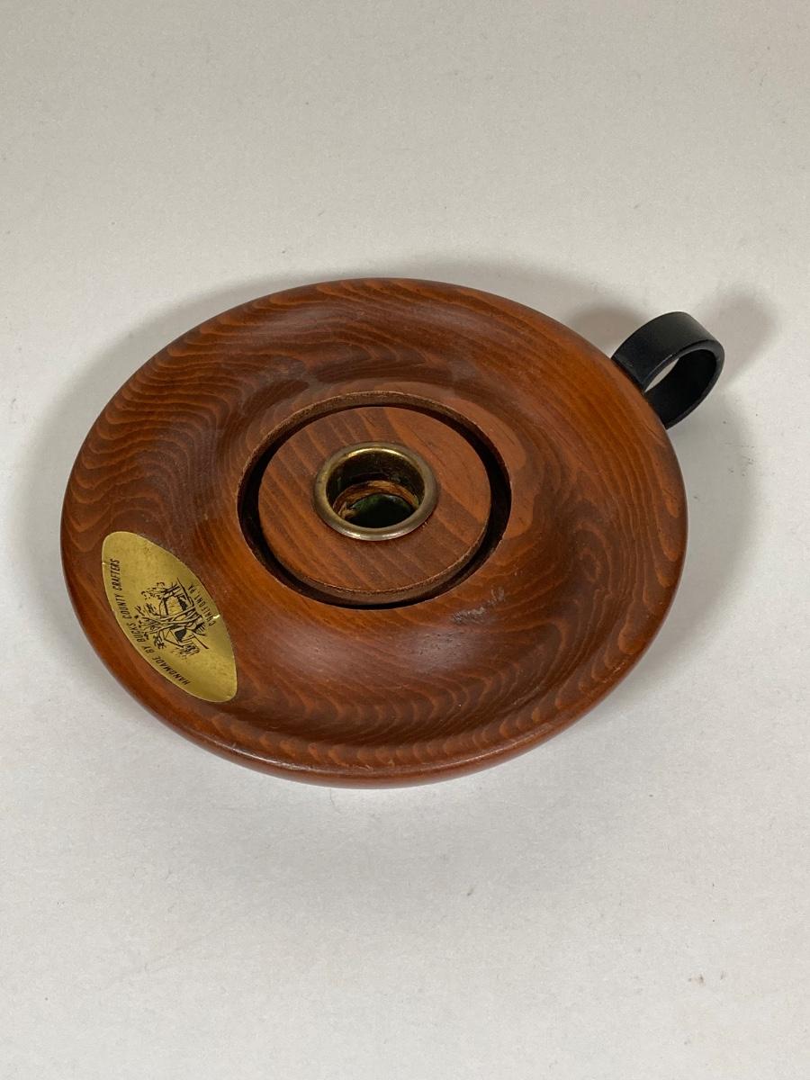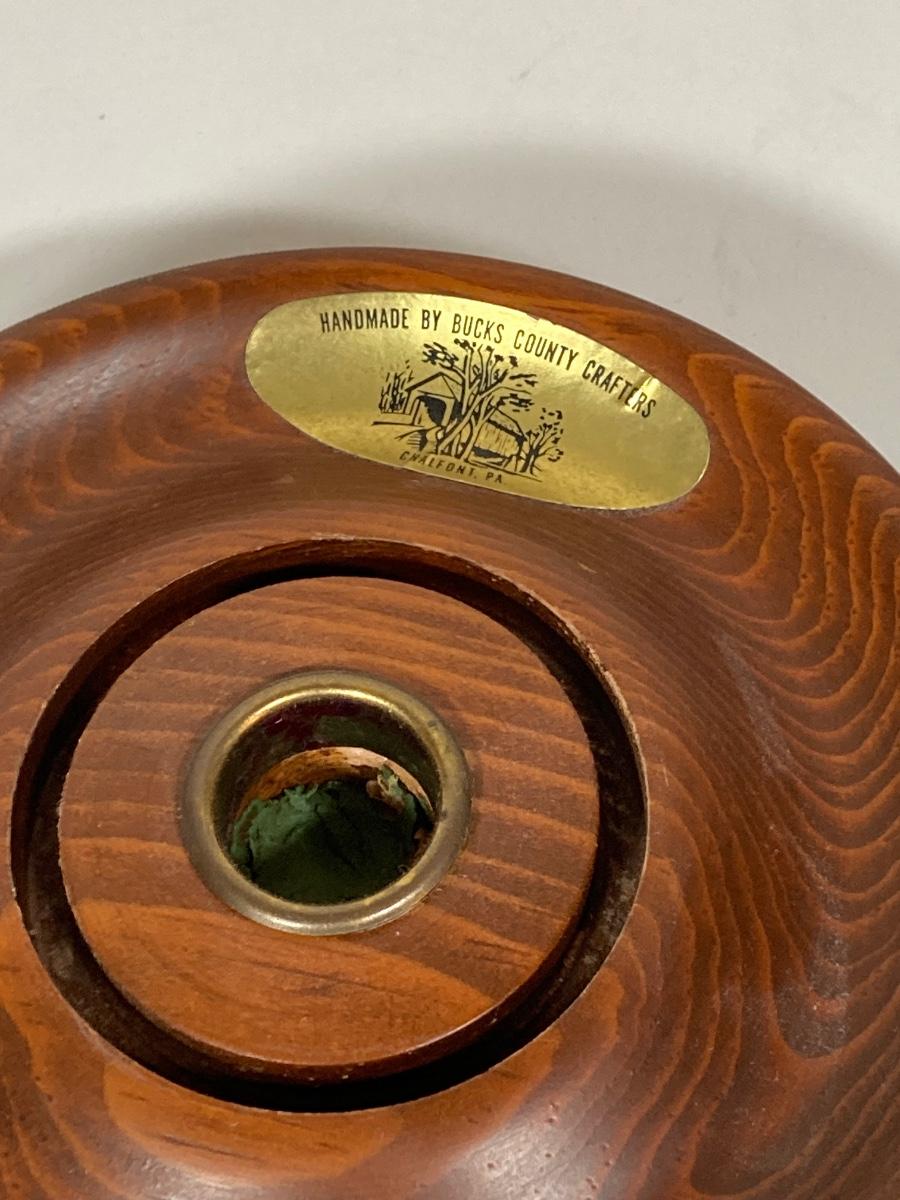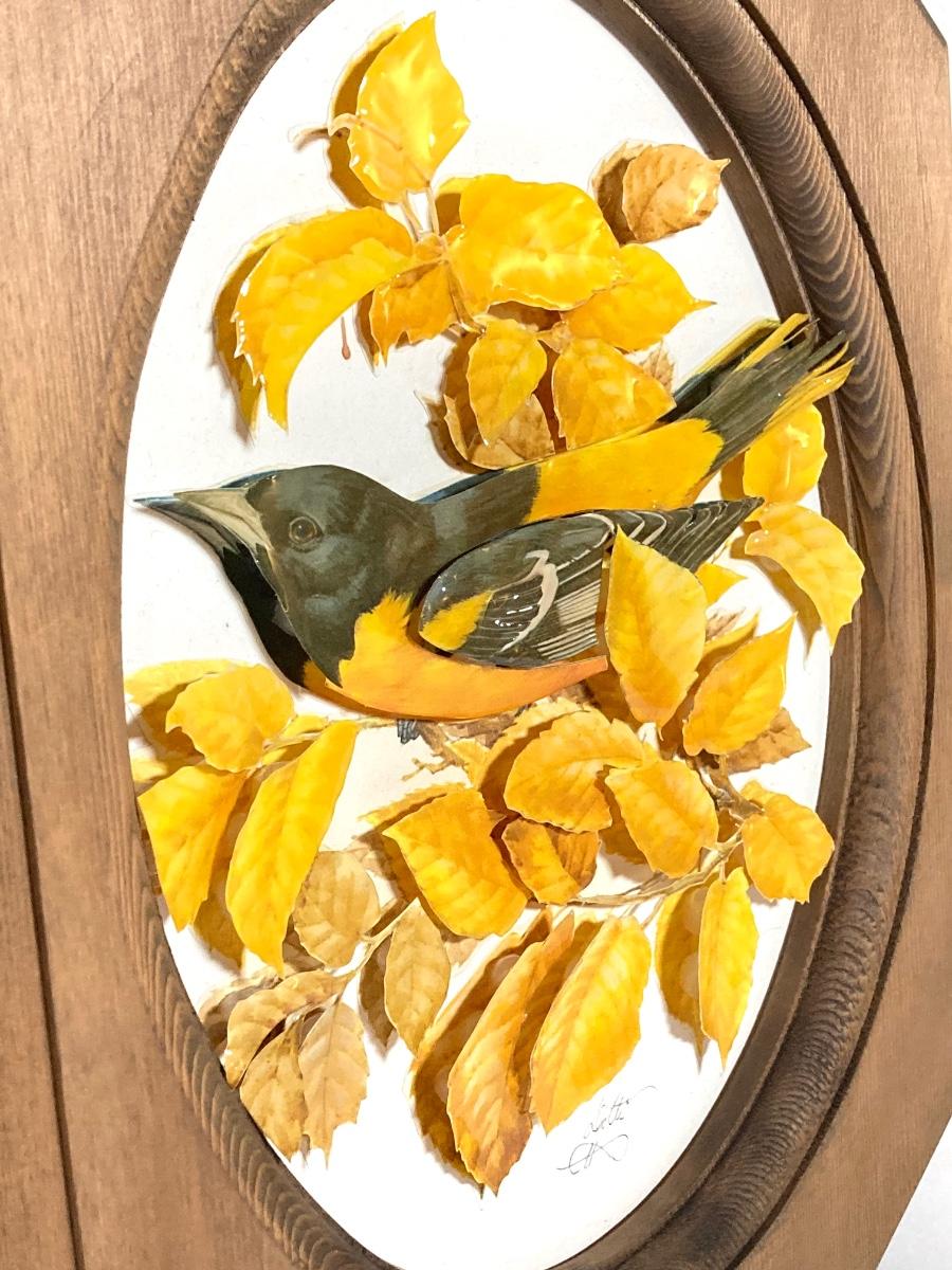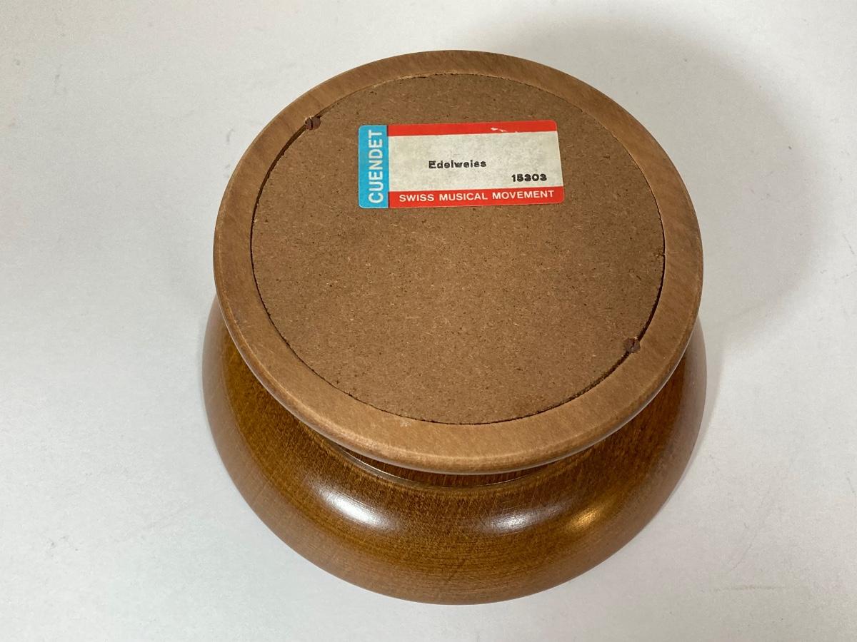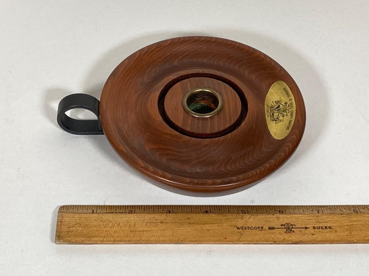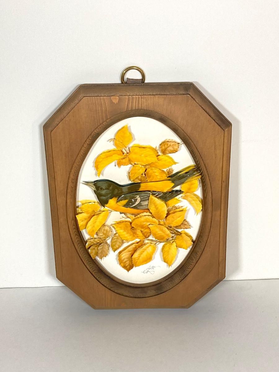 LOT 74: Collection of Hand Crafted Wood Decor - 3D Bird Wall Hanging, Cuendet Rotating Swiss Musical Bowl, Painted Stool, Carved Wall Hanging and Candle Holder