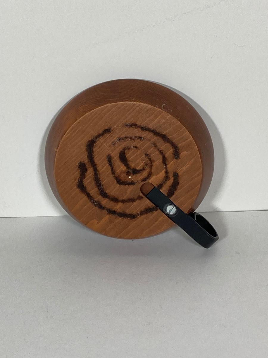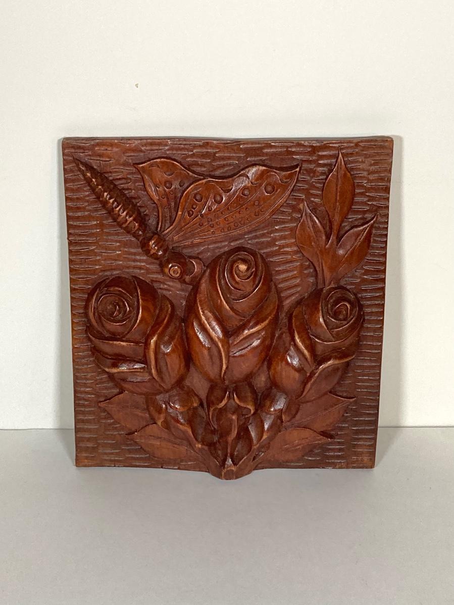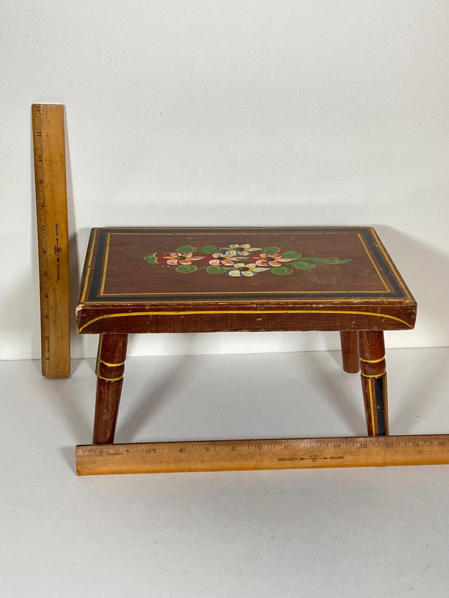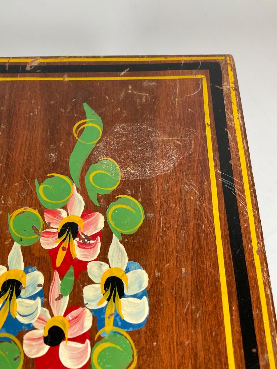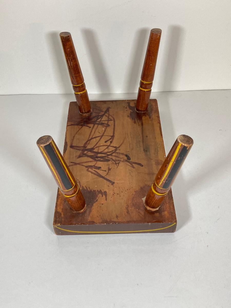 LOT 74: Collection of Hand Crafted Wood Decor - 3D Bird Wall Hanging, Cuendet Rotating Swiss Musical Bowl, Painted Stool, Carved Wall Hanging and Candle Holder