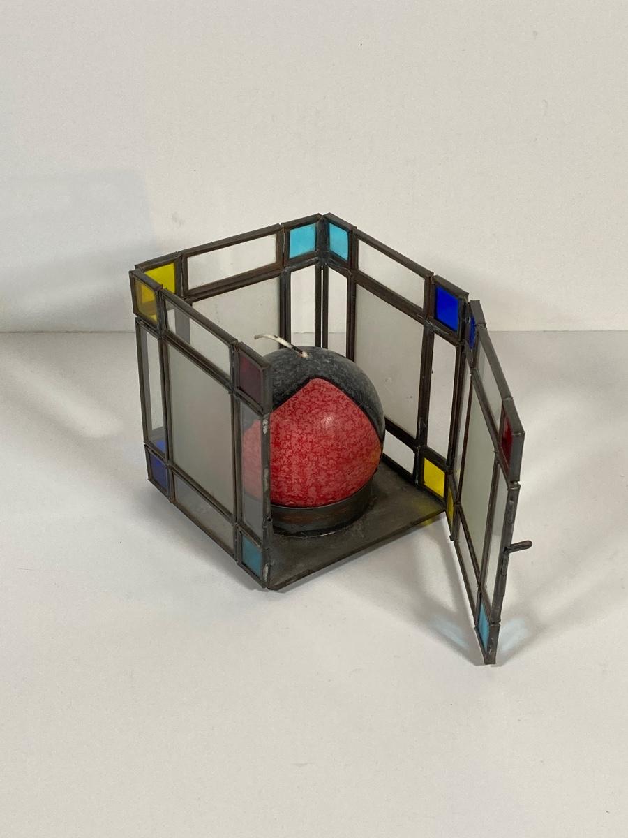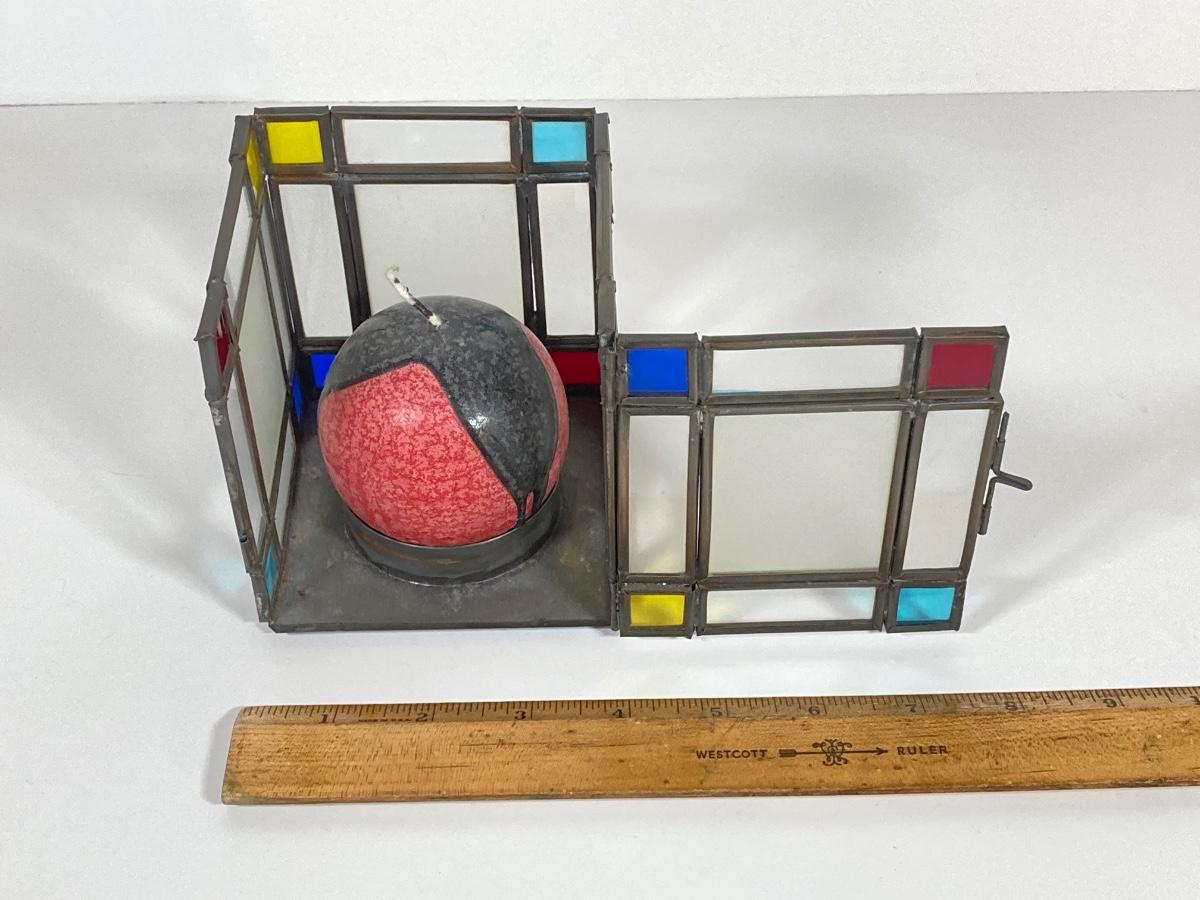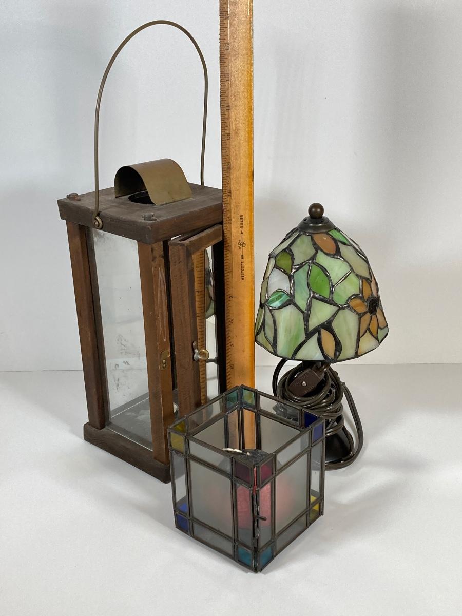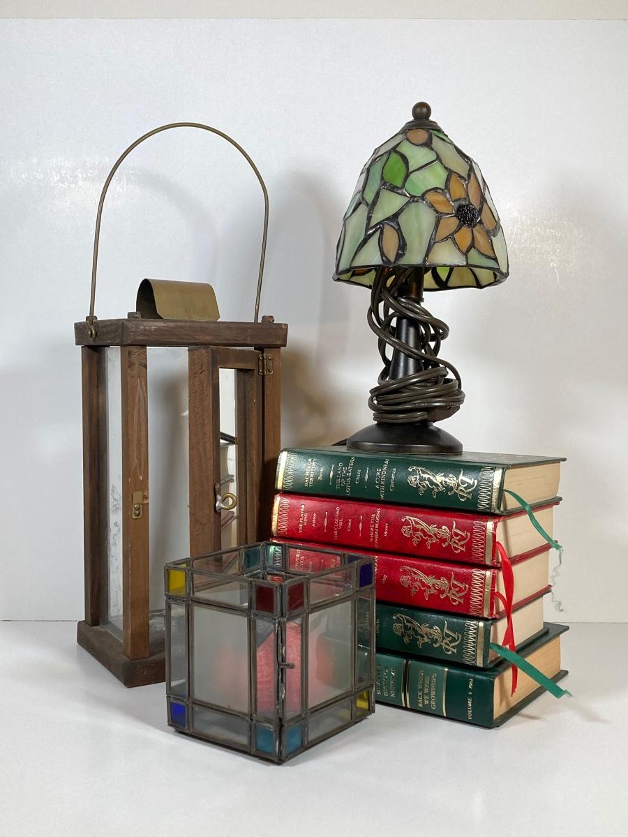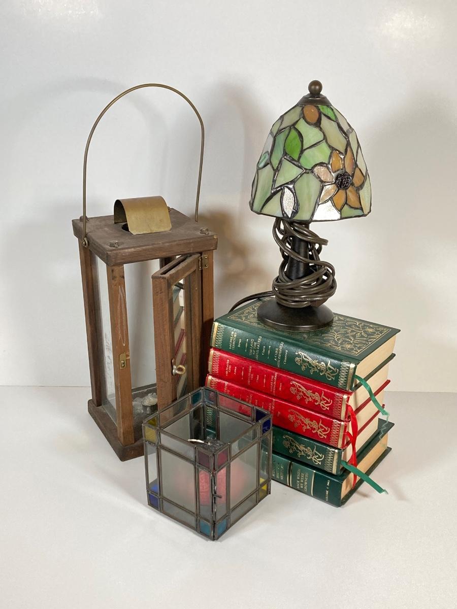 LOT 78: Vintage Candle Lantern, Stained Glass Lamp, Stained Glass Candle Holder and Collection of Hard Back Books