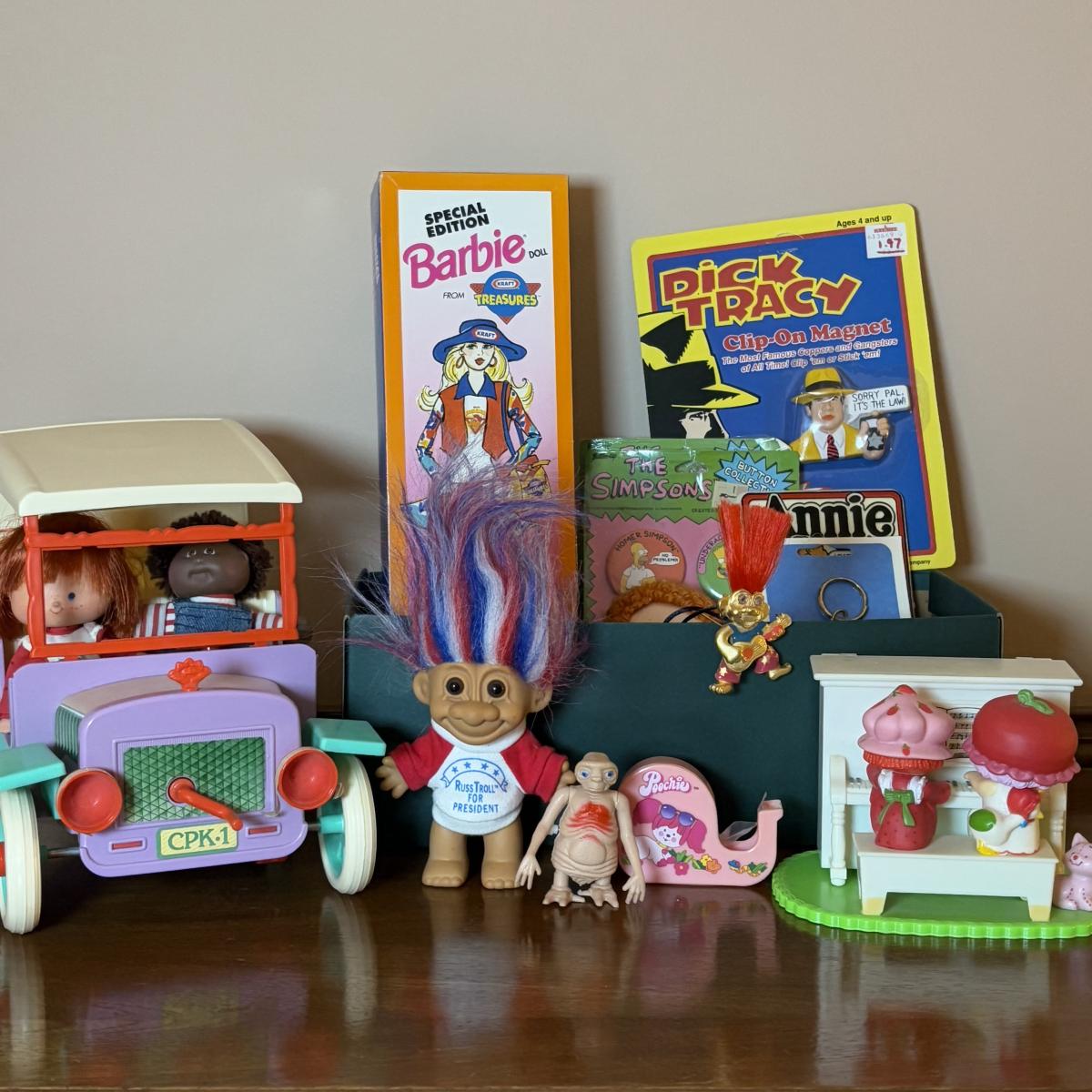 LOT 94: Vintage/Fun Children's Toys: Cabbage Patch Kids Wind-Up Buggy, Kraft Barbie, Strawberry Shortcake, Trolls & More