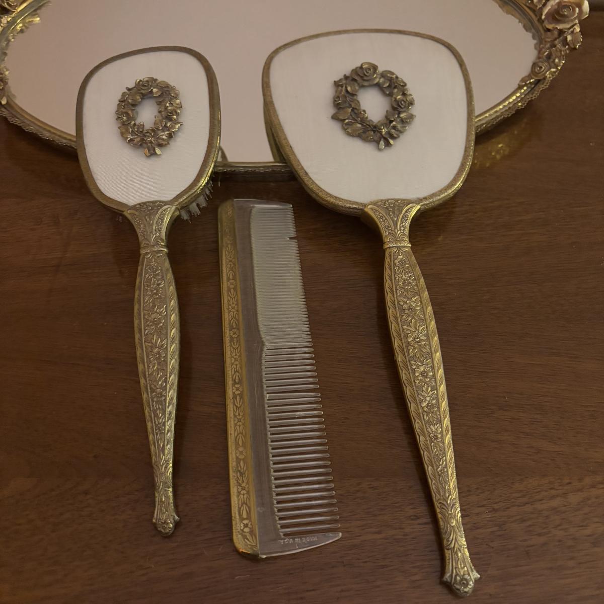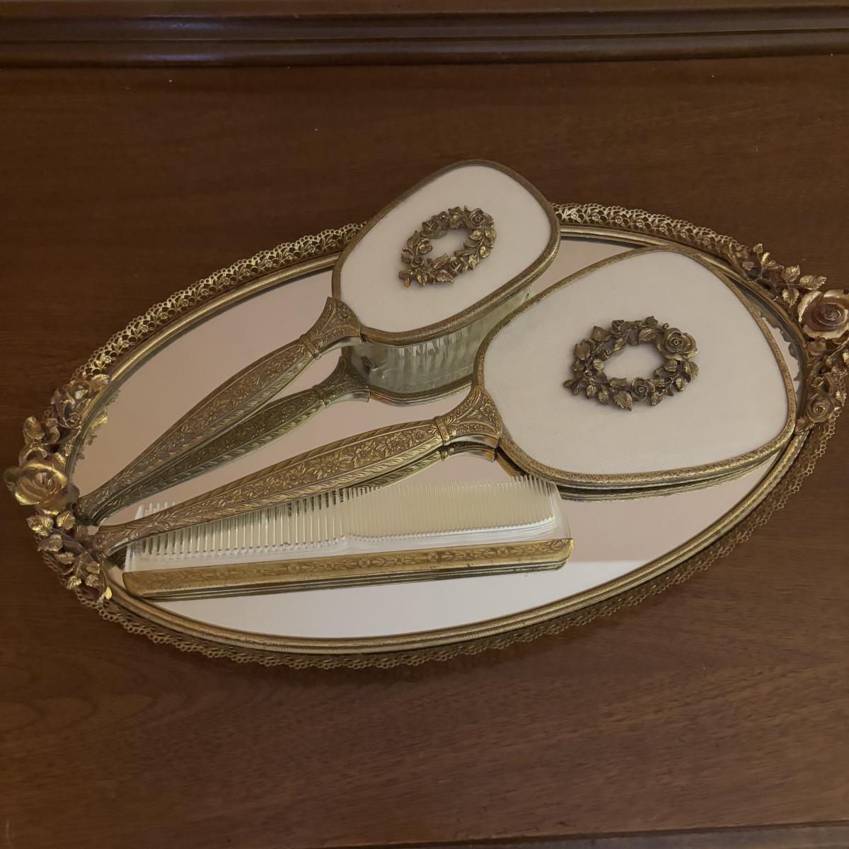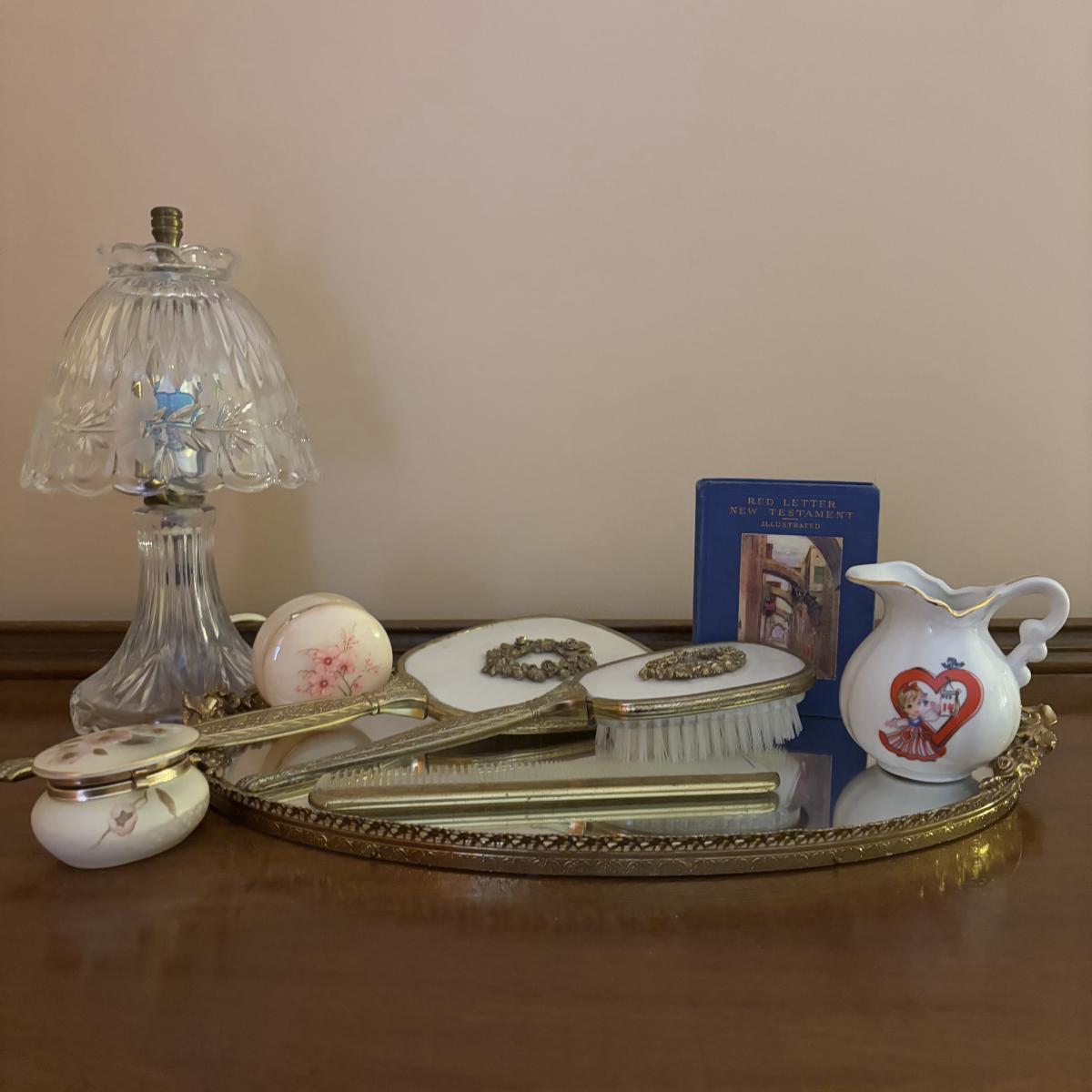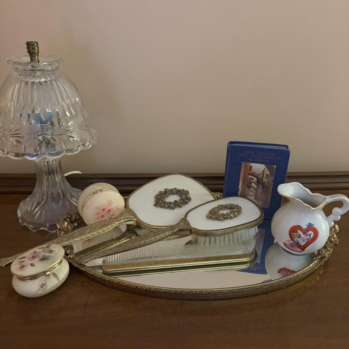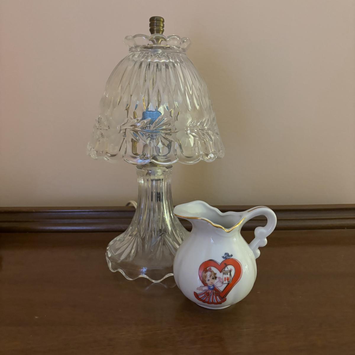 LOT 97: Vanity Collection: Crystal Night Light Lamp, Mirrored Vanity Tray, Hand Mirror, Brush, Comb Set, Lefton Pitcher & More
