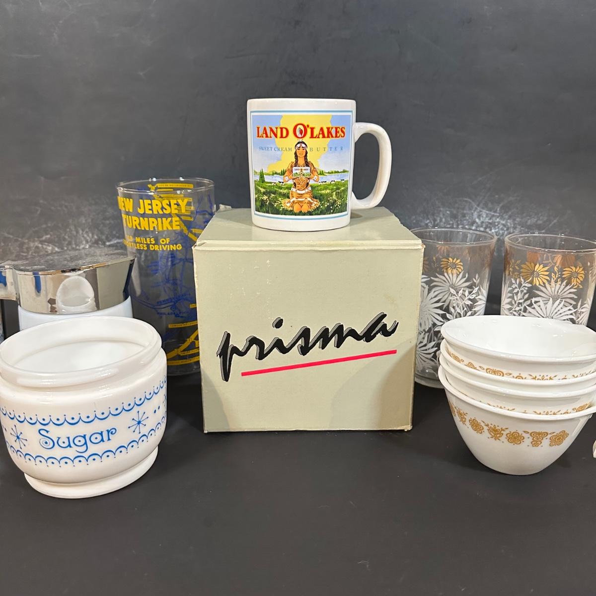LOT 115: Frosted Prisma Glasses, Land O Lakes Mug, Mason Jars & More