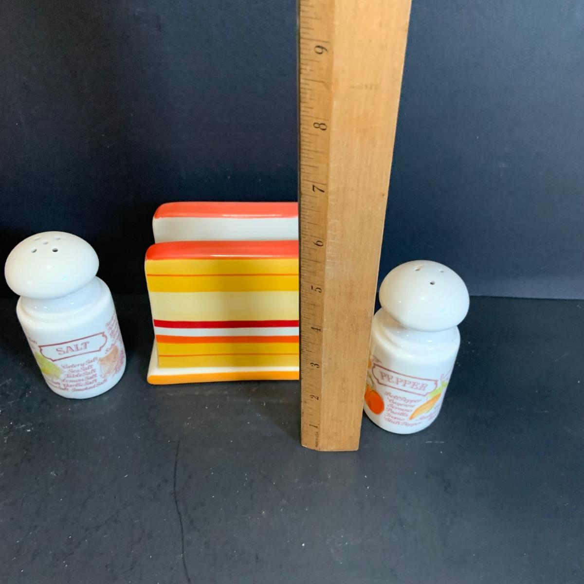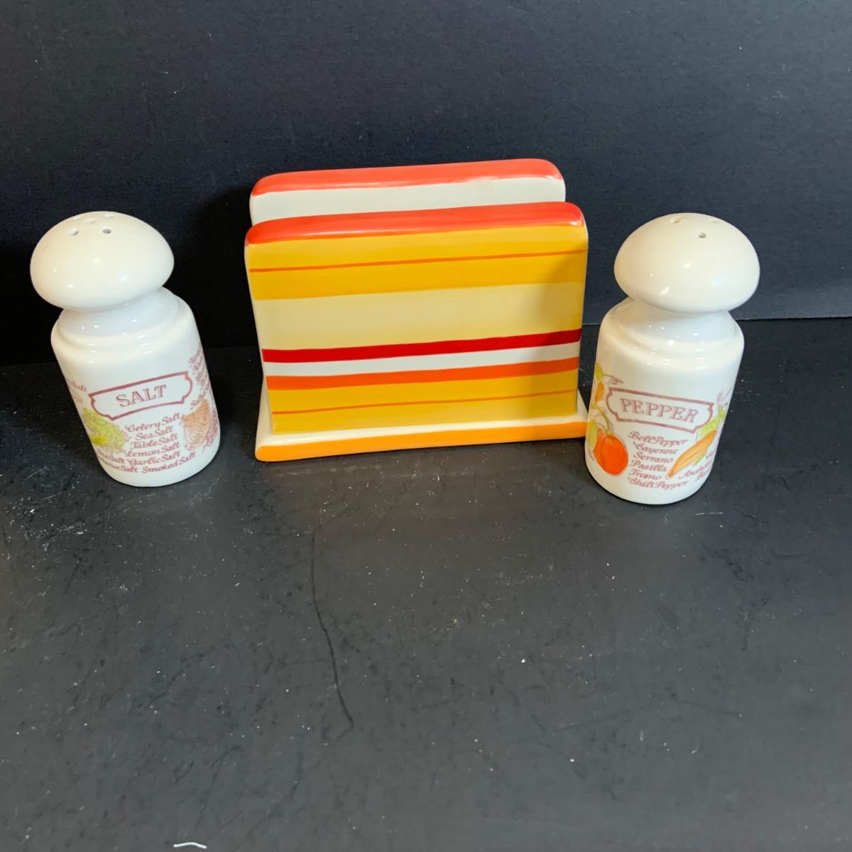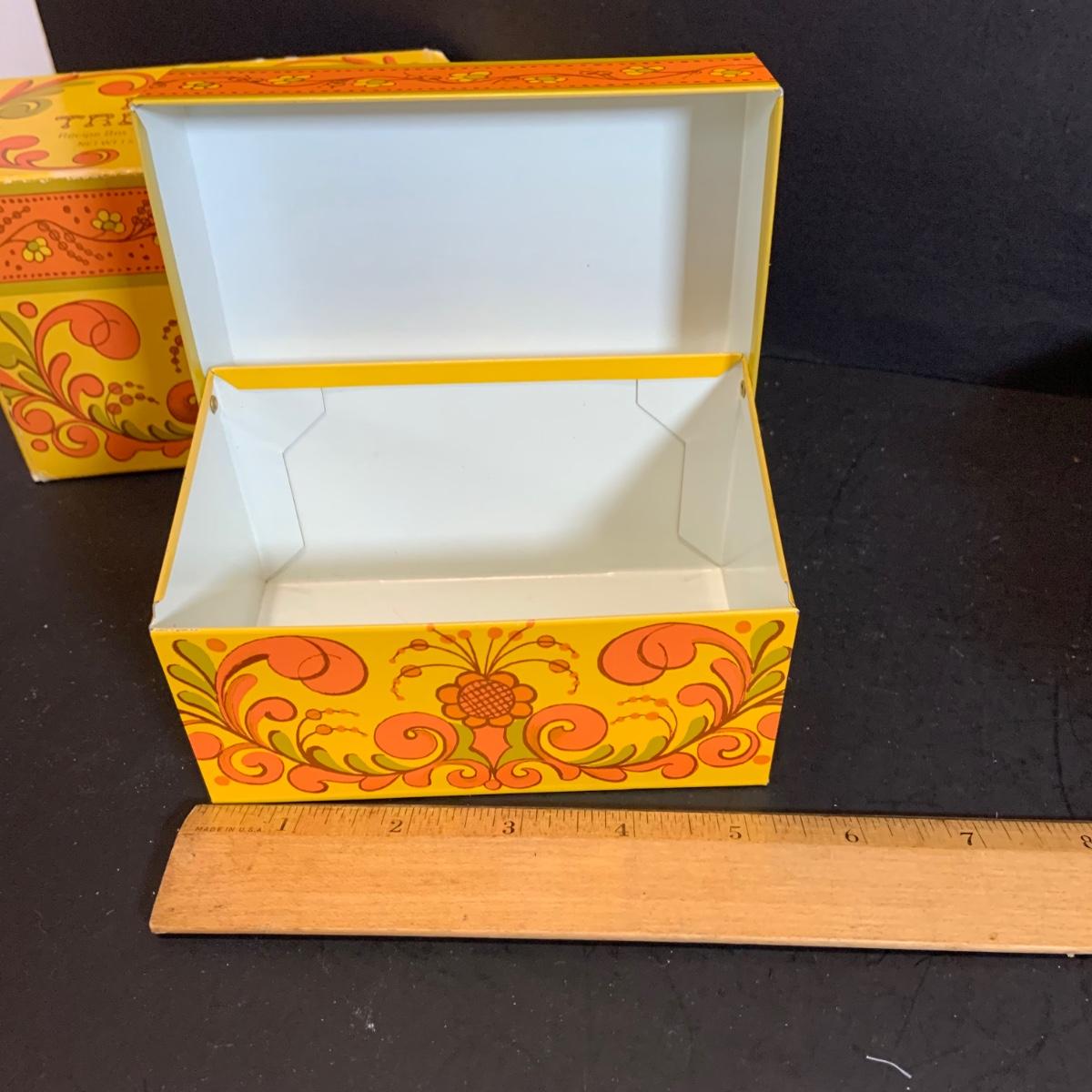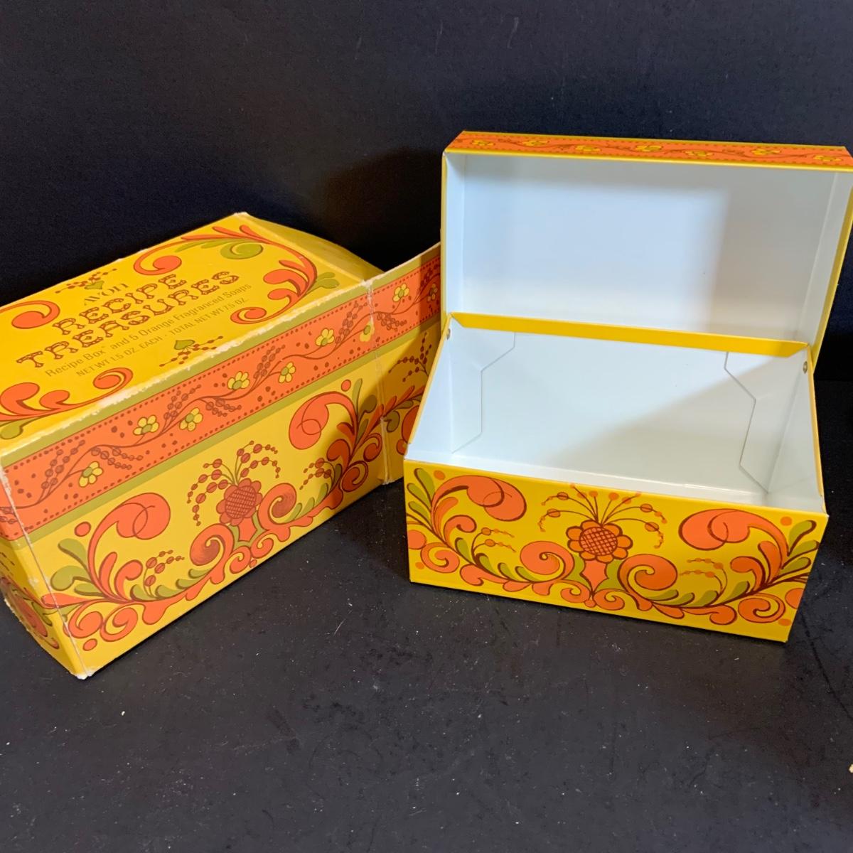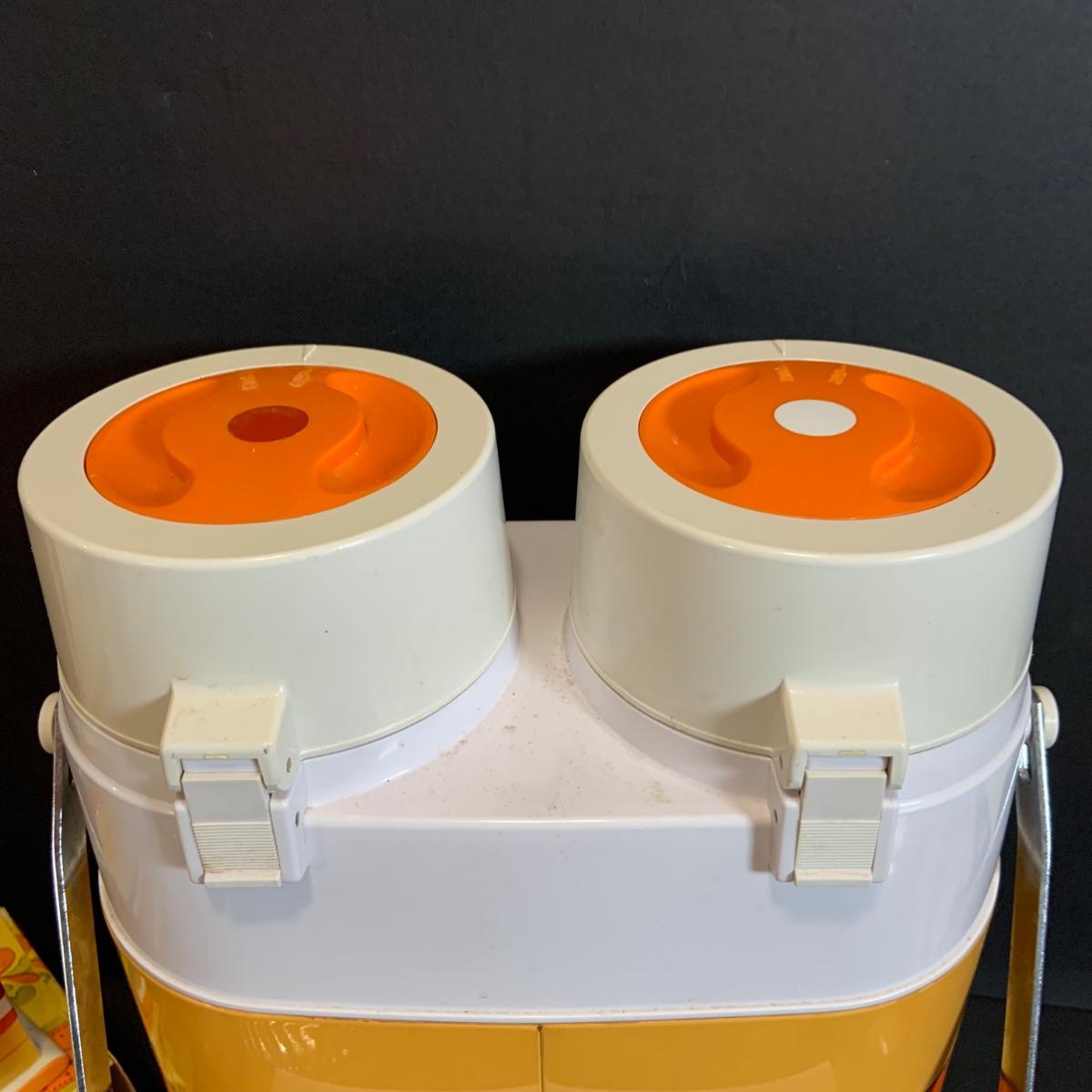 LOT:180: Mid-Century Orange Kitchen Including a Peacock Hot/Cold Twin Air Pot Vacuum Thermos, 70' Style Drinking Glasses and Napkin Holder, Avon Salt and Pepper Shakes and Recipe Box and More