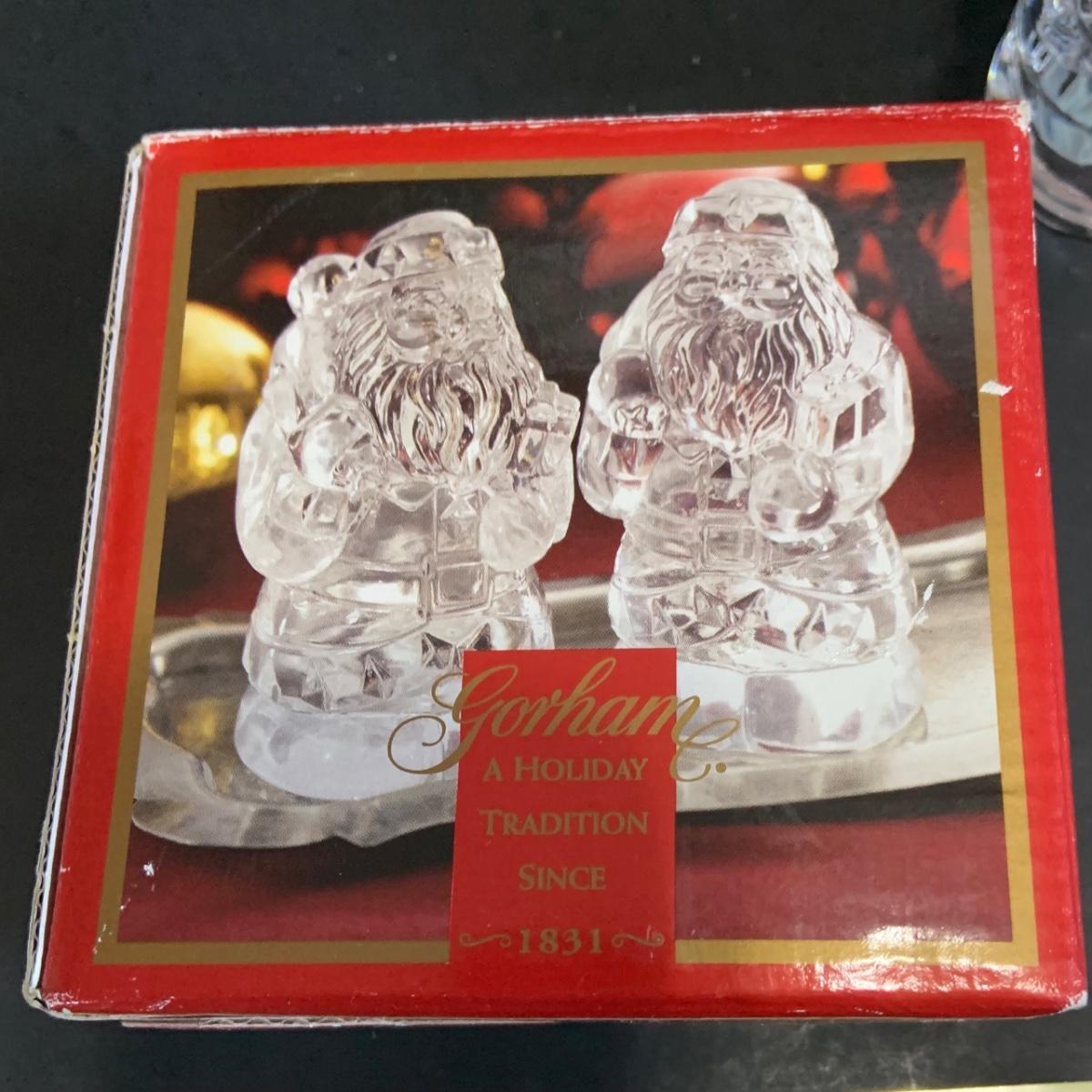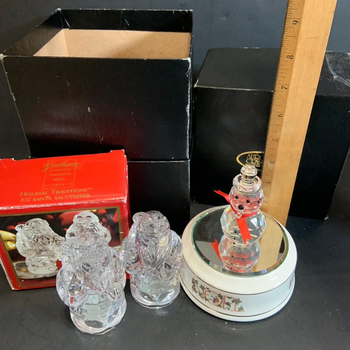 LOT:184: Aurora Crystal Snowman Noel Music Box and Gorham Santa Salt and Pepper Shakers