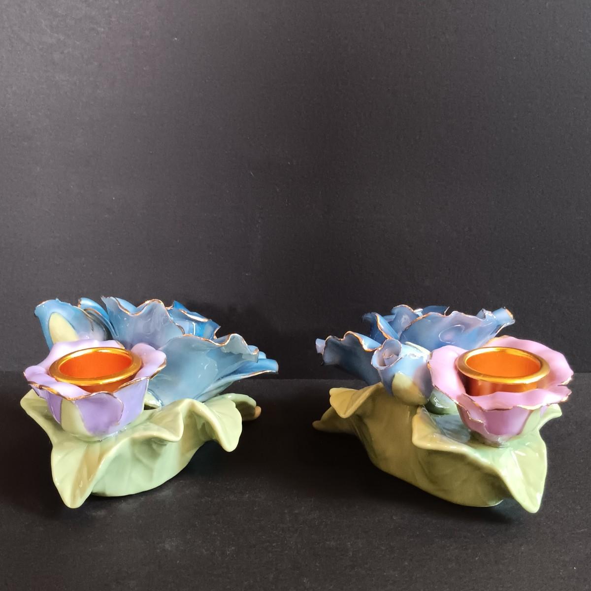 LOT 194: Royal Albert Moonlight Rose Rosebud Candle Holders, Lillian Vernon Porcelain Red Rose & Porcelain Yellow Rose Marked 1999 YH