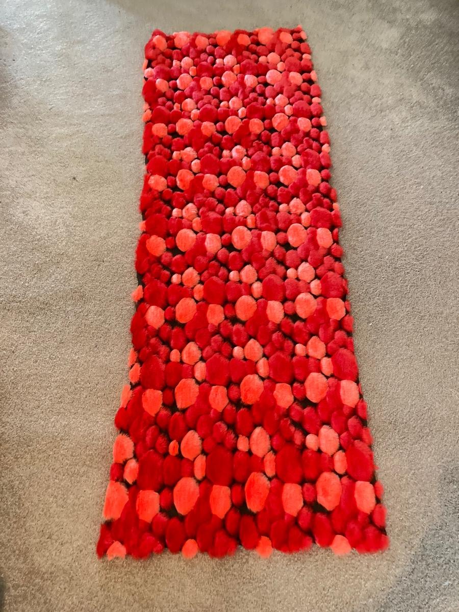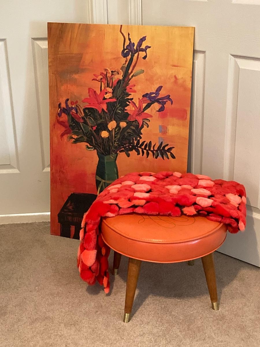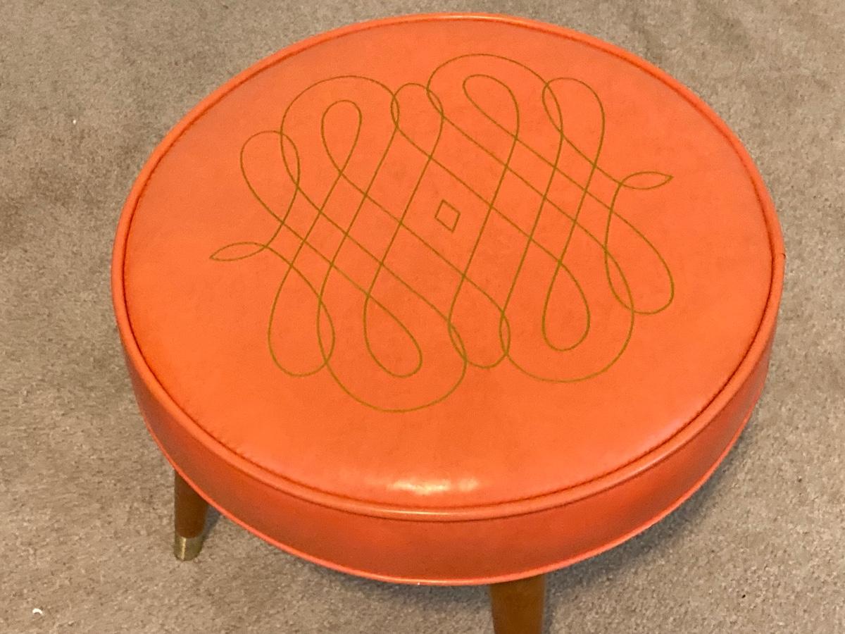 LOT 219: Mid-Century Modern Art, Orange Peg Leg Foot Stool (Babcock Phillips Corporation) and Circle / Dot Fabric