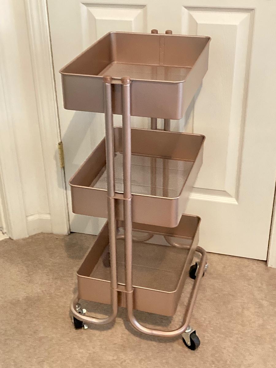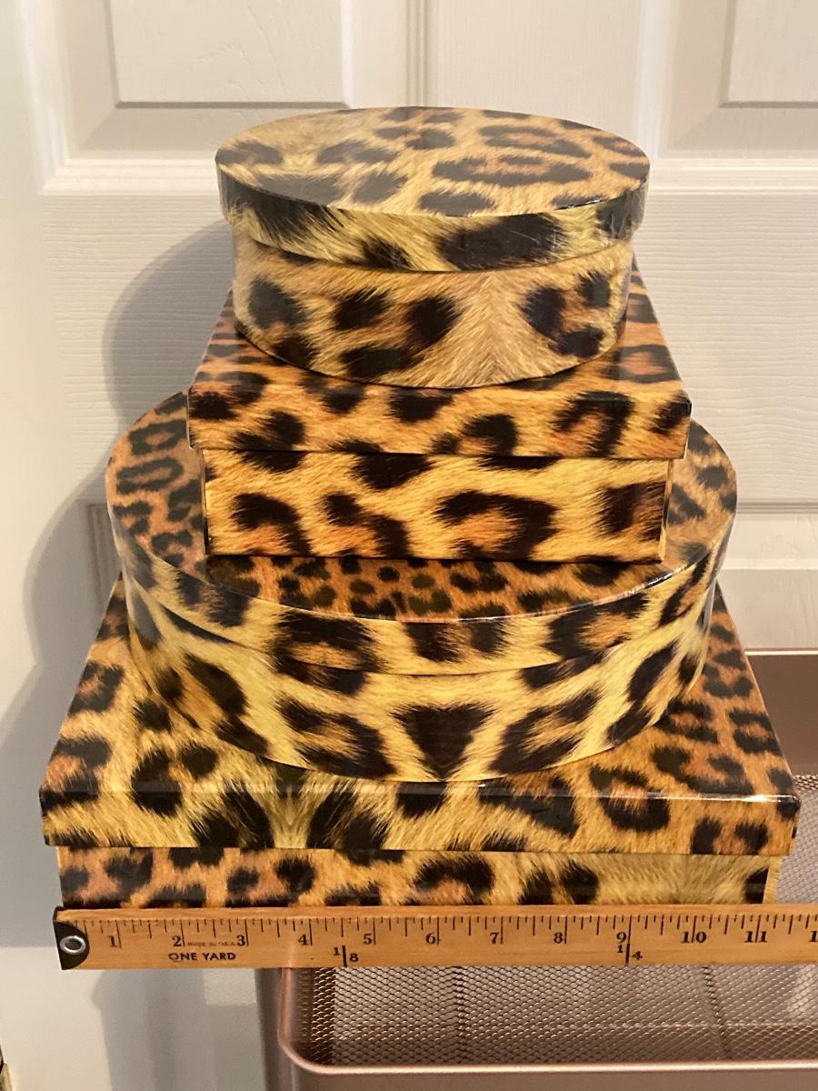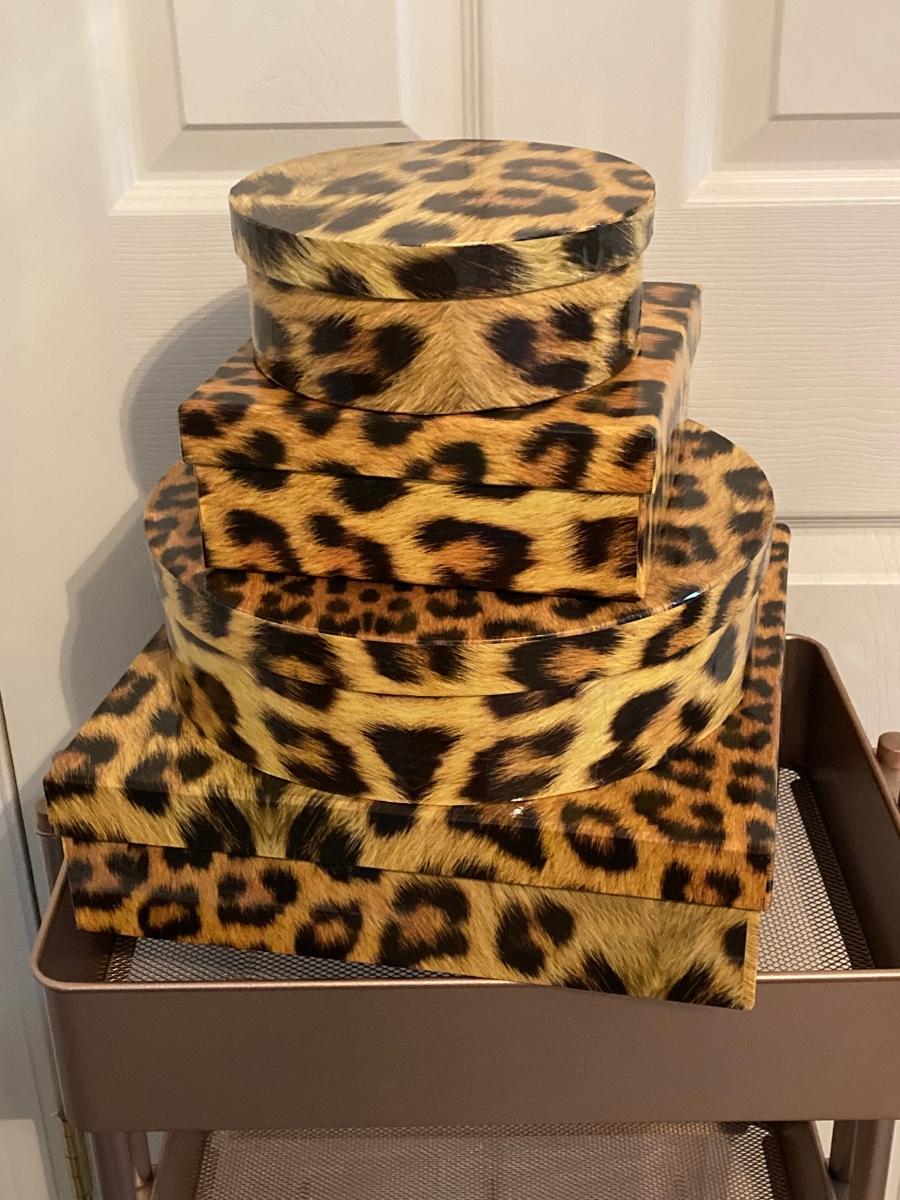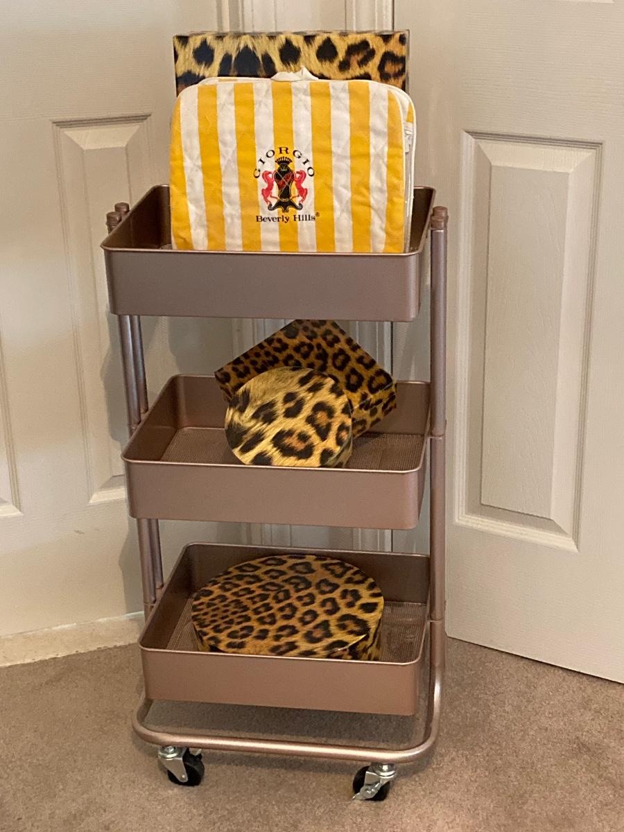 LOT 220: Three Tier Rolling Cart, Giorgio Beverly Hills Style Folding Travel Bag and Four Animal Print Storage Boxes