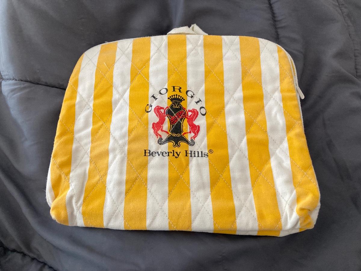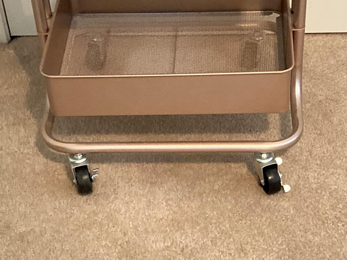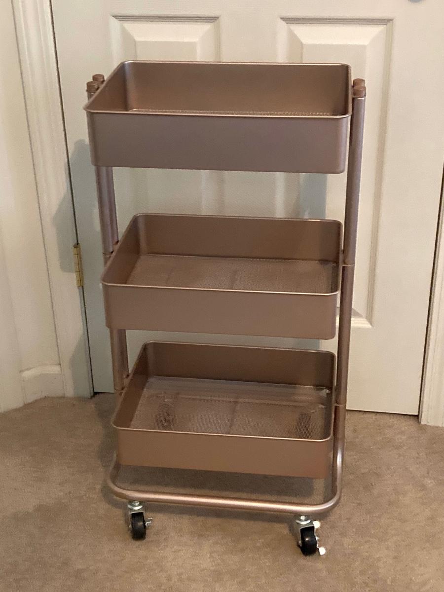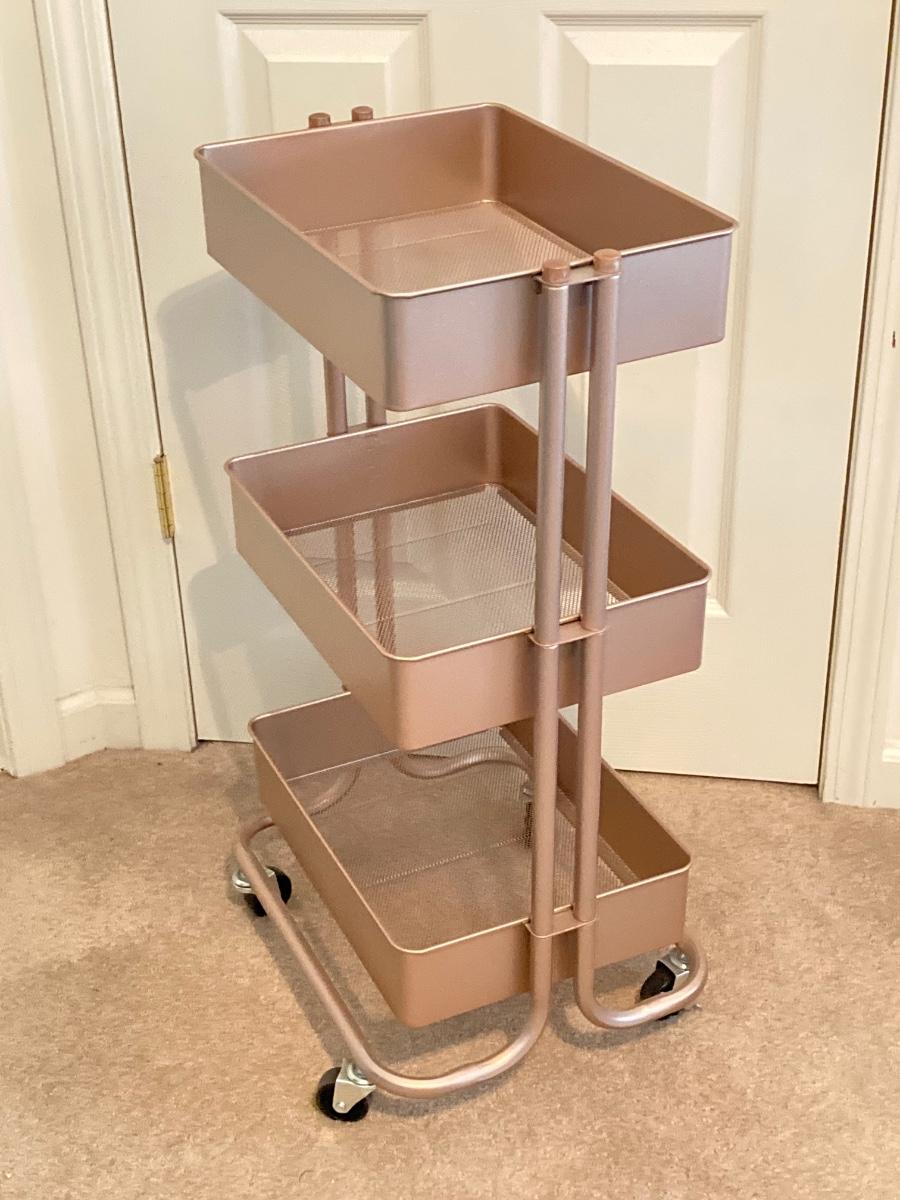 LOT 220: Three Tier Rolling Cart, Giorgio Beverly Hills Style Folding Travel Bag and Four Animal Print Storage Boxes
