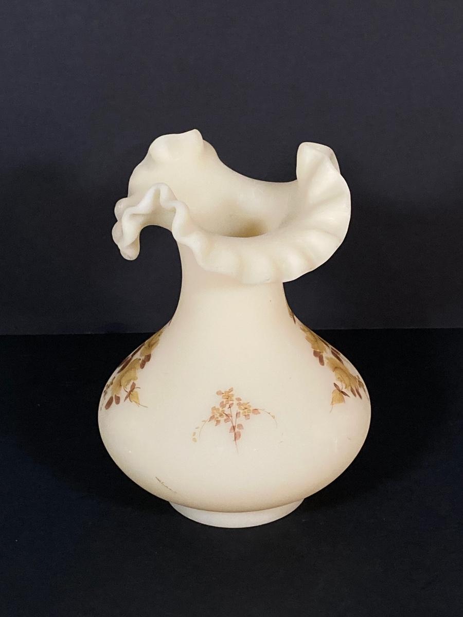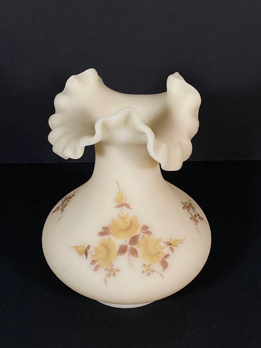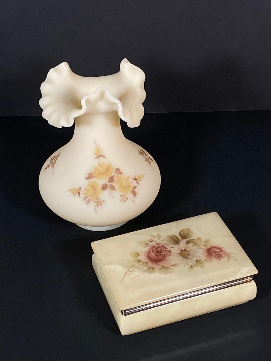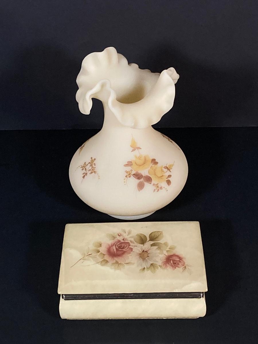 LOT 224: Satin Ruffled Top Hand Painted Fenton Vase and Floral Trinket Box