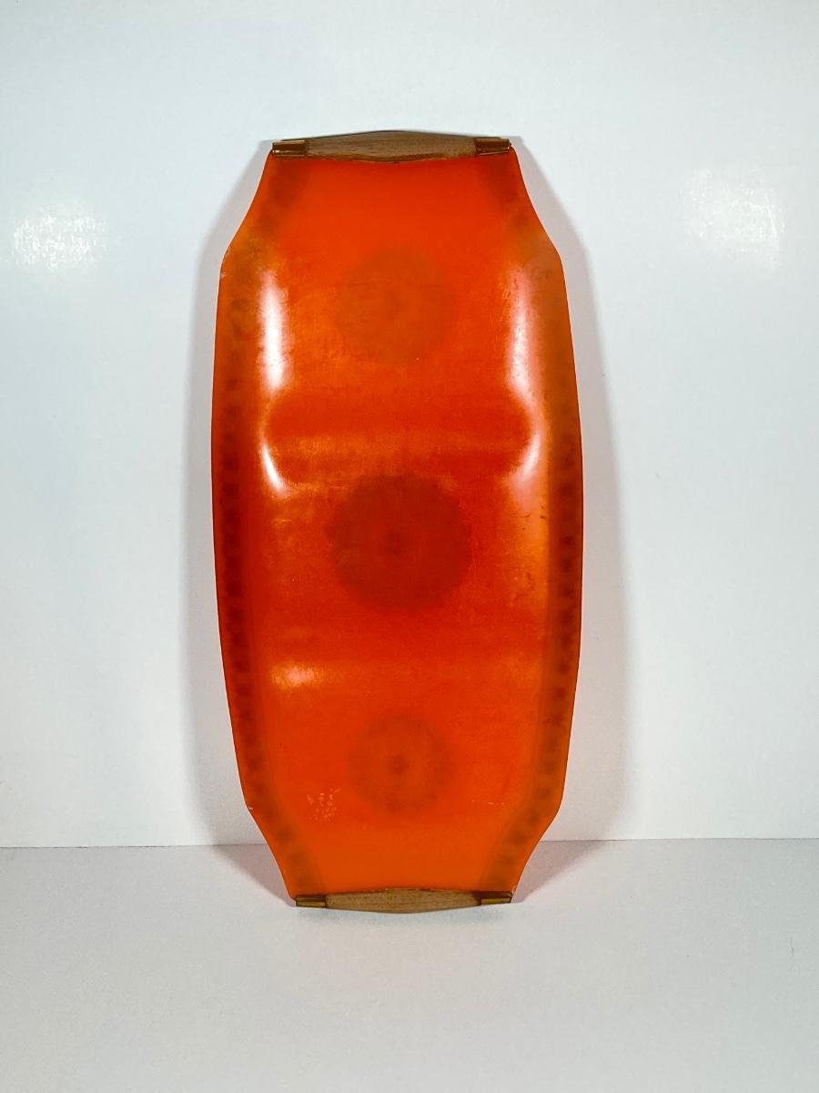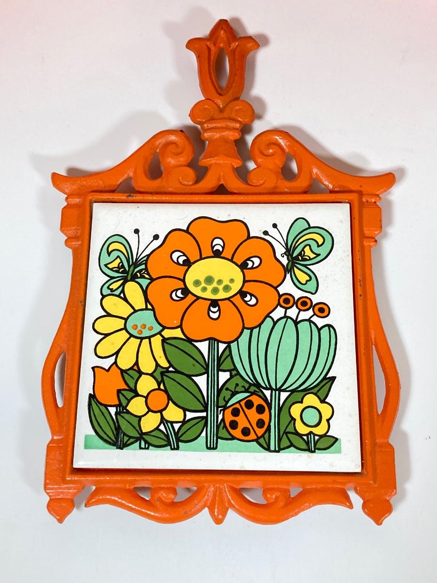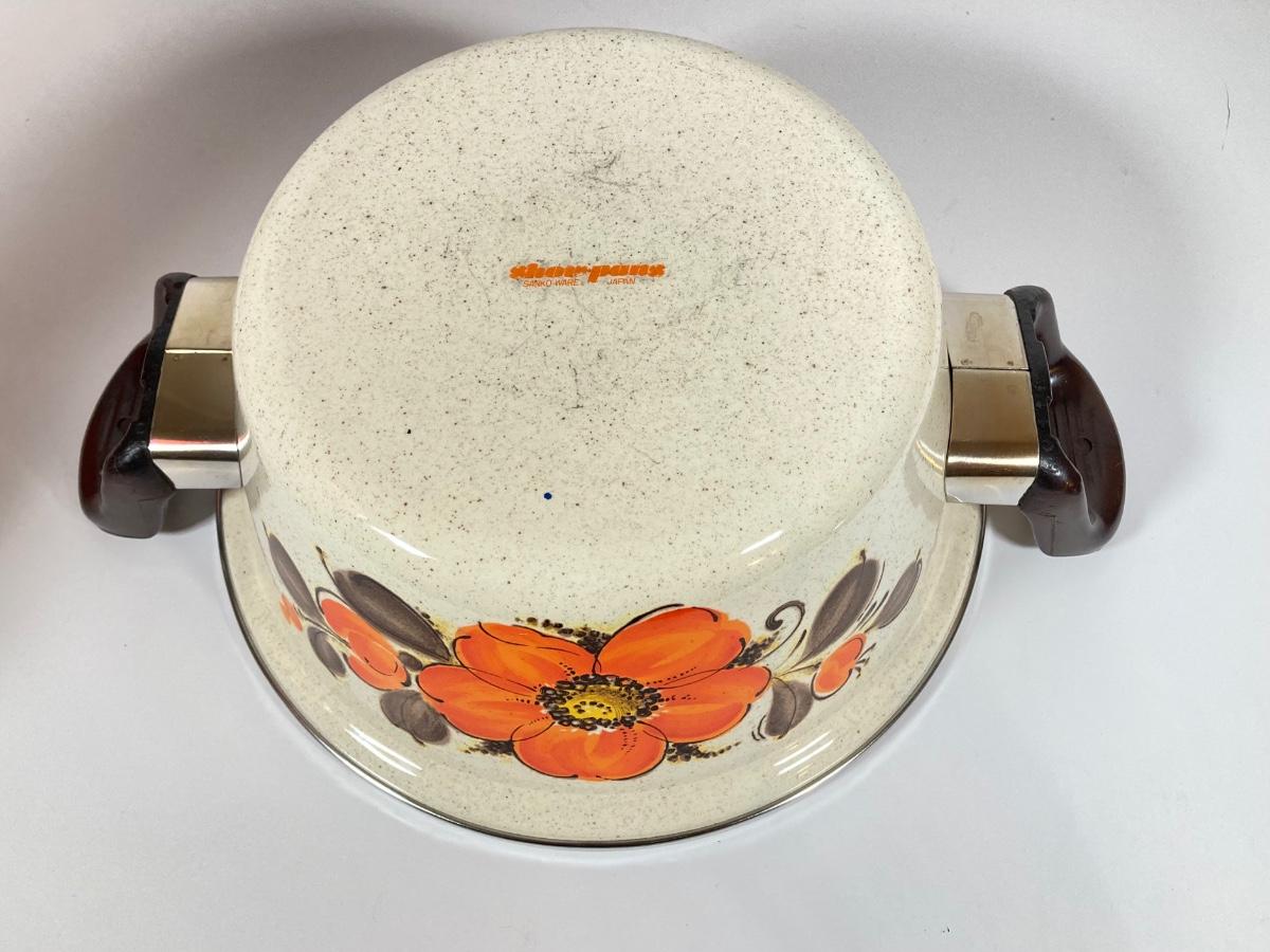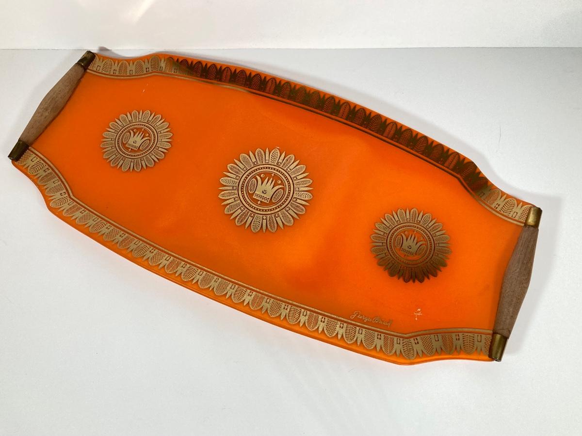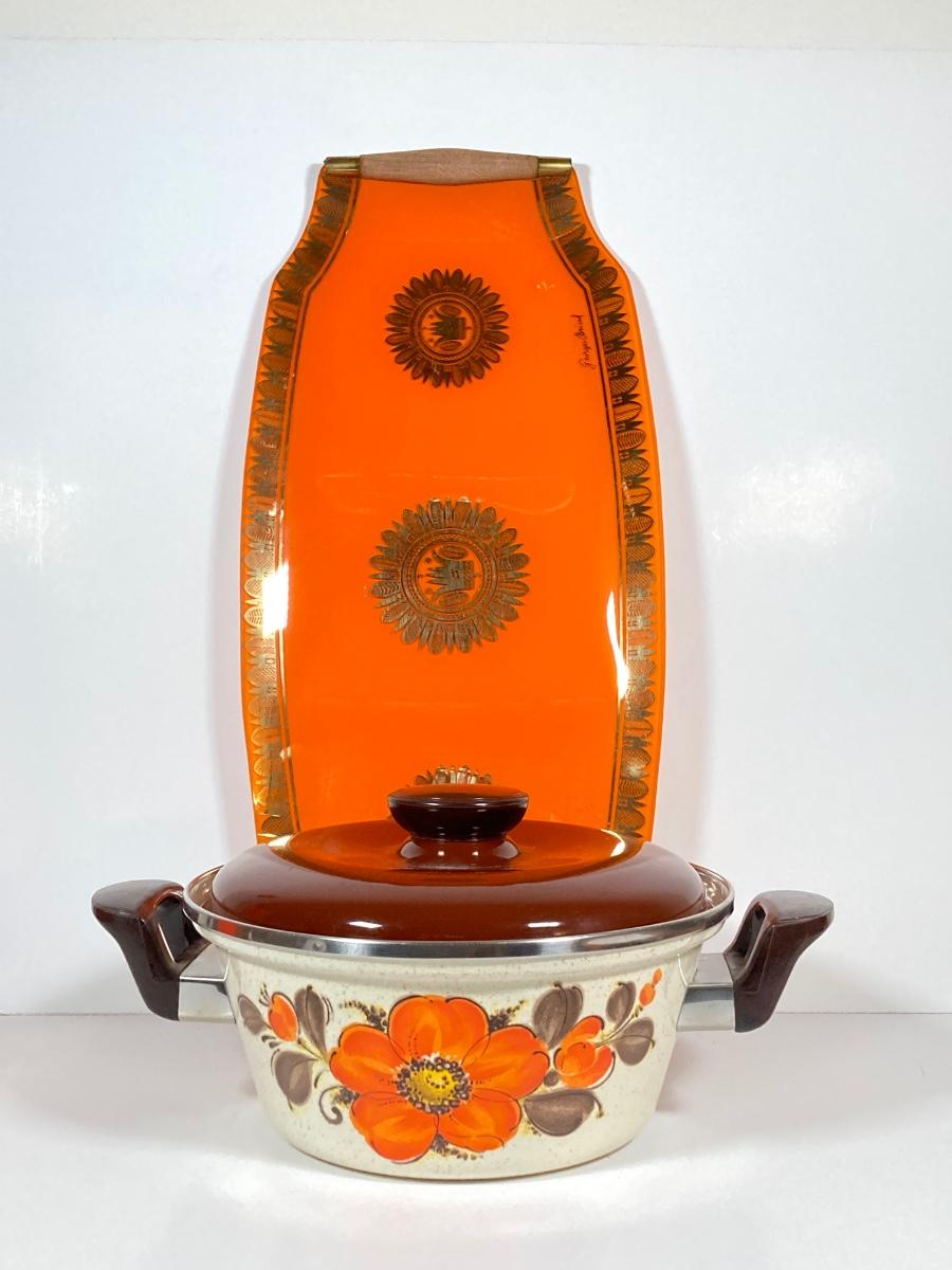 LOT 231: Mid-Century Modern Kitchen Collection - Serving Tray, Sanko-Ware Show Pan, Painted Trivet, Ikea Plastic Drinking Cups