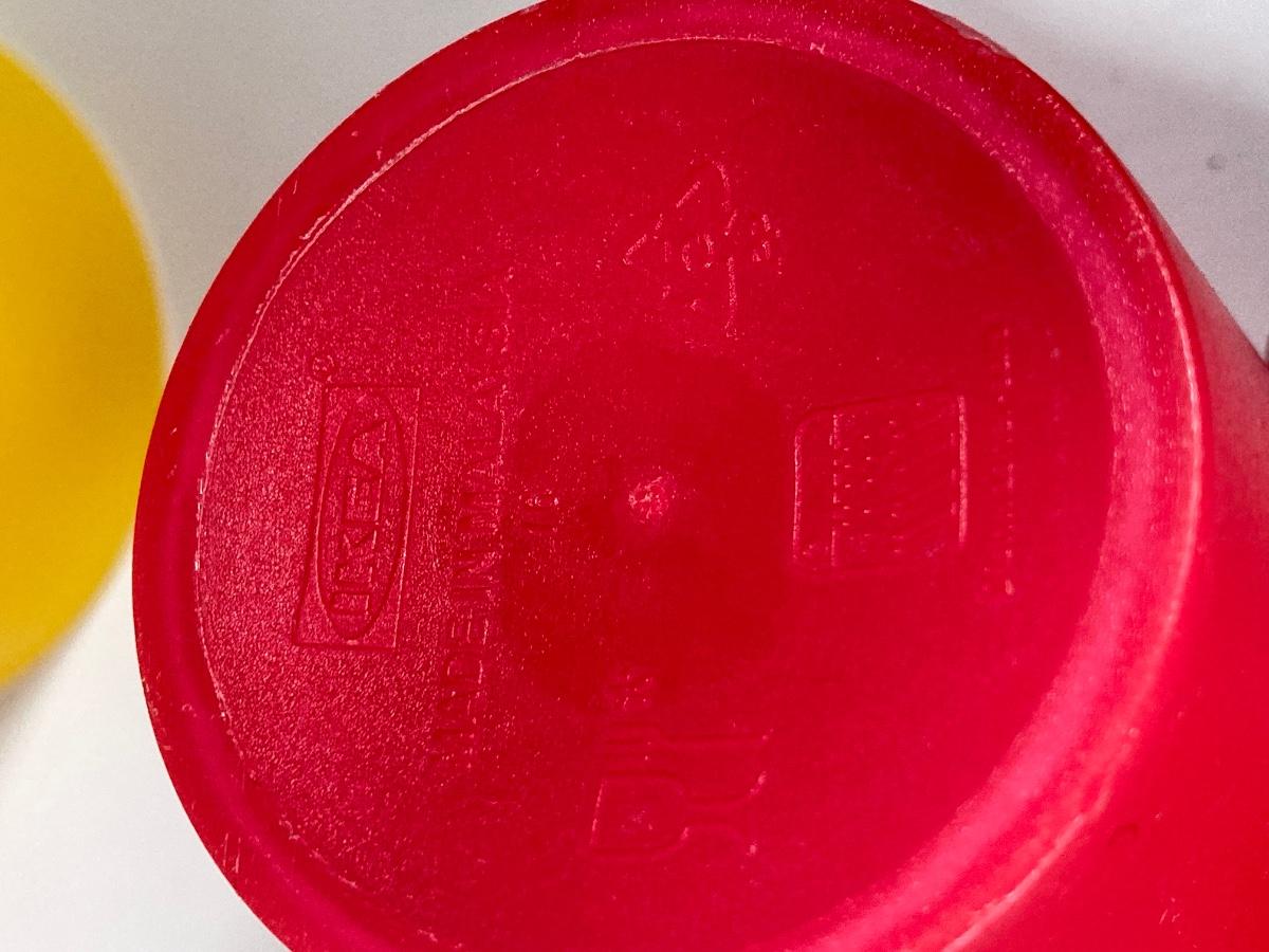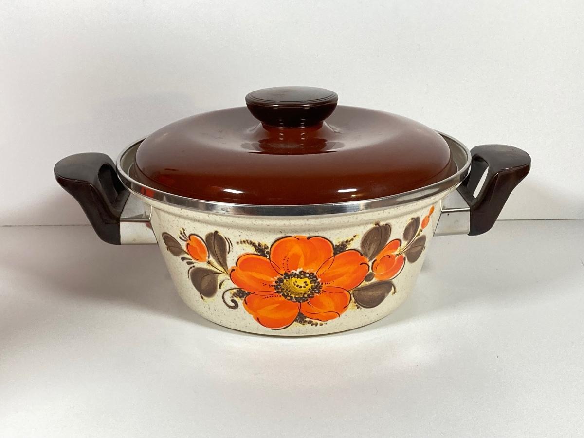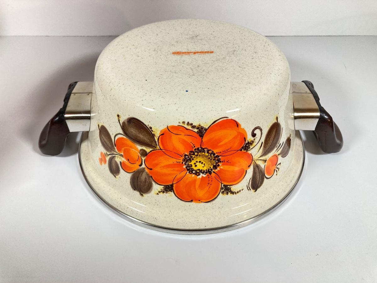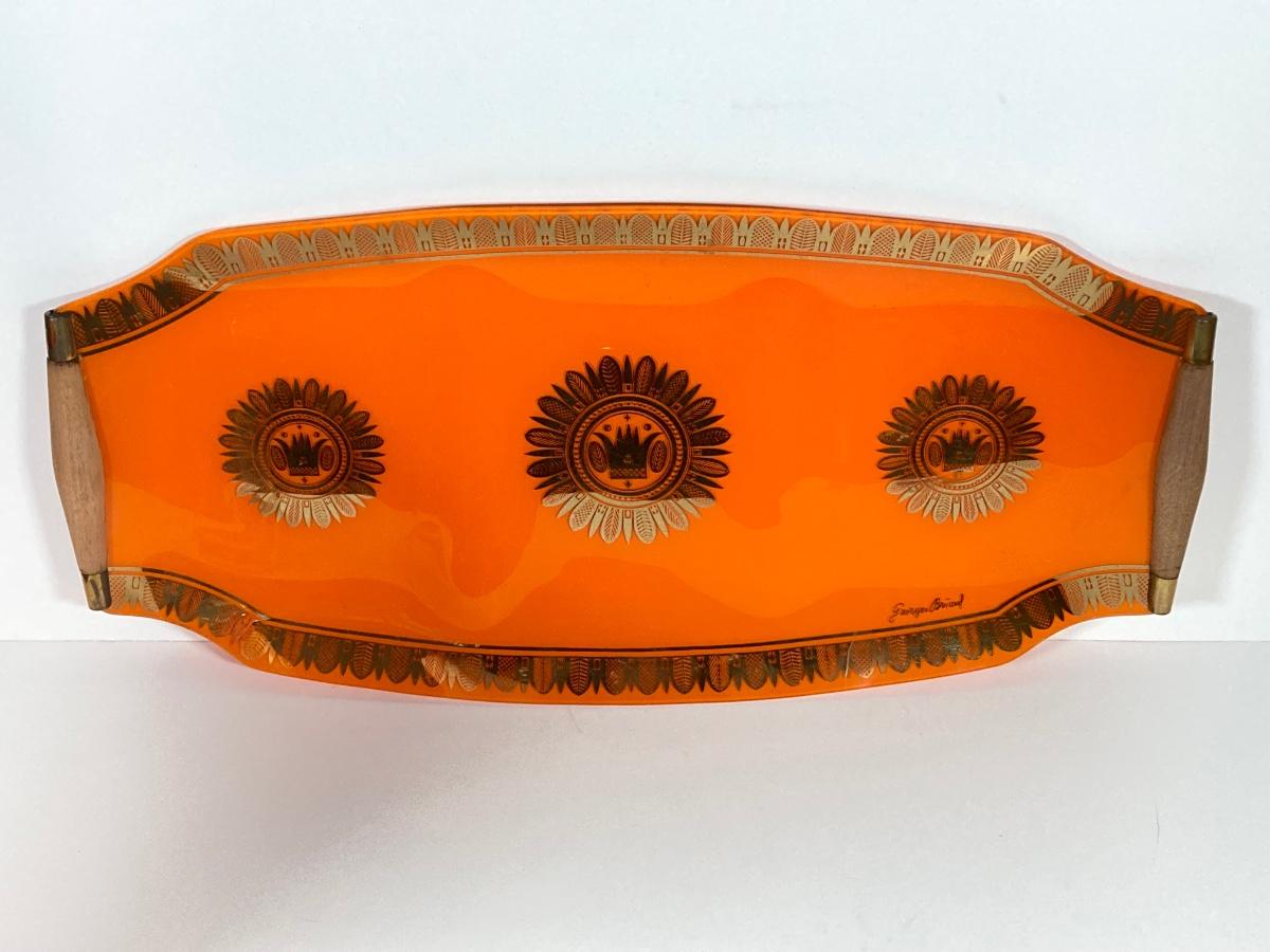 LOT 231: Mid-Century Modern Kitchen Collection - Serving Tray, Sanko-Ware Show Pan, Painted Trivet, Ikea Plastic Drinking Cups