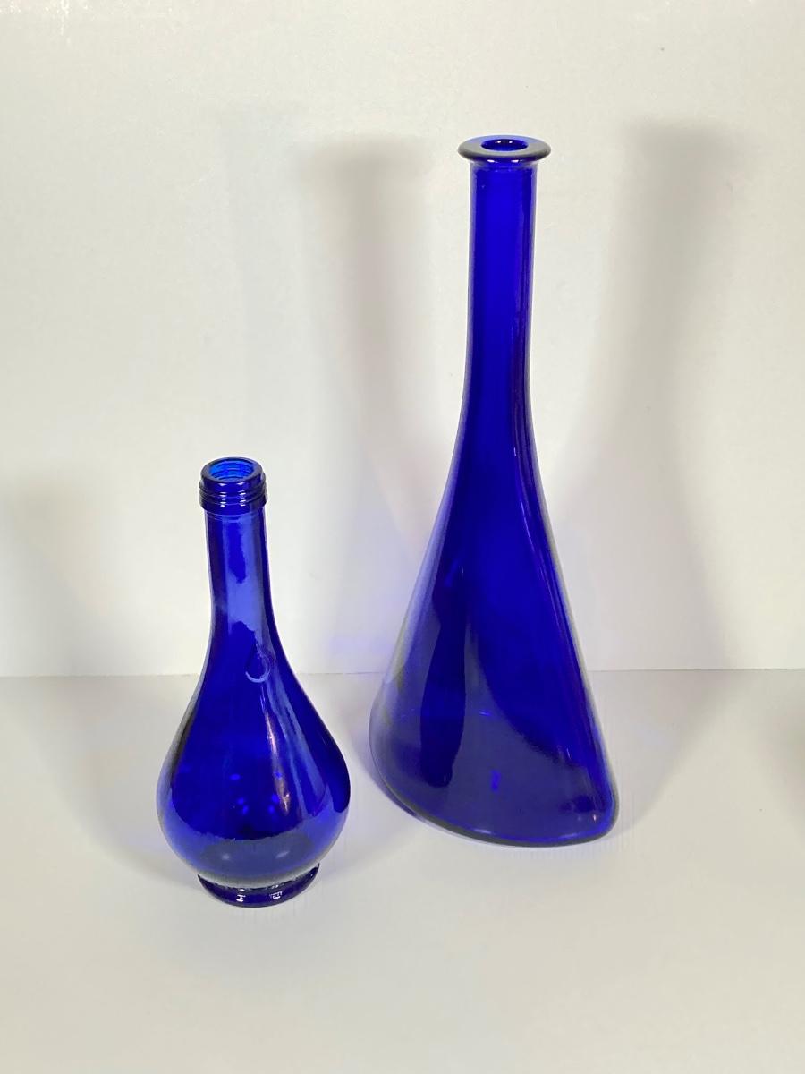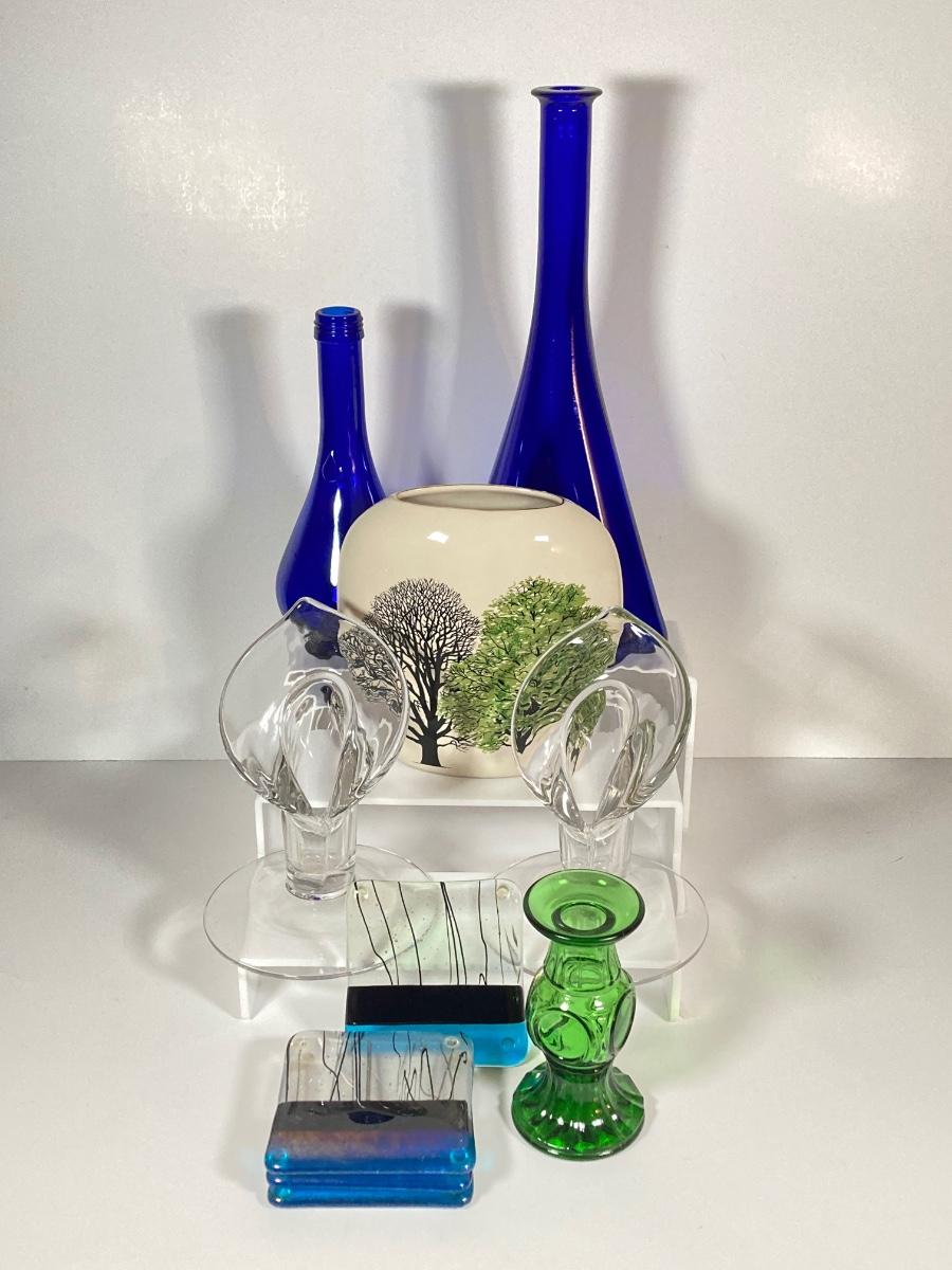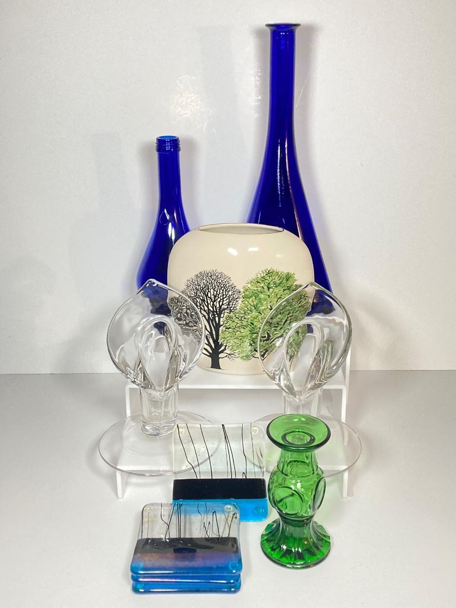 LOT 234: Decorative Collection - Cobalt Blue Bottles (Italy Acqua della Madonna), Calla Lily Candle Holders, Glass Coasters and More