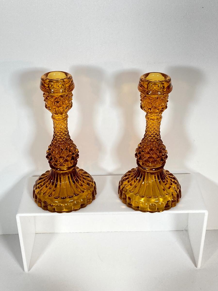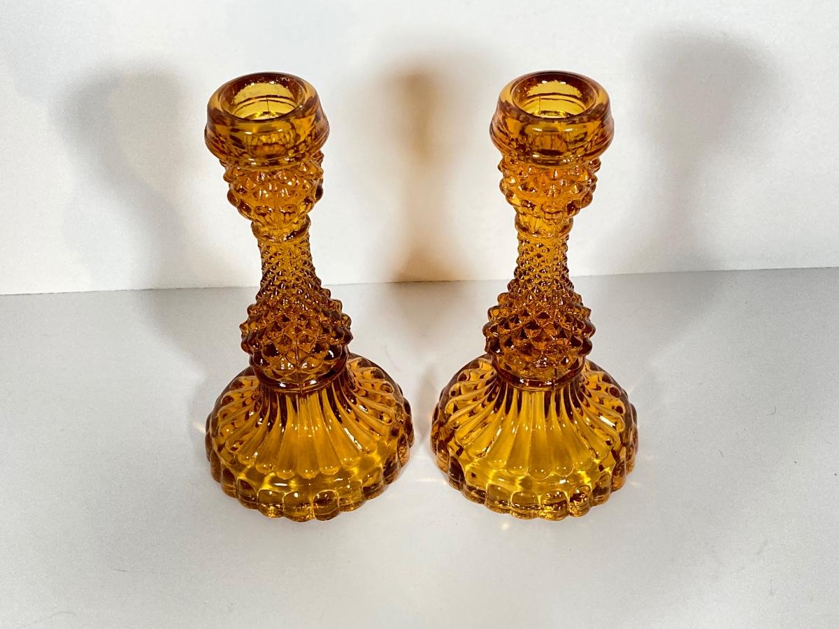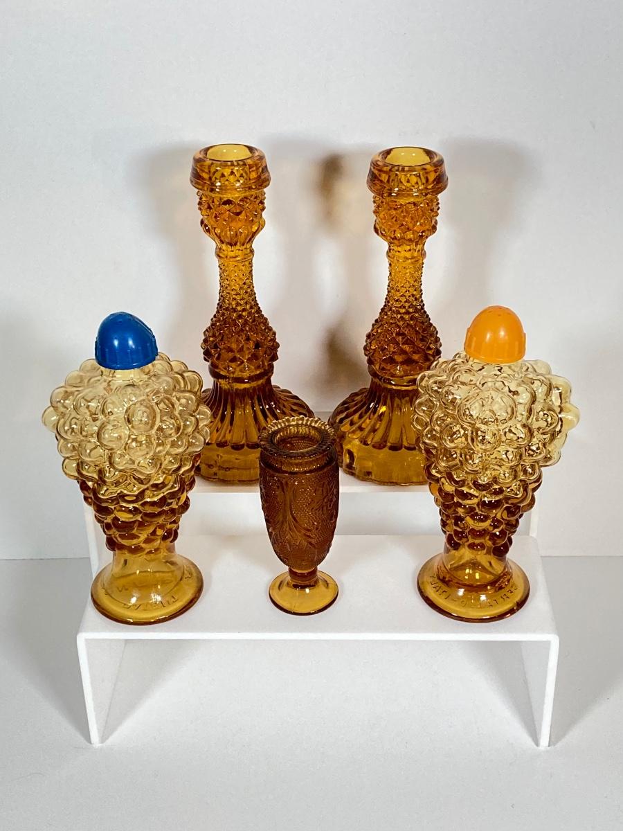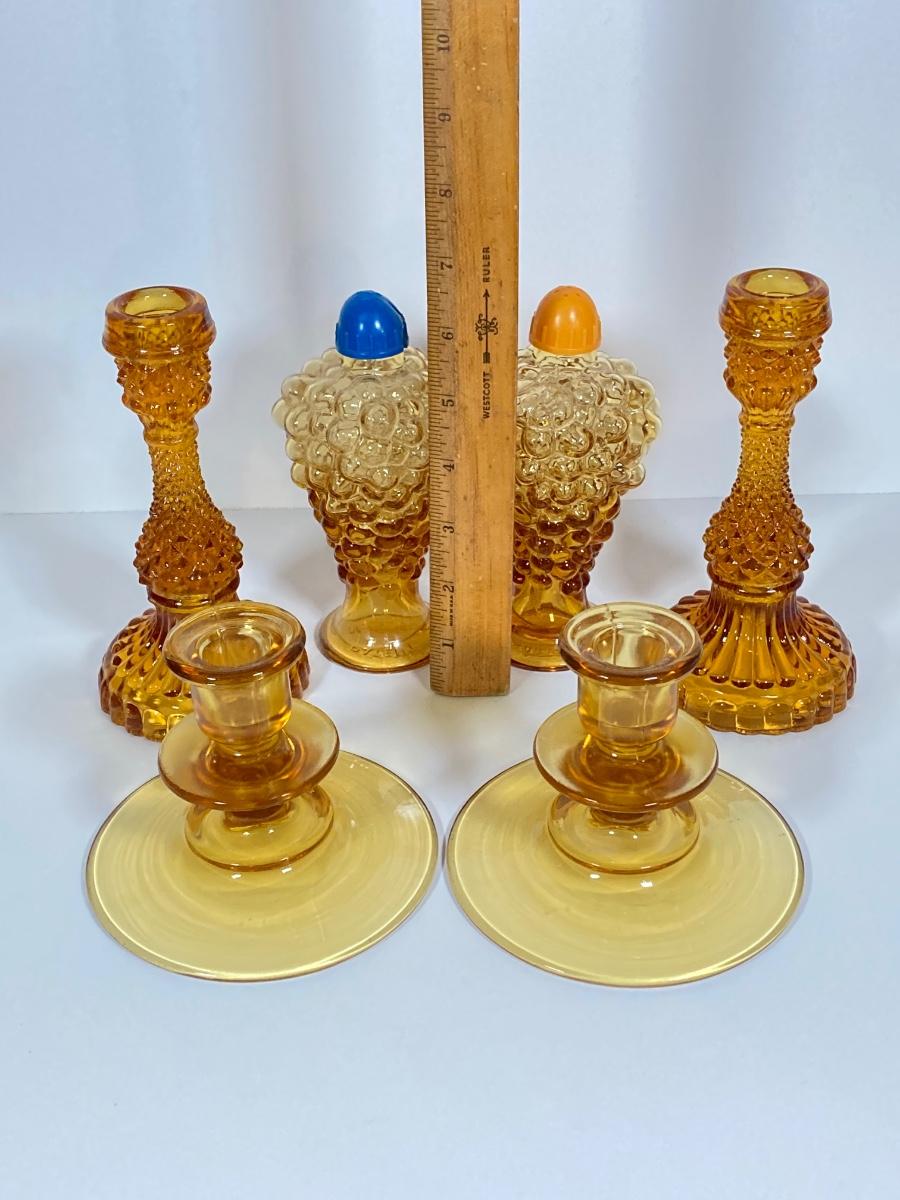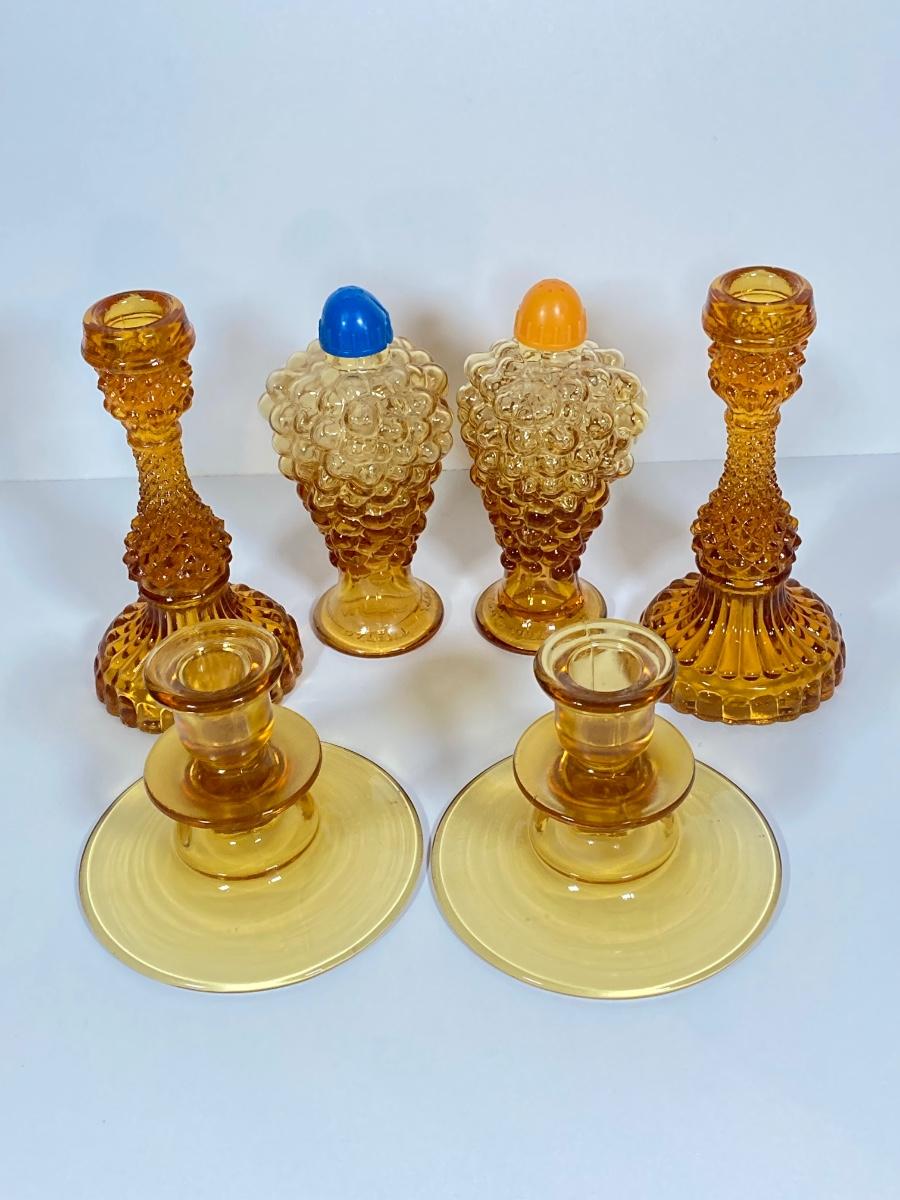 LOT 236: Amber Glass Collection - Candlestick Holders, MCM Ngori Italy Glass Grapes Salt & Pepper Shakers, Round Cut Glass Serving Plate and More