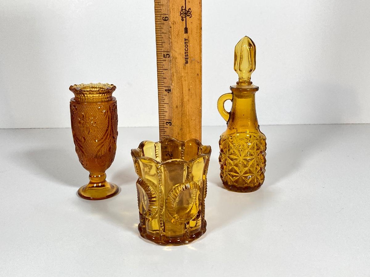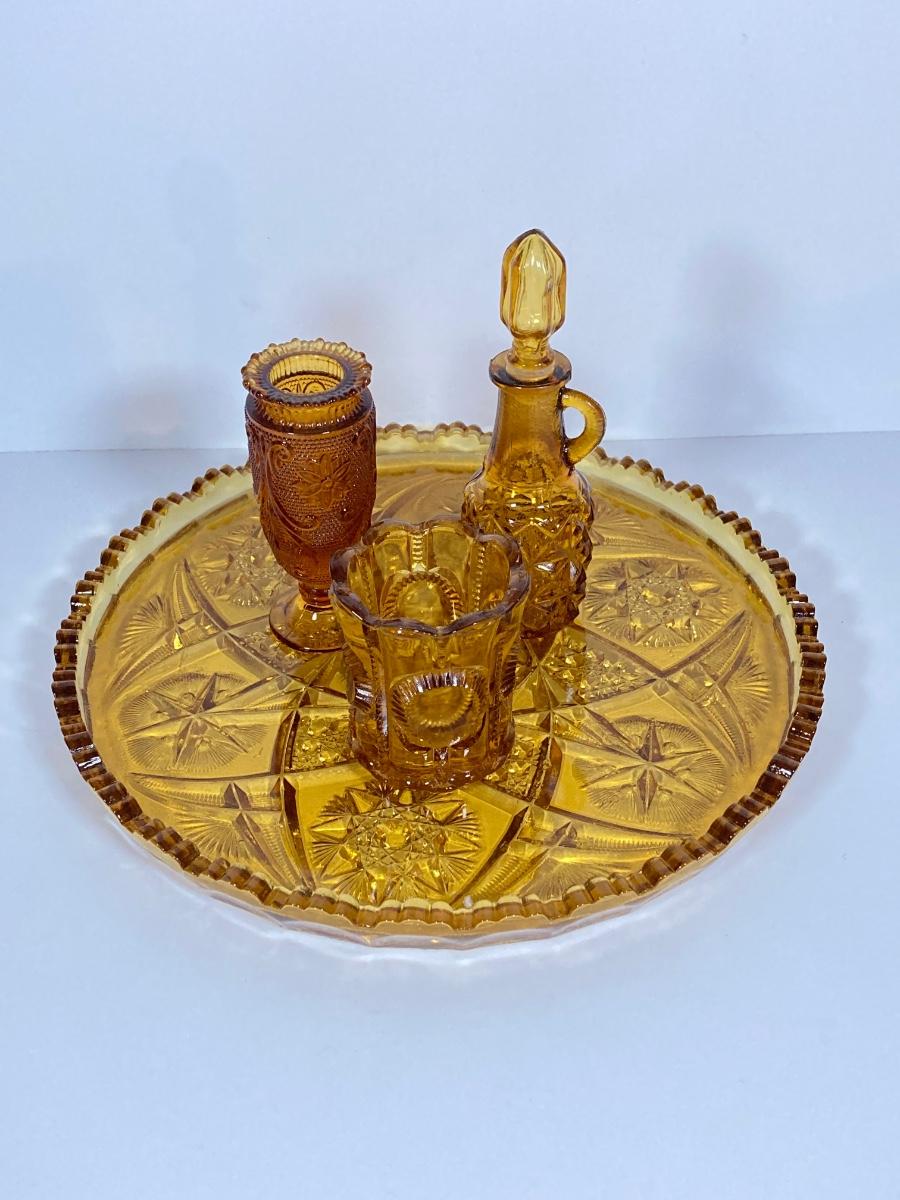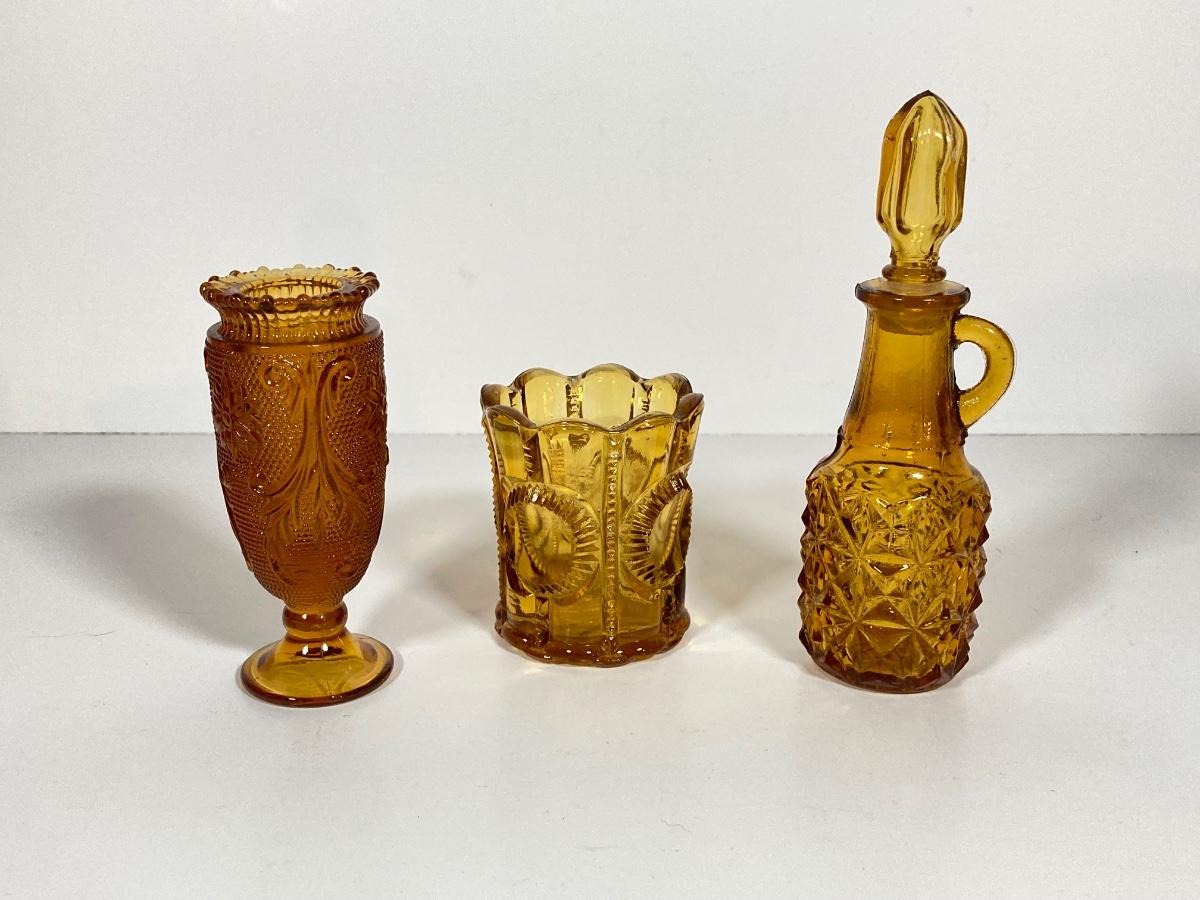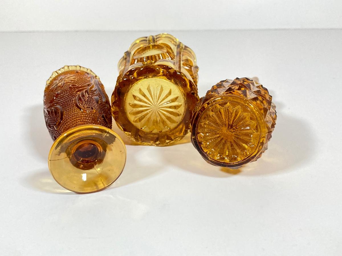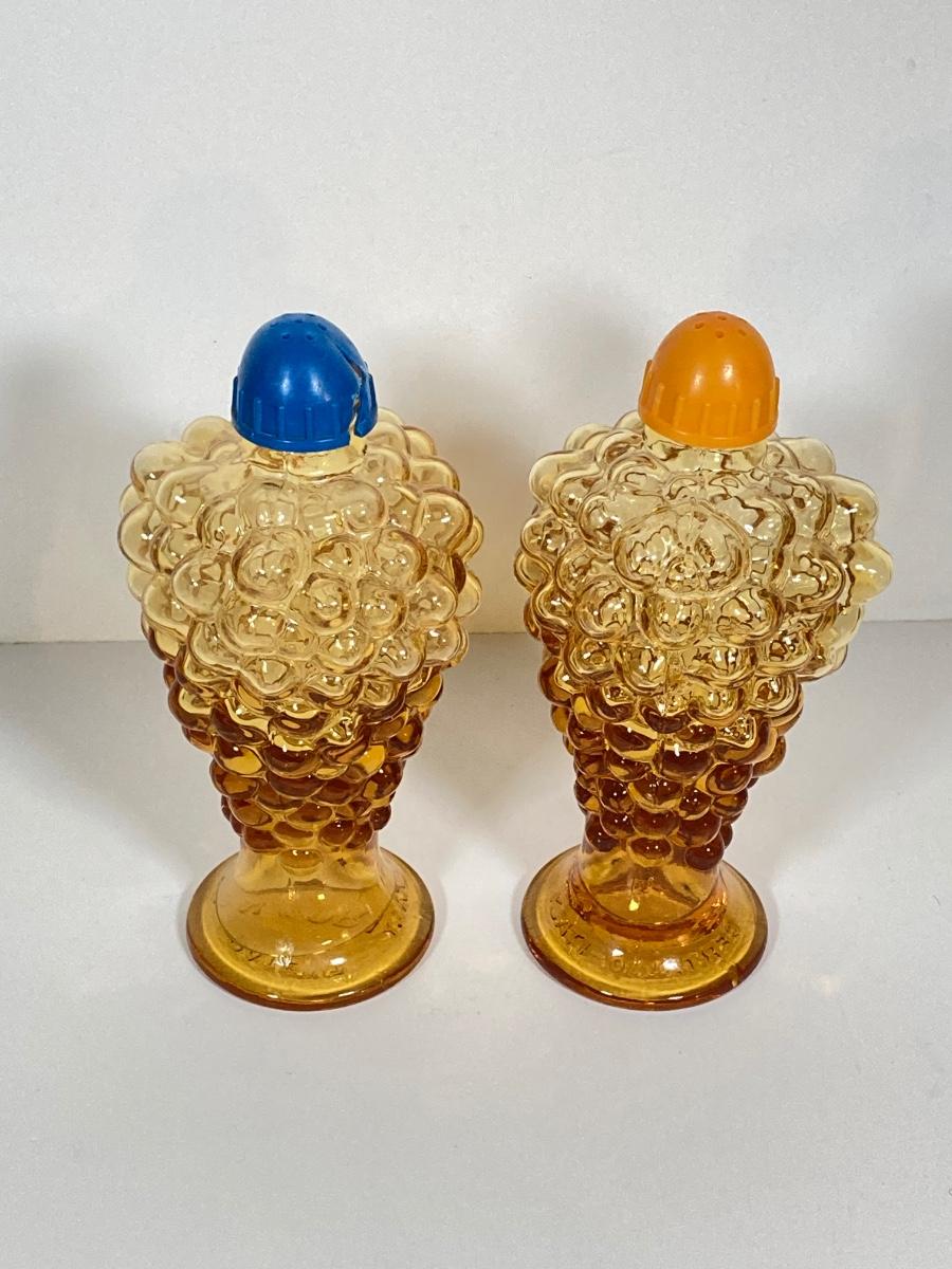 LOT 236: Amber Glass Collection - Candlestick Holders, MCM Ngori Italy Glass Grapes Salt & Pepper Shakers, Round Cut Glass Serving Plate and More