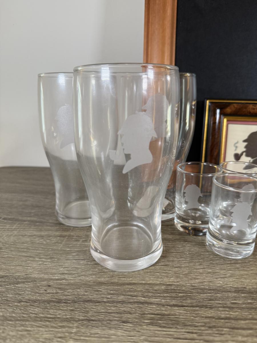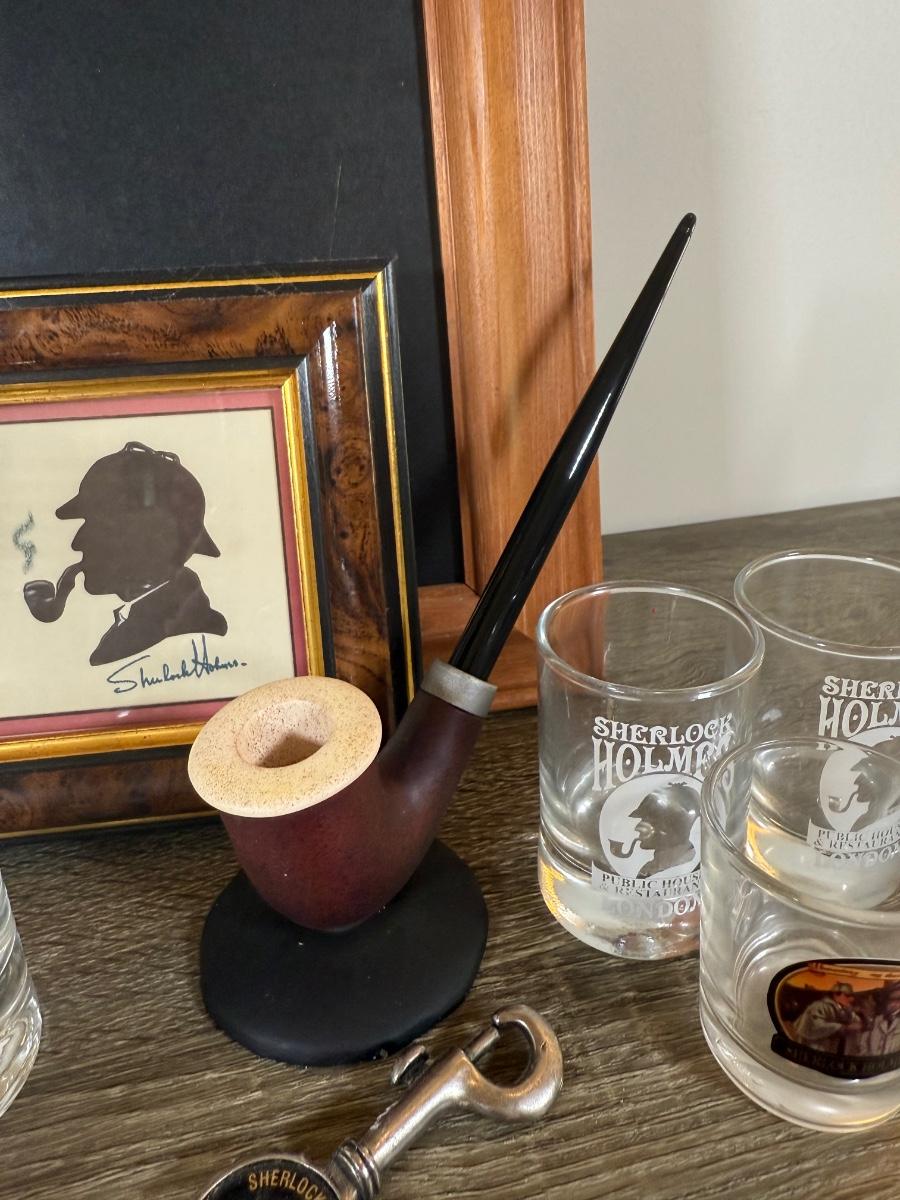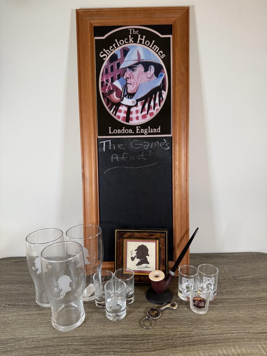 LOT 109L: Sherlock Holmes Collection - Chalkboard Sign, Beer & Shot Glasses, Pipe Pen Holder Desk Set & More