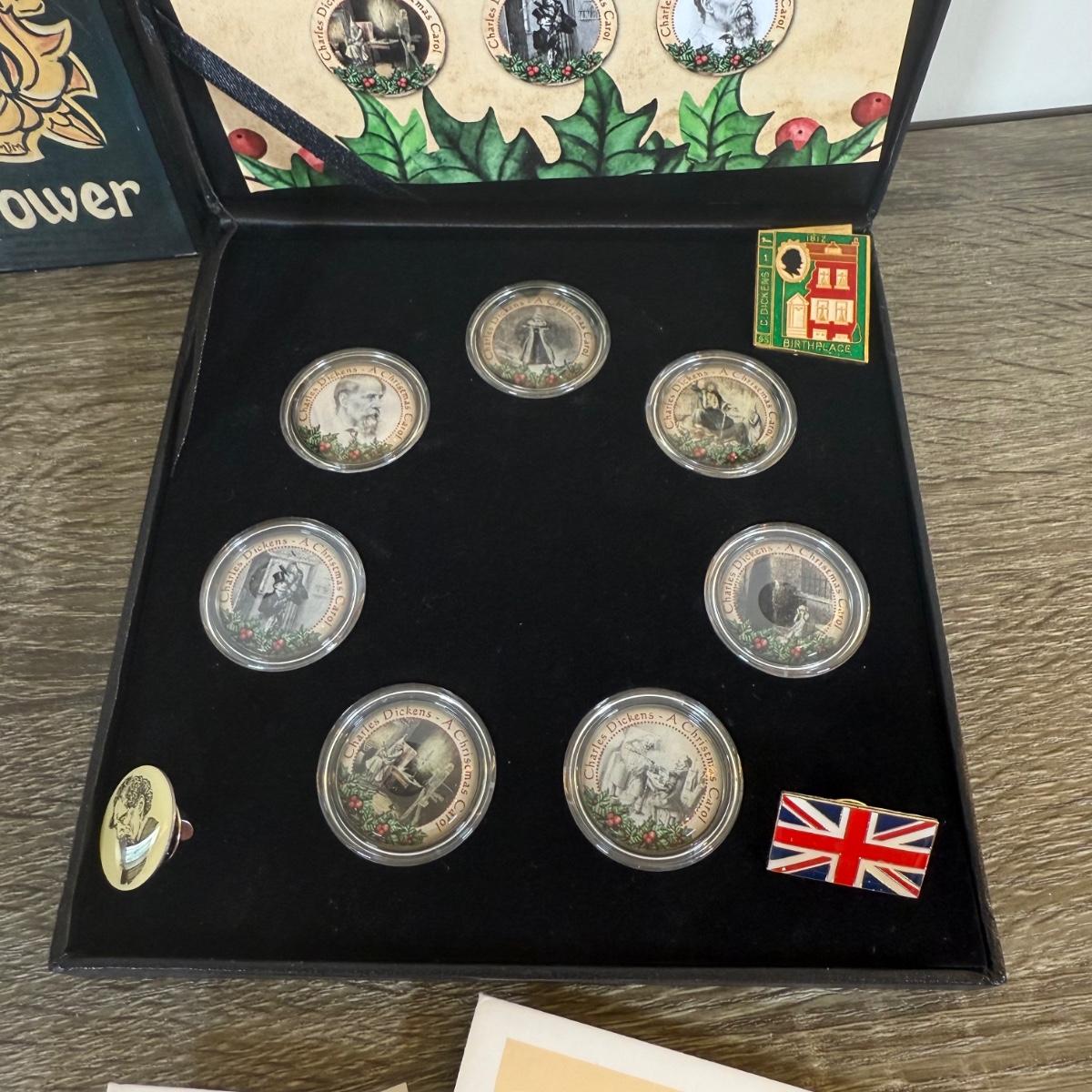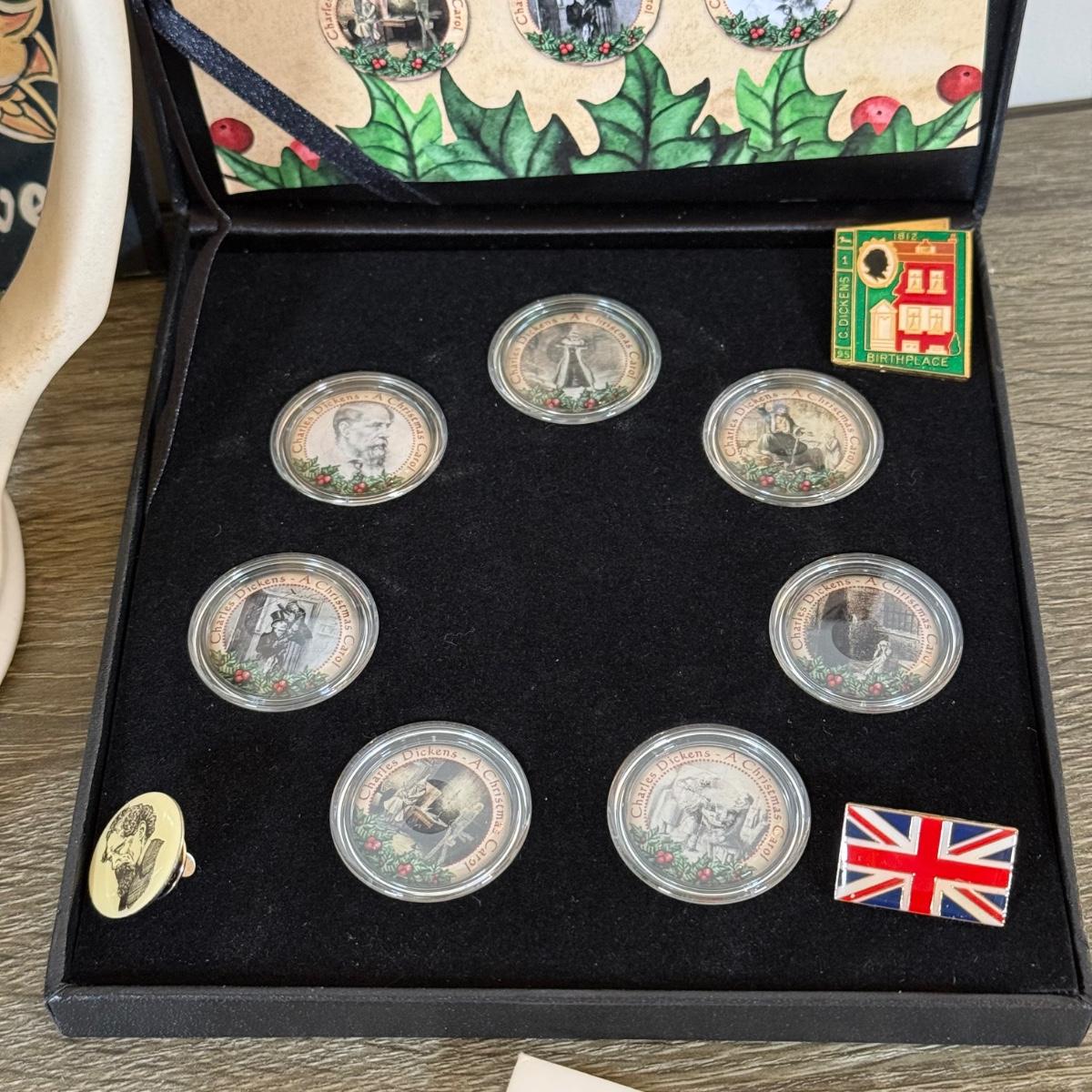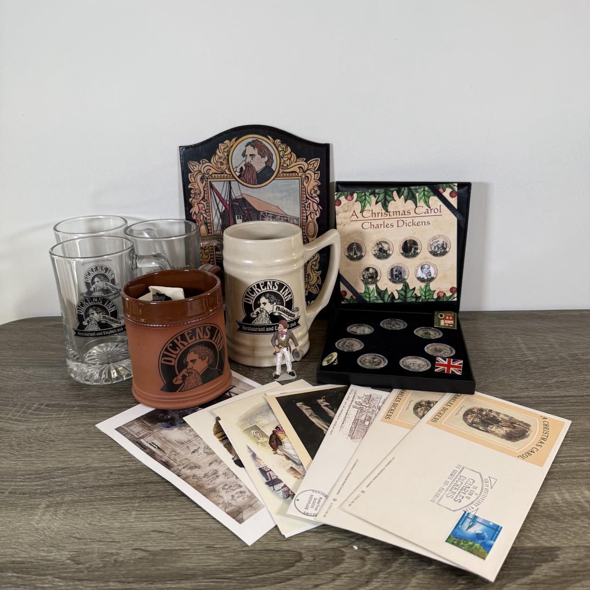 LOT 110L: Charles Dickens A Christmas Carol Coins, Postcards & Dickens Inn Souvenir Mugs