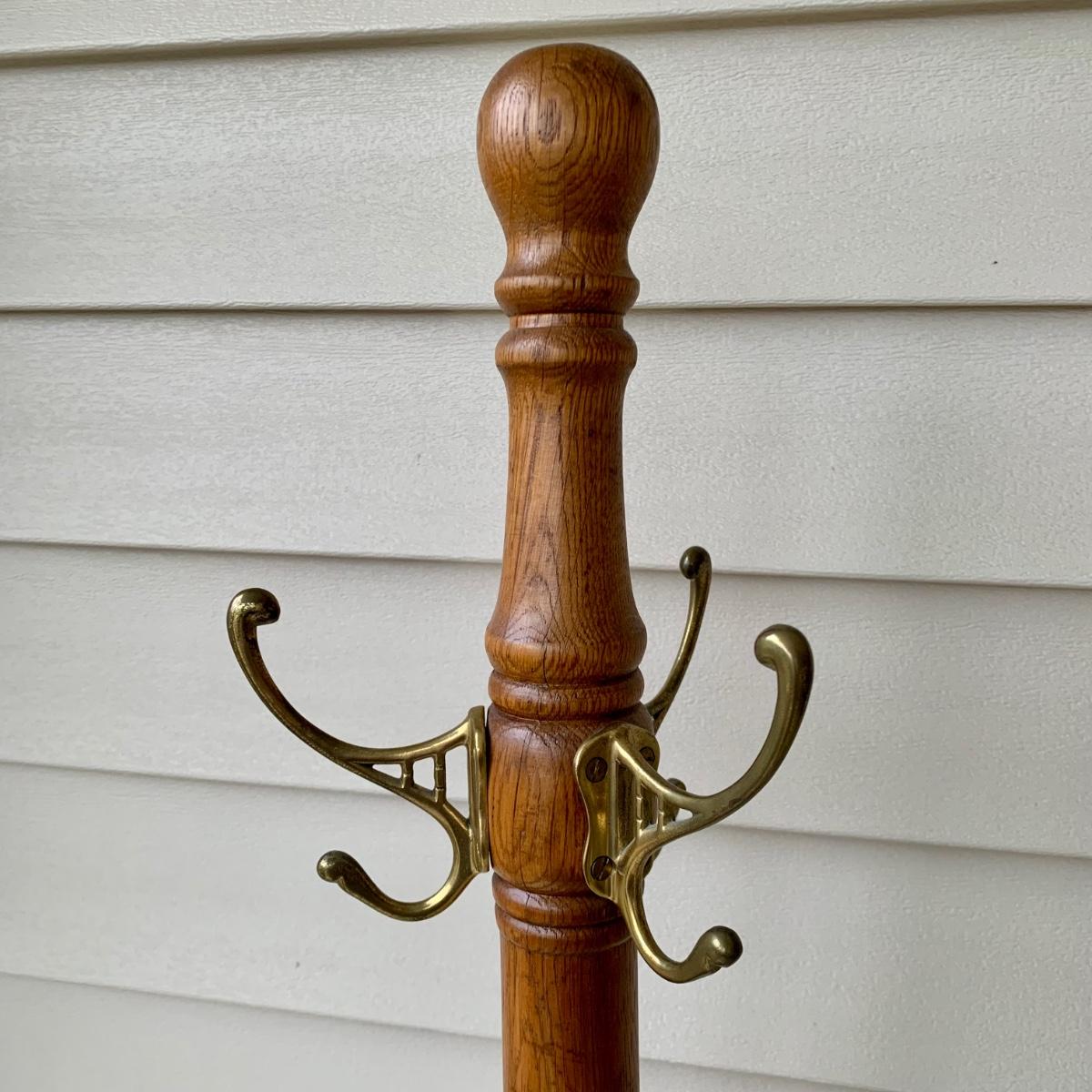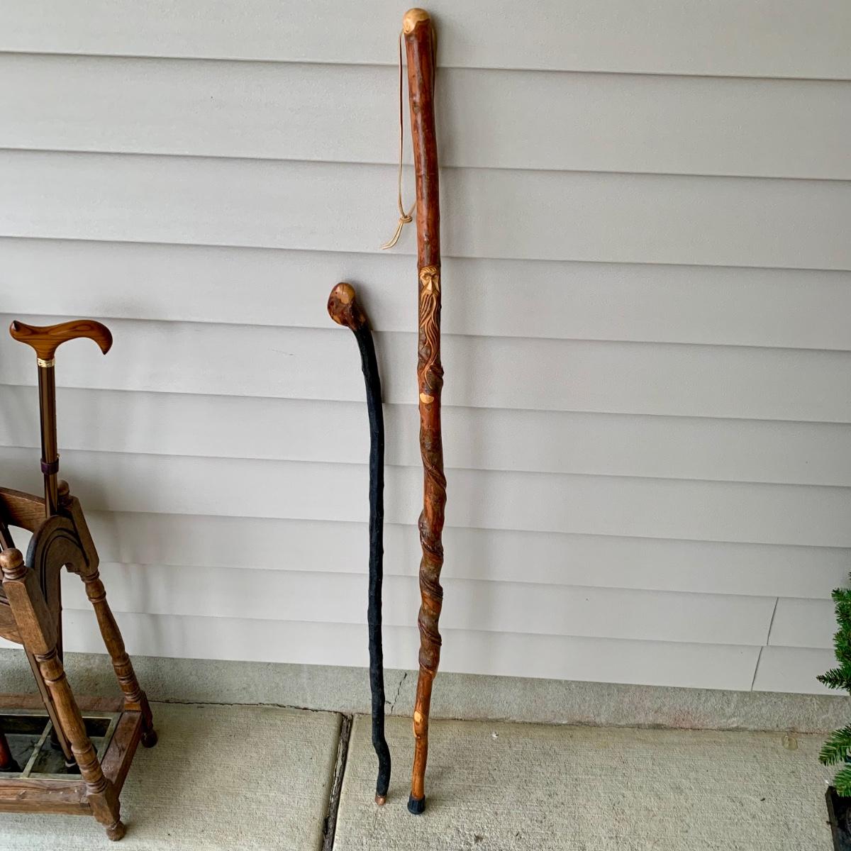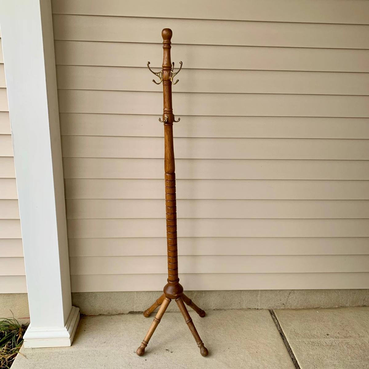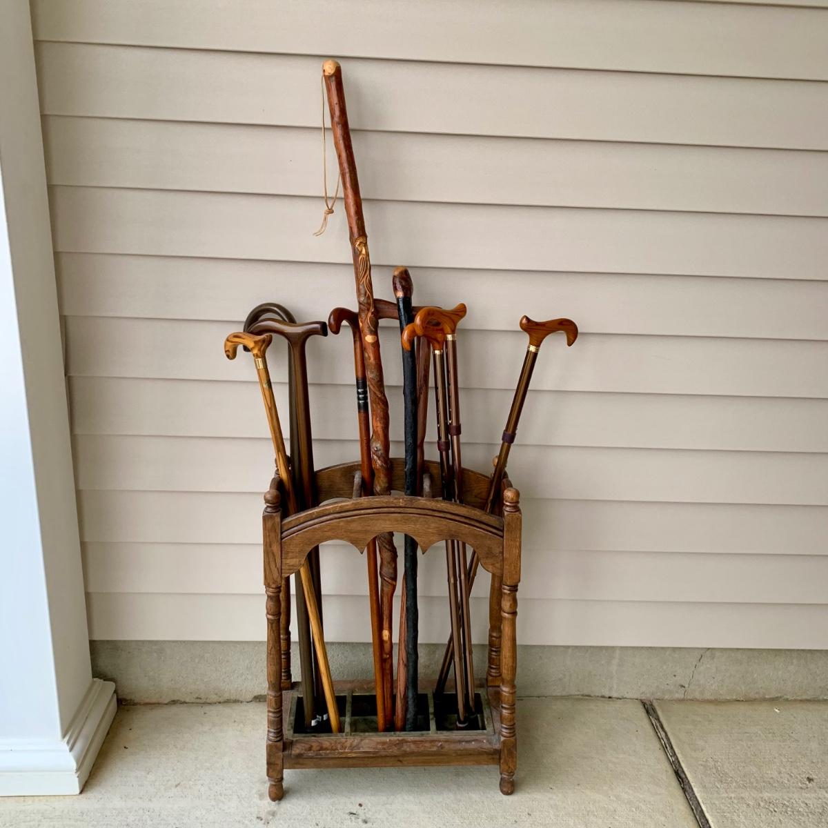 LOT 162 G: Wooden Coat Rack, Oak Umbrella Stand, & Collection of Walking Sticks & Canes (Wood & Aluminum)