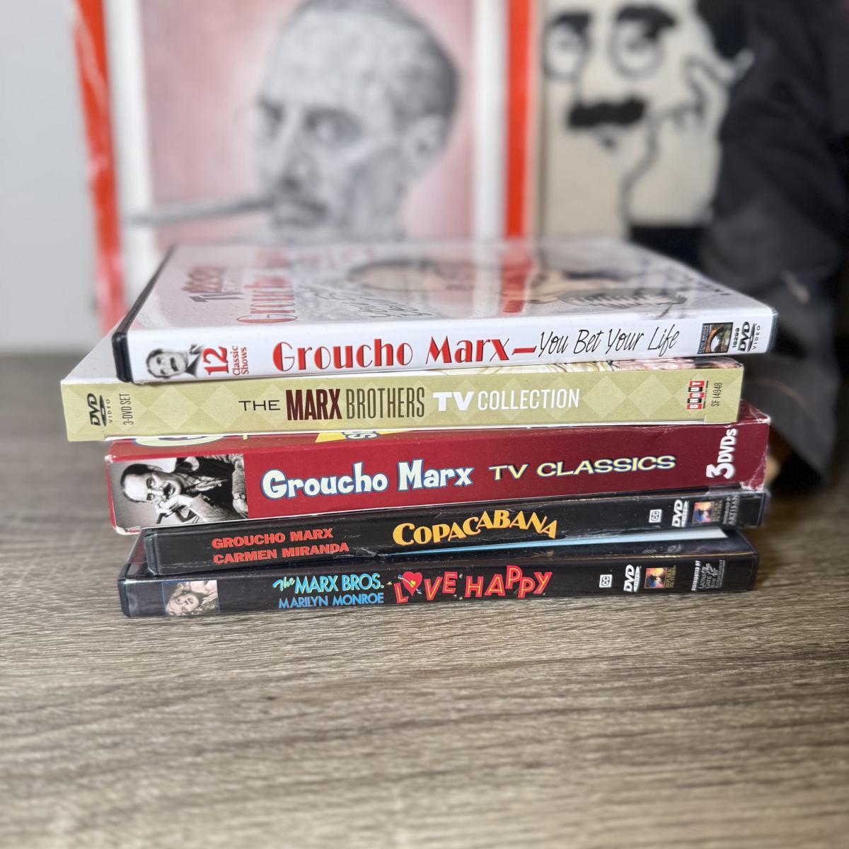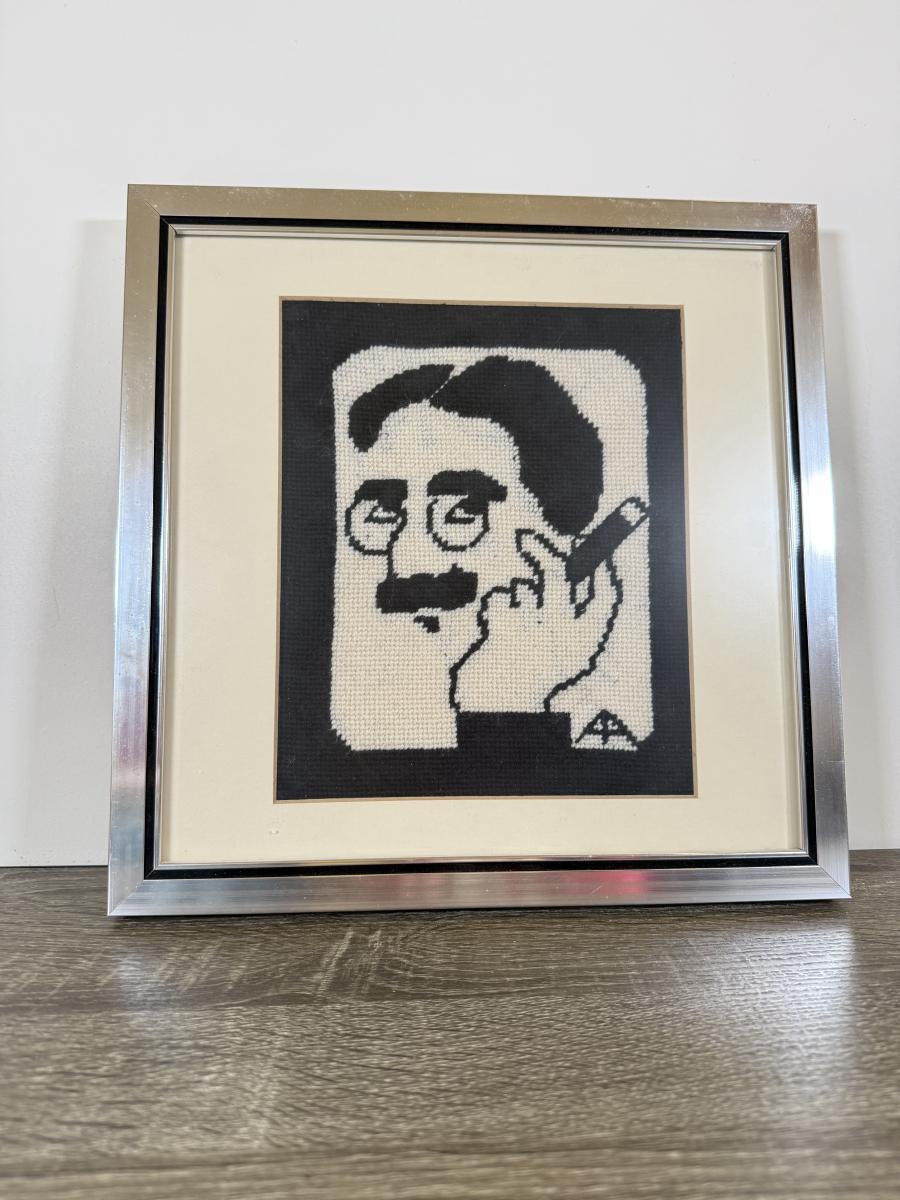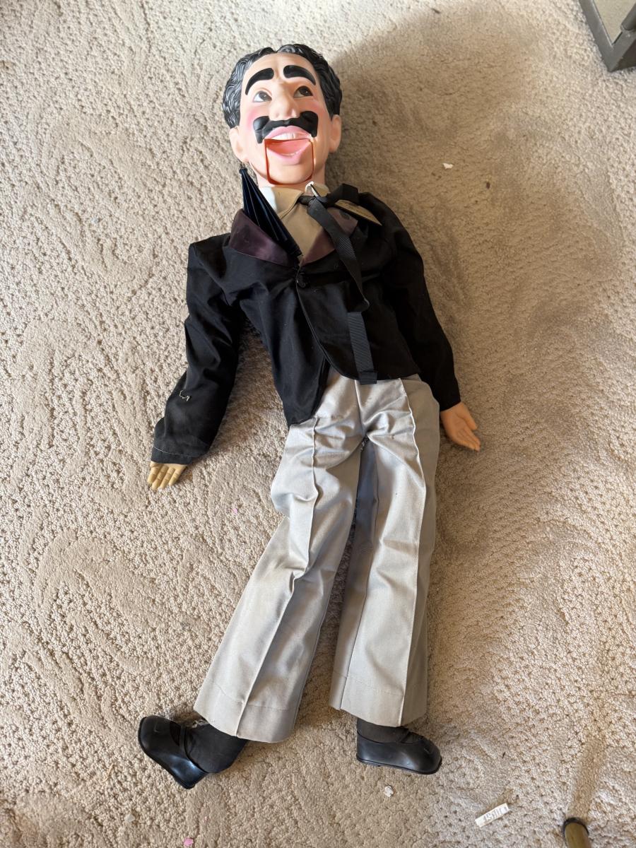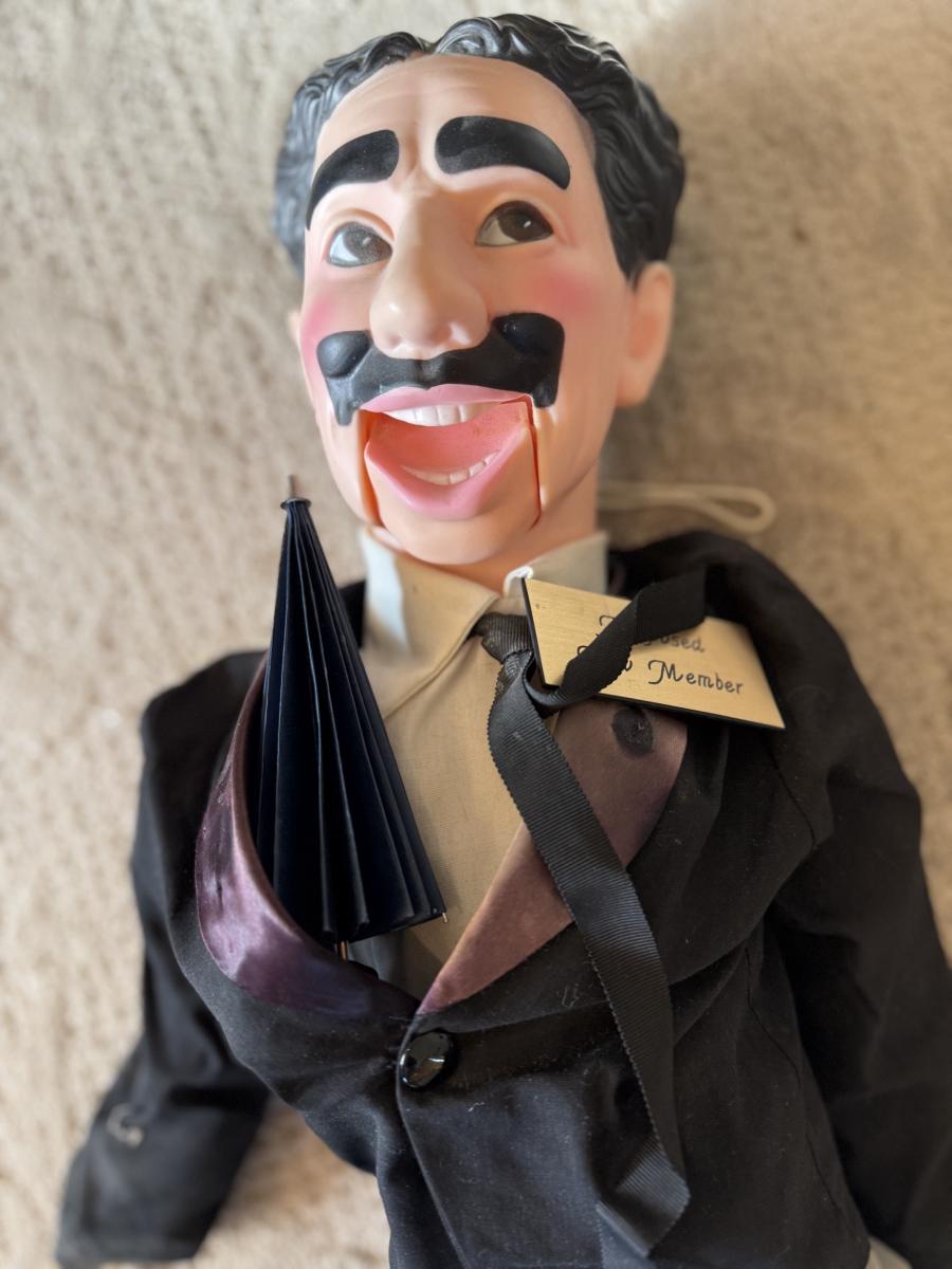 LOT 240L: Groucho Marx 27" Pull String Ventriloquist Dummy Doll w/ Needlepoint Marx Portrait, DVDs & Time Magazine