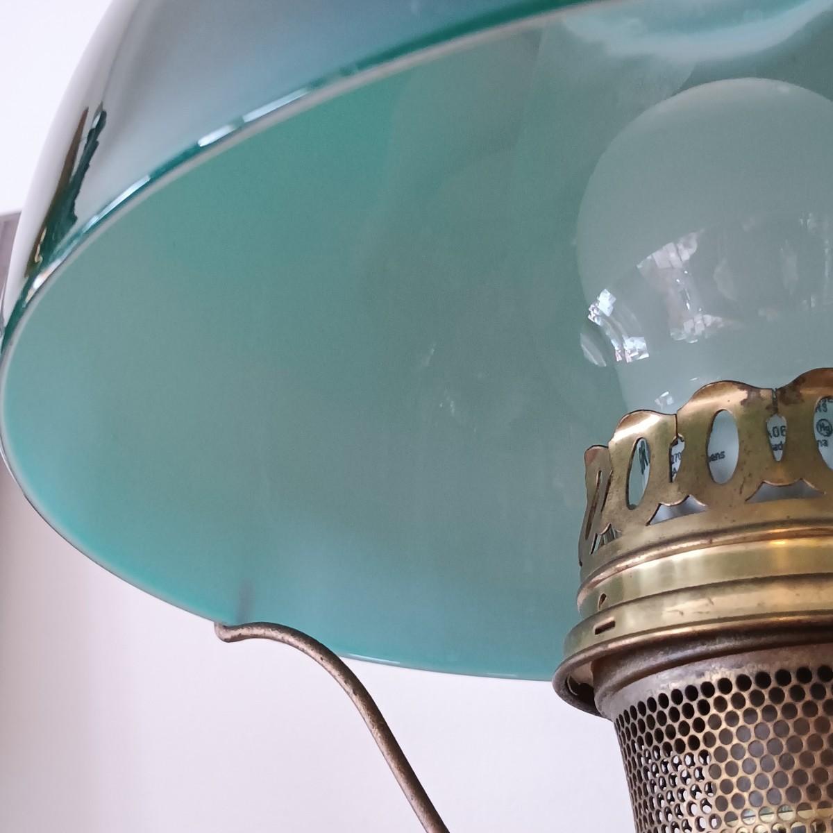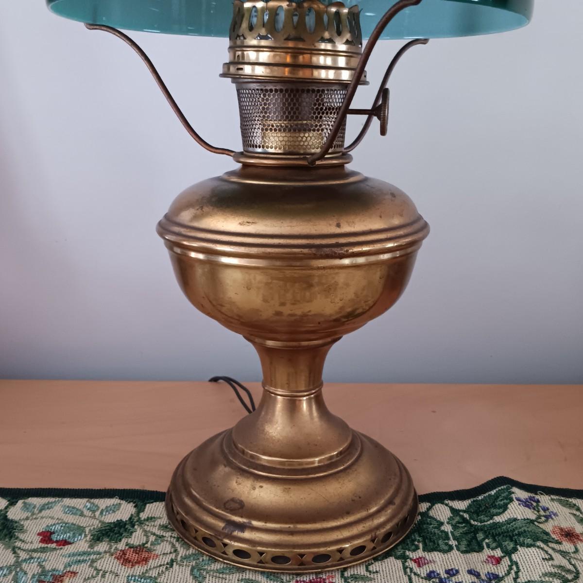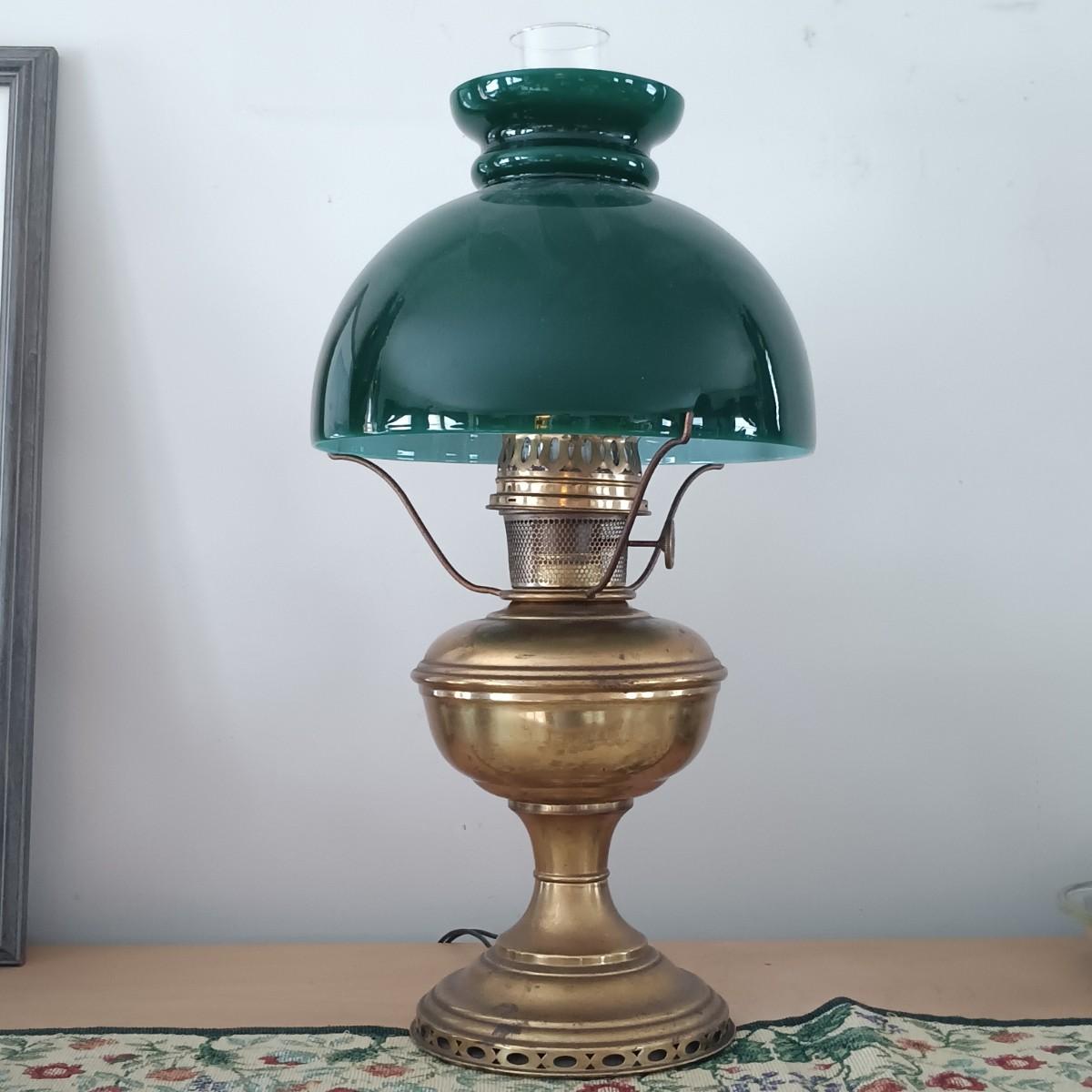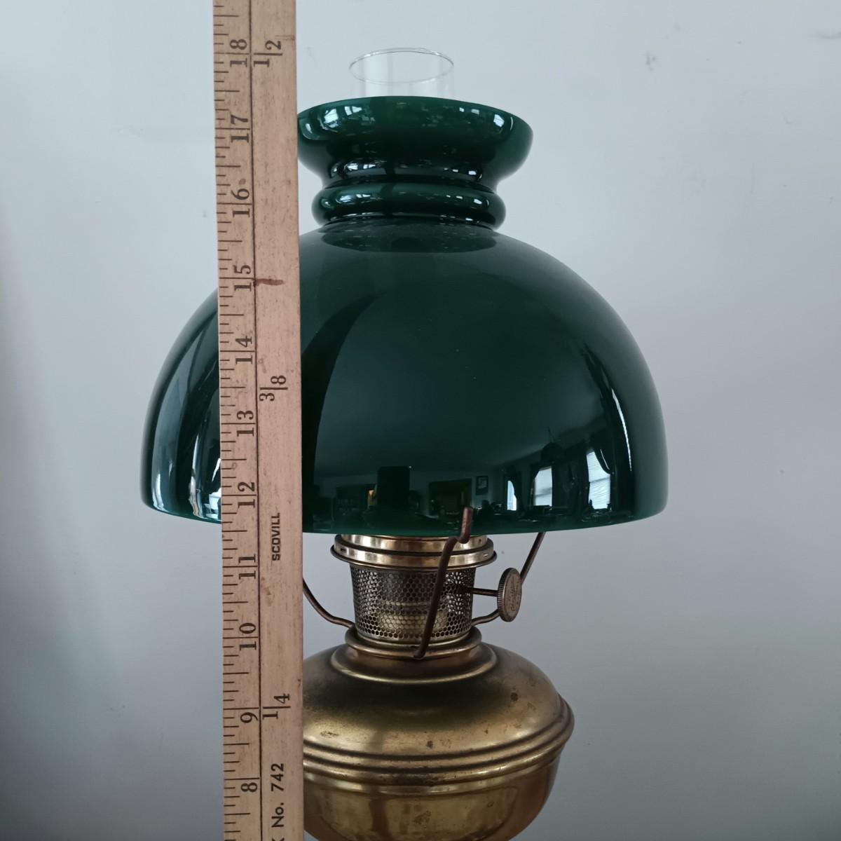 LOT 23: Antique Brass Oil Lamp w/ Green Glass Shade (Electrified)