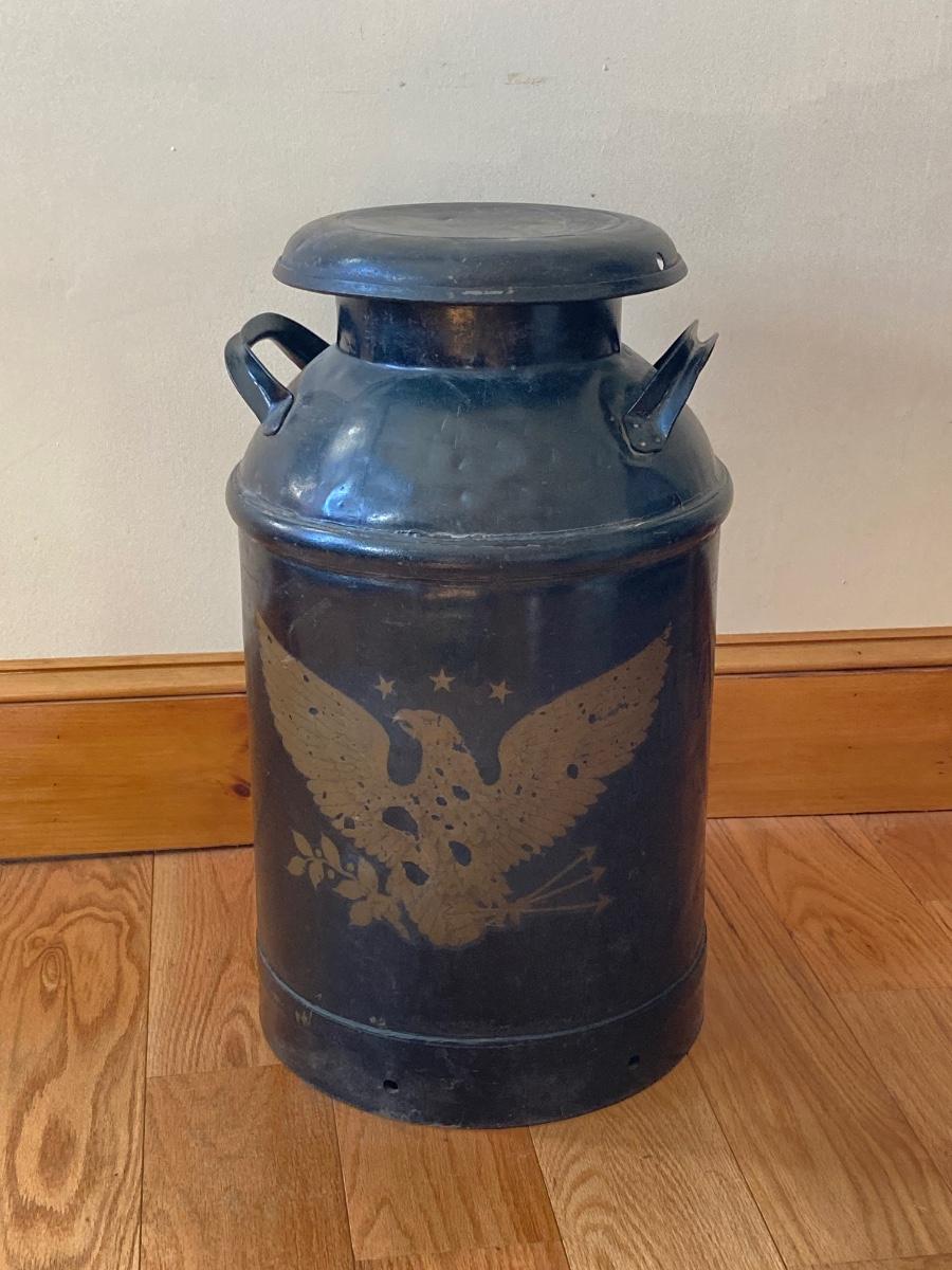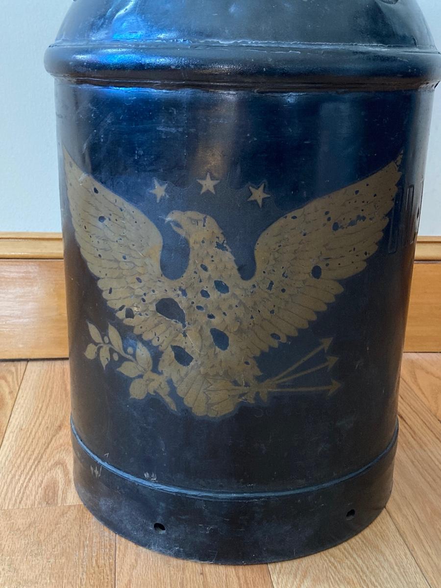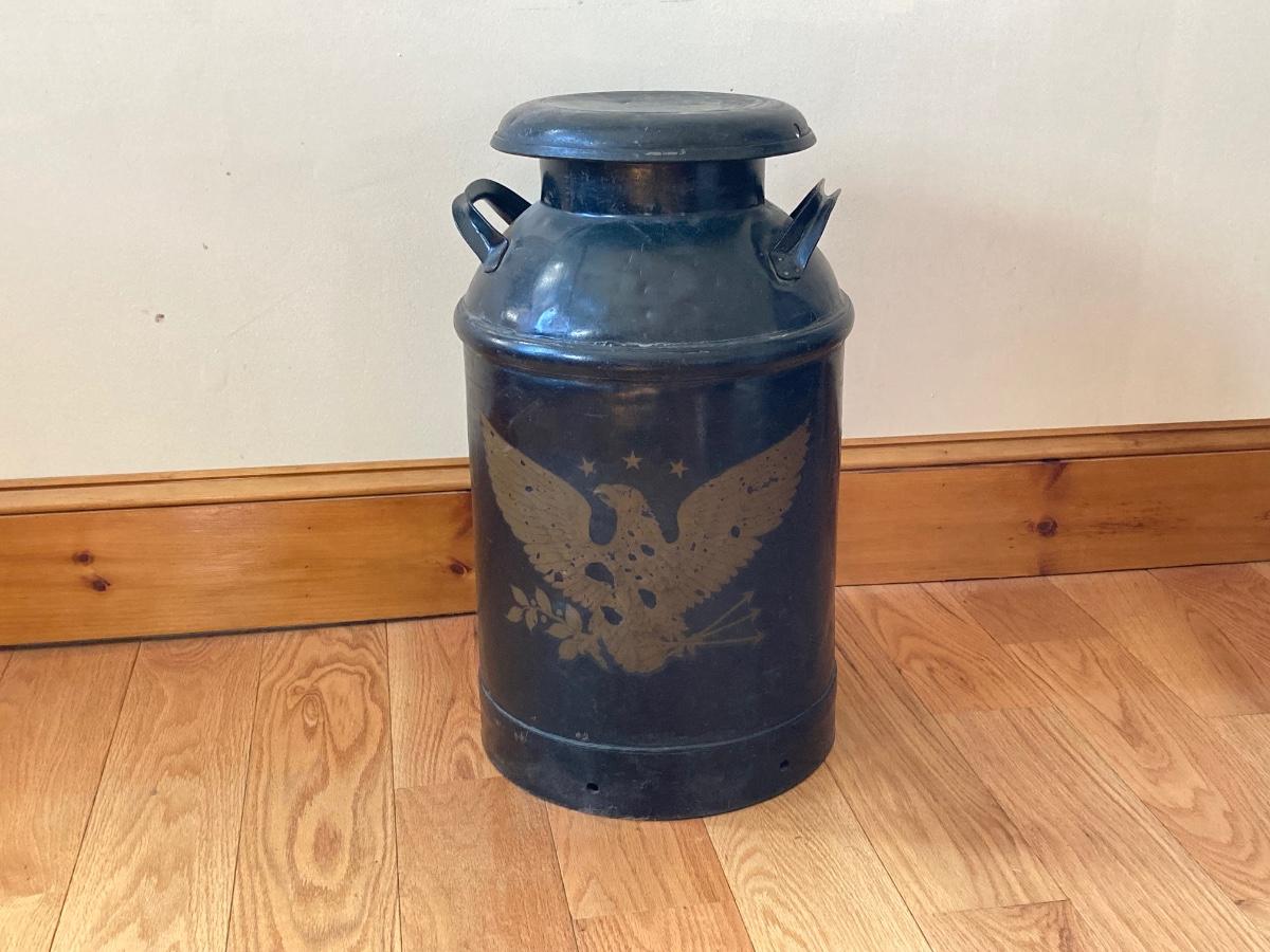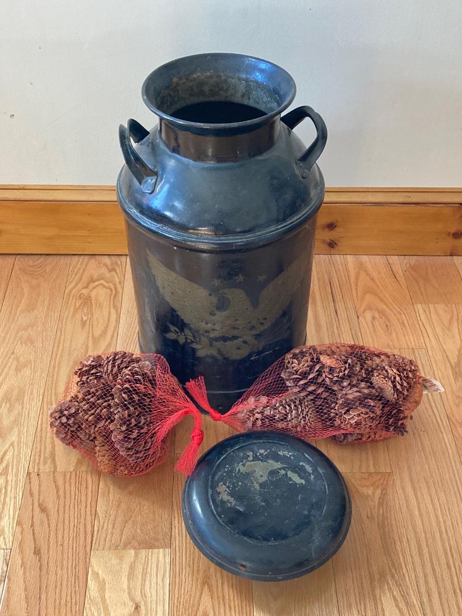 LOT 29: Vintage Early American Eagle Metal Milk / Dairy Container filled with Pine Cones