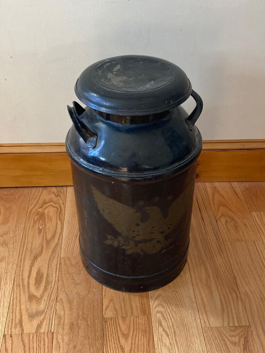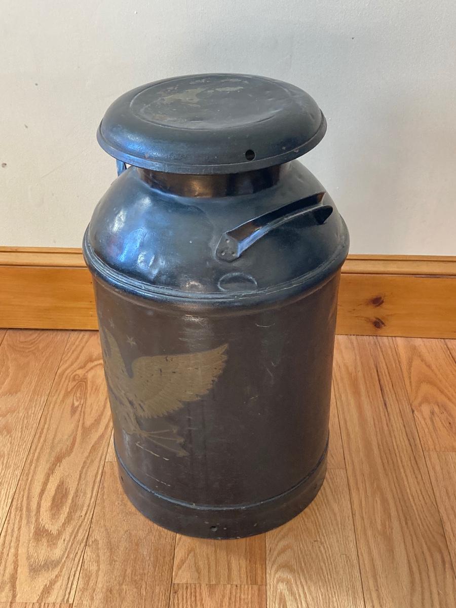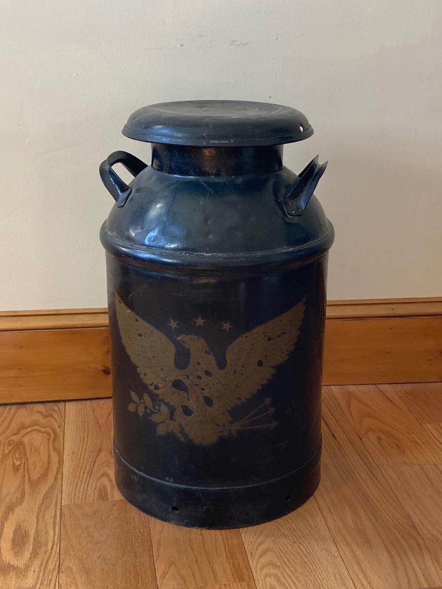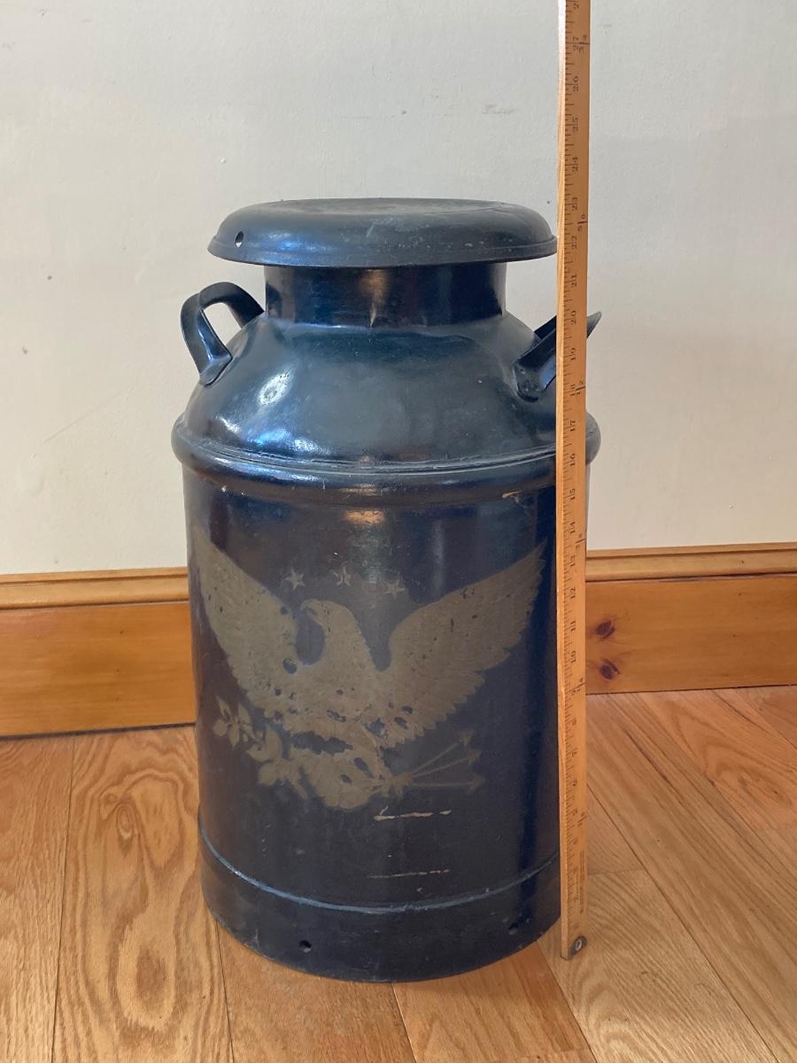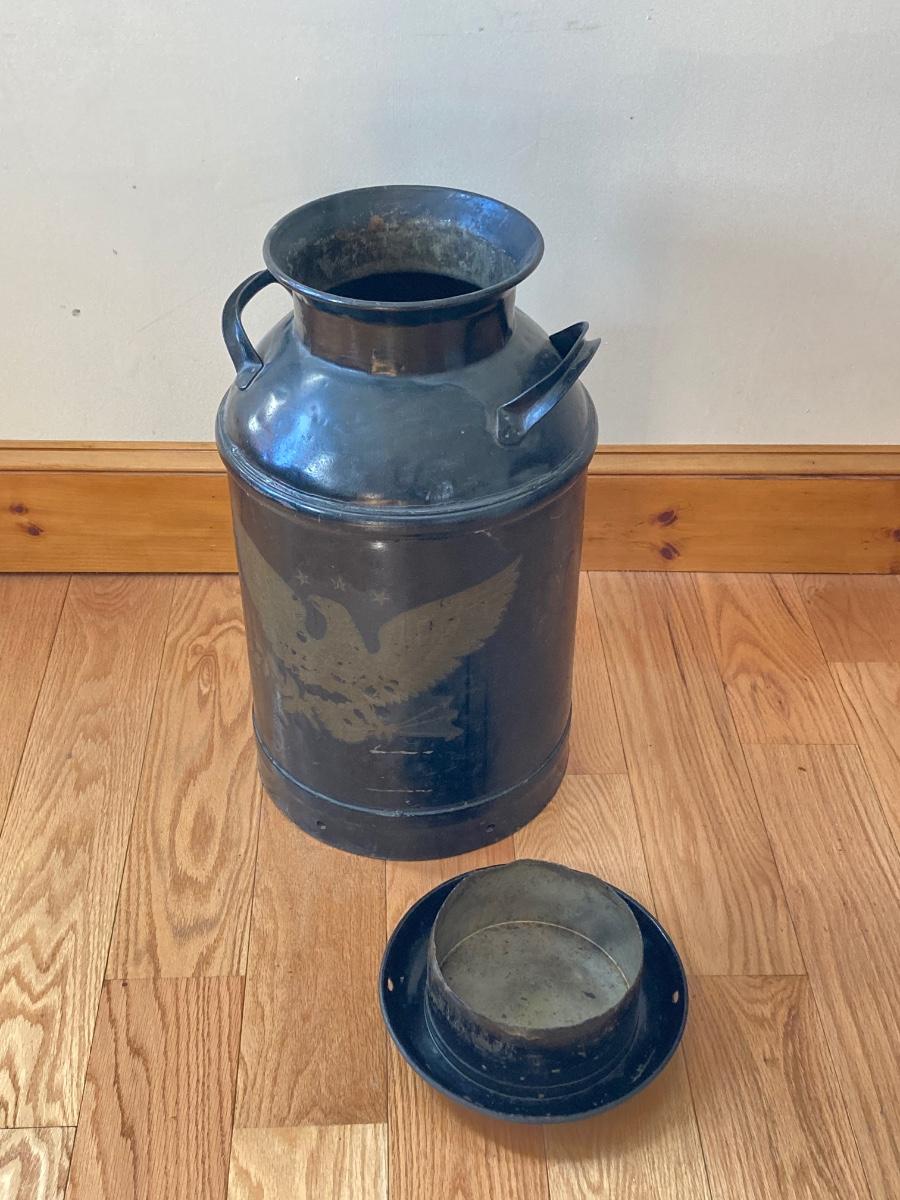 LOT 29: Vintage Early American Eagle Metal Milk / Dairy Container filled with Pine Cones