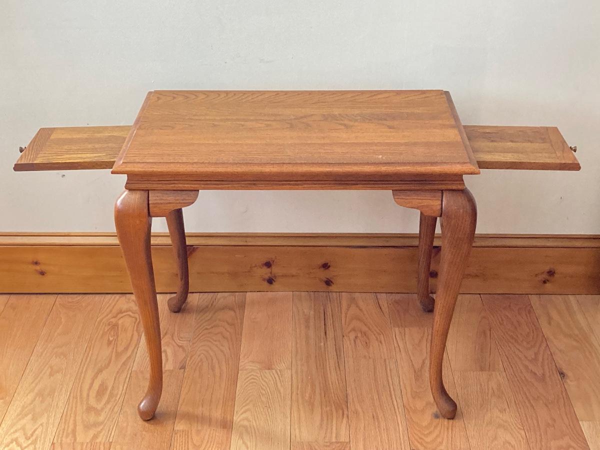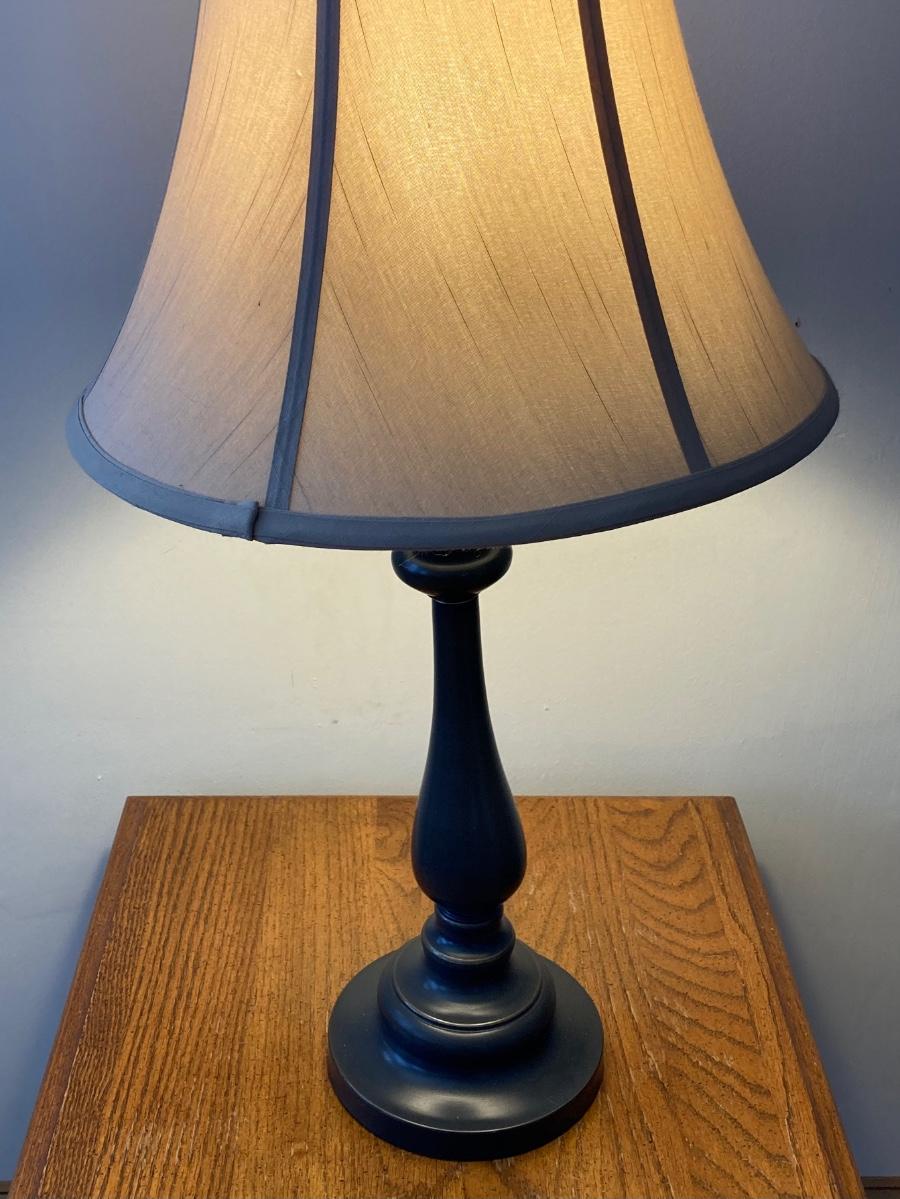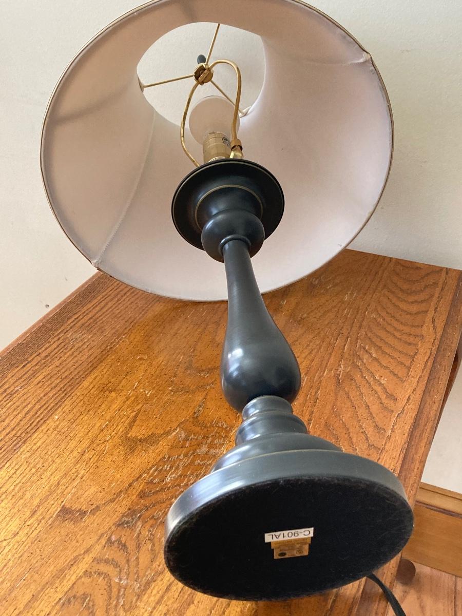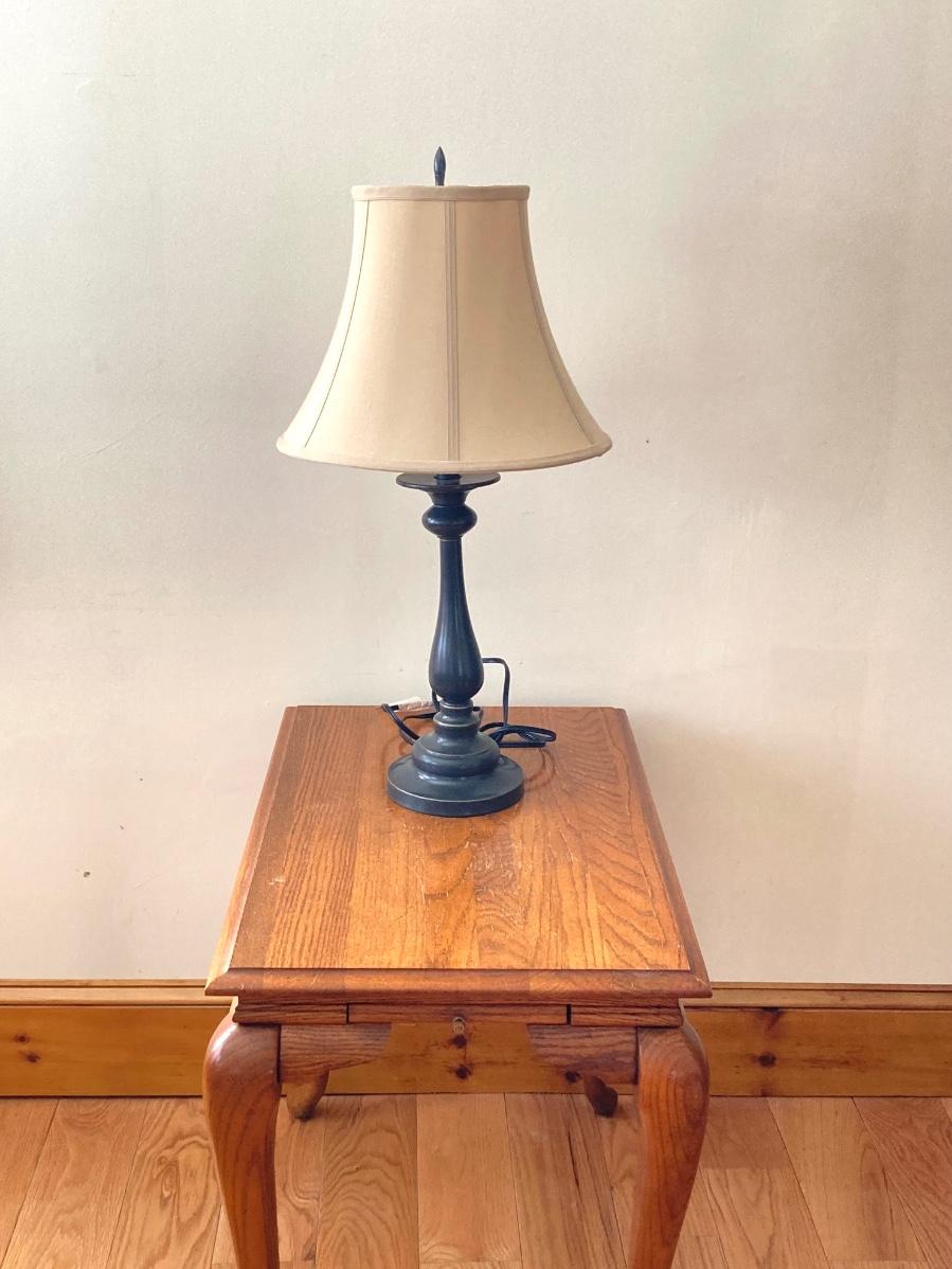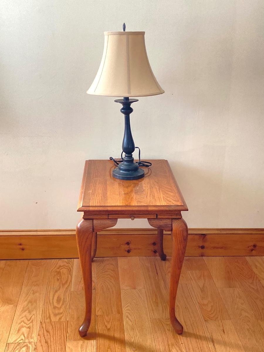 LOT 32: Wooden Side Table with Slide Out Trays (Made in USA) and Metal Table Lamp