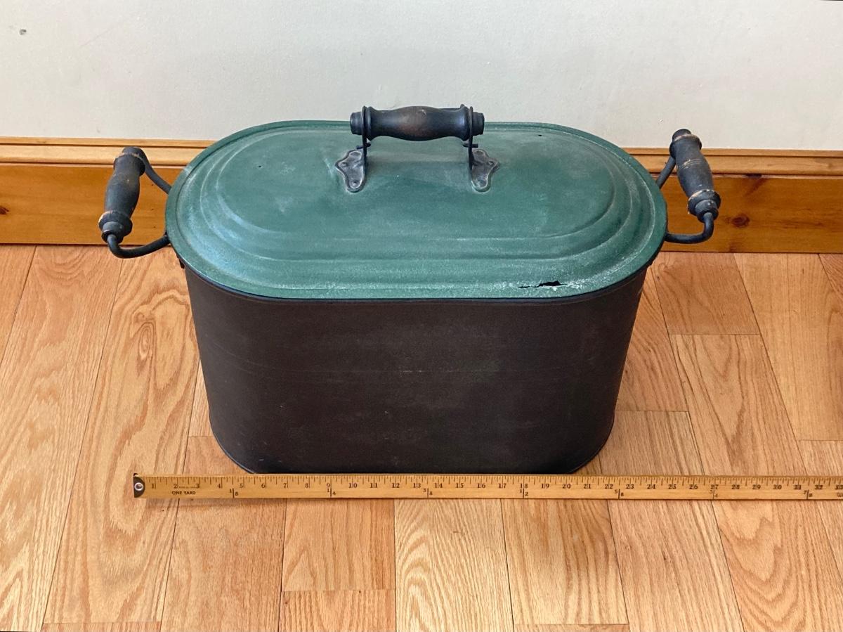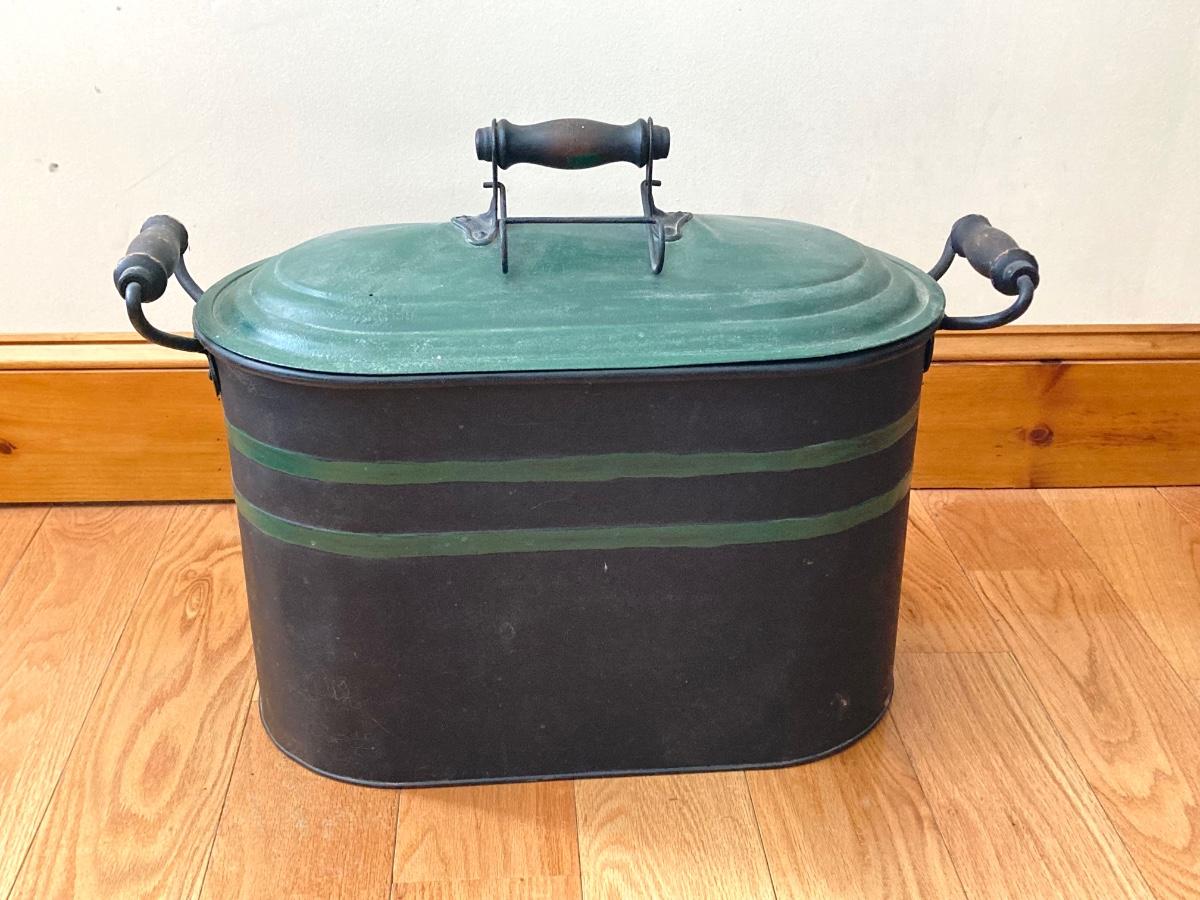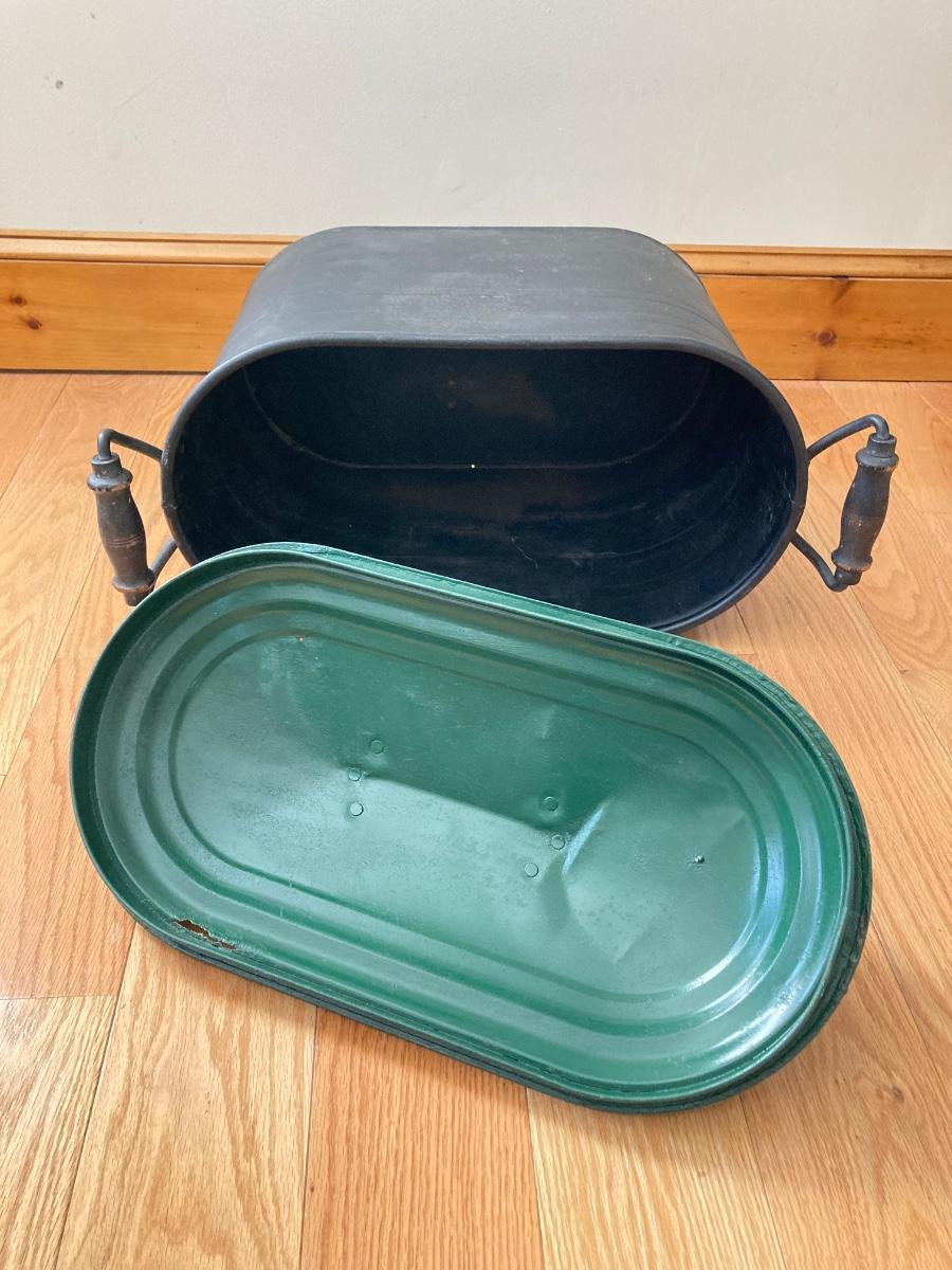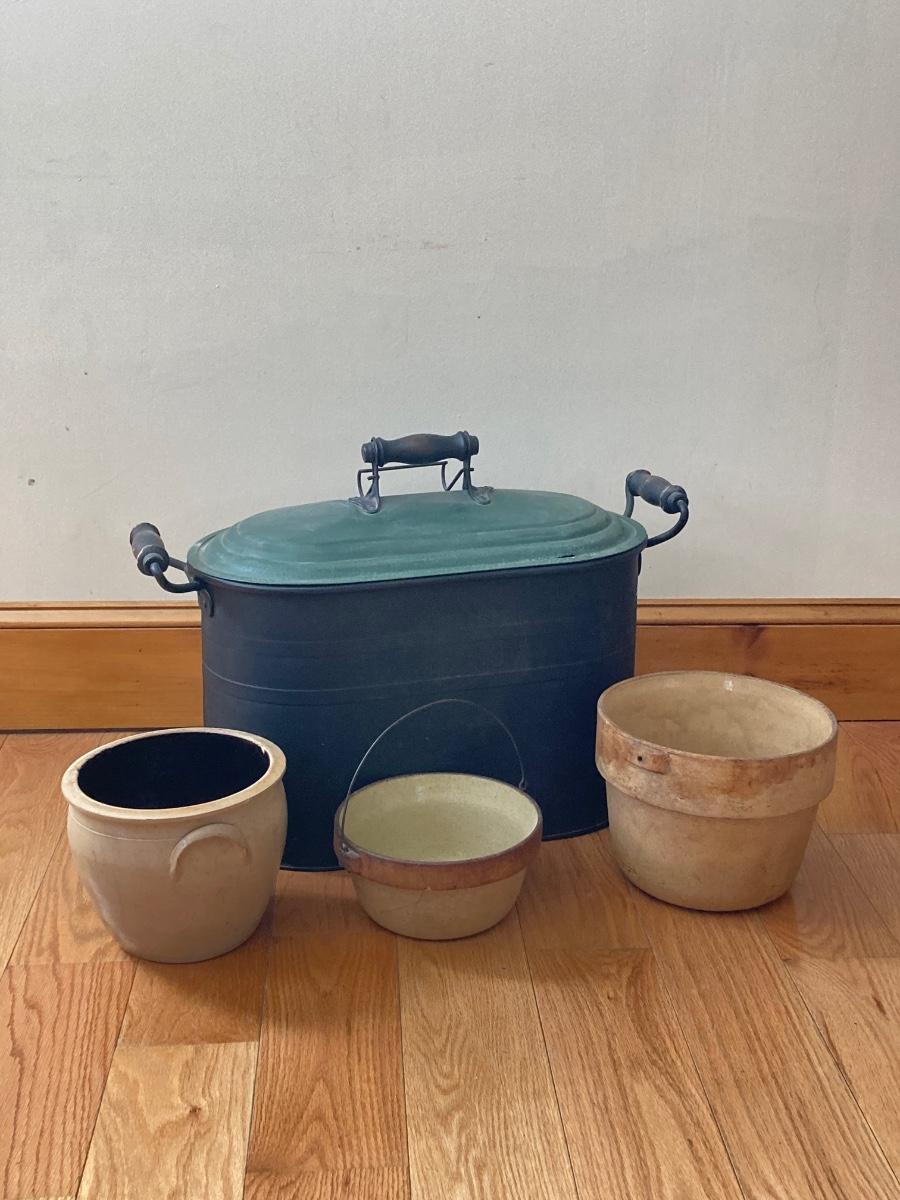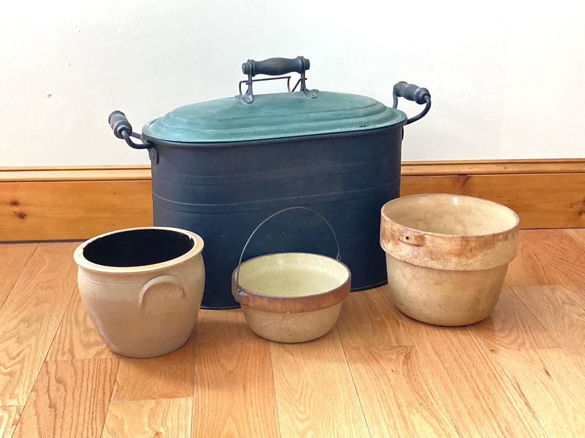 LOT 33: Vintage Painted Boiler / Wash Tub with Three Pottery Bowls