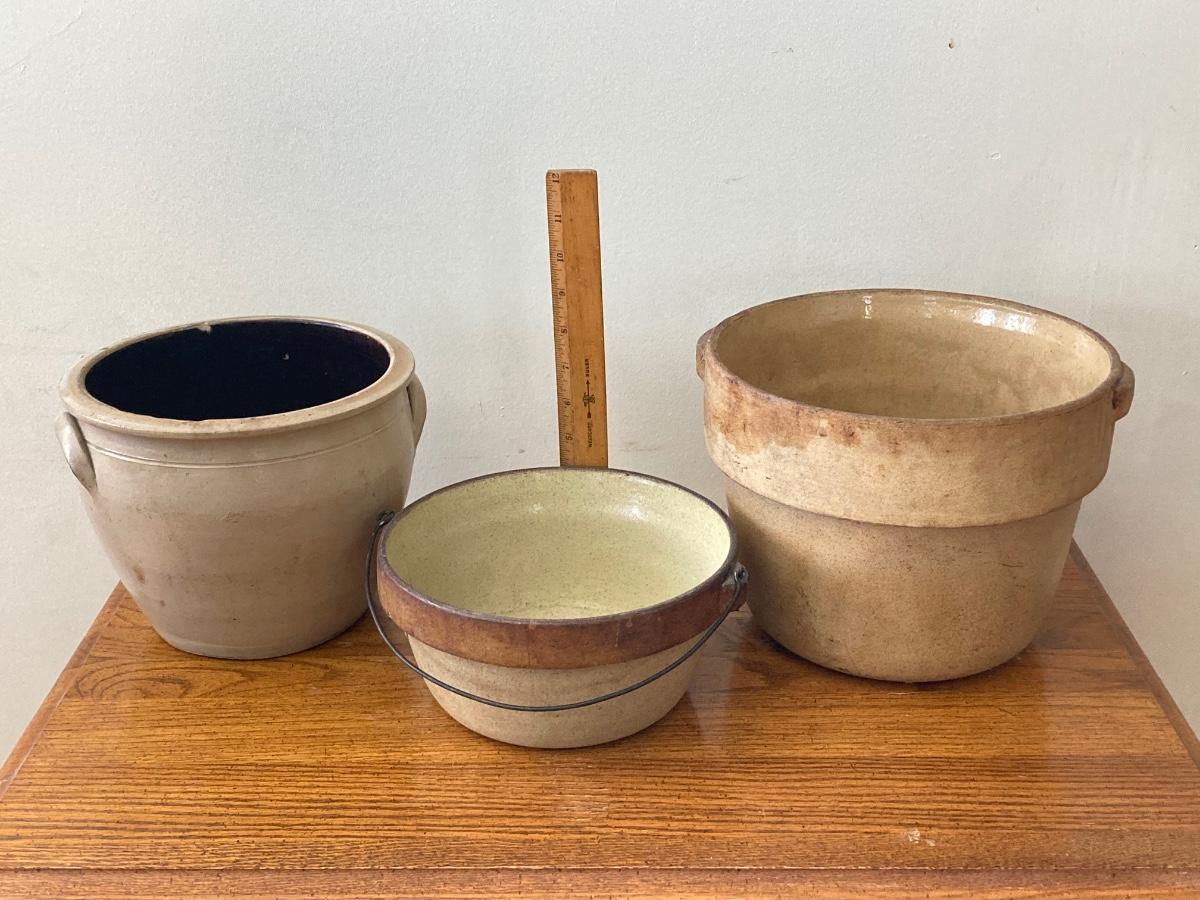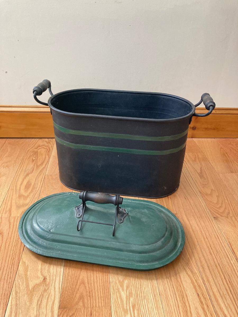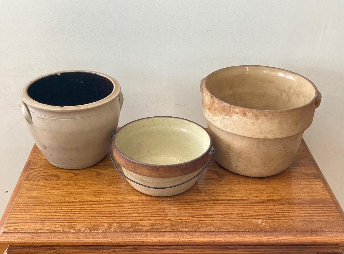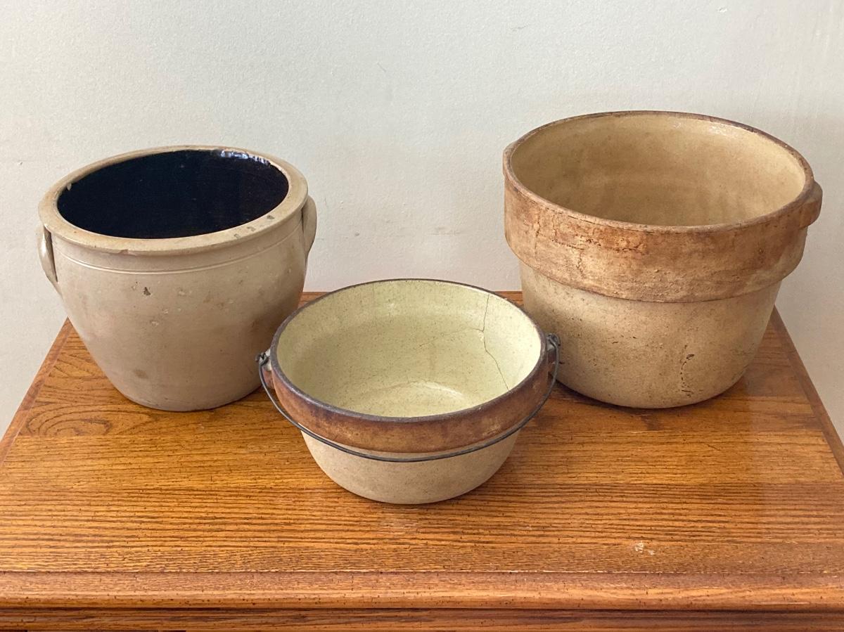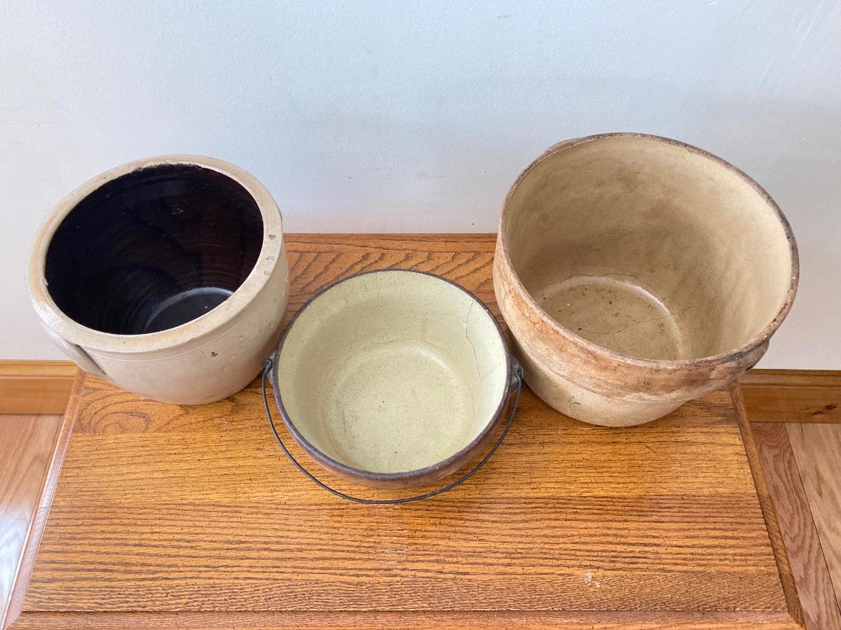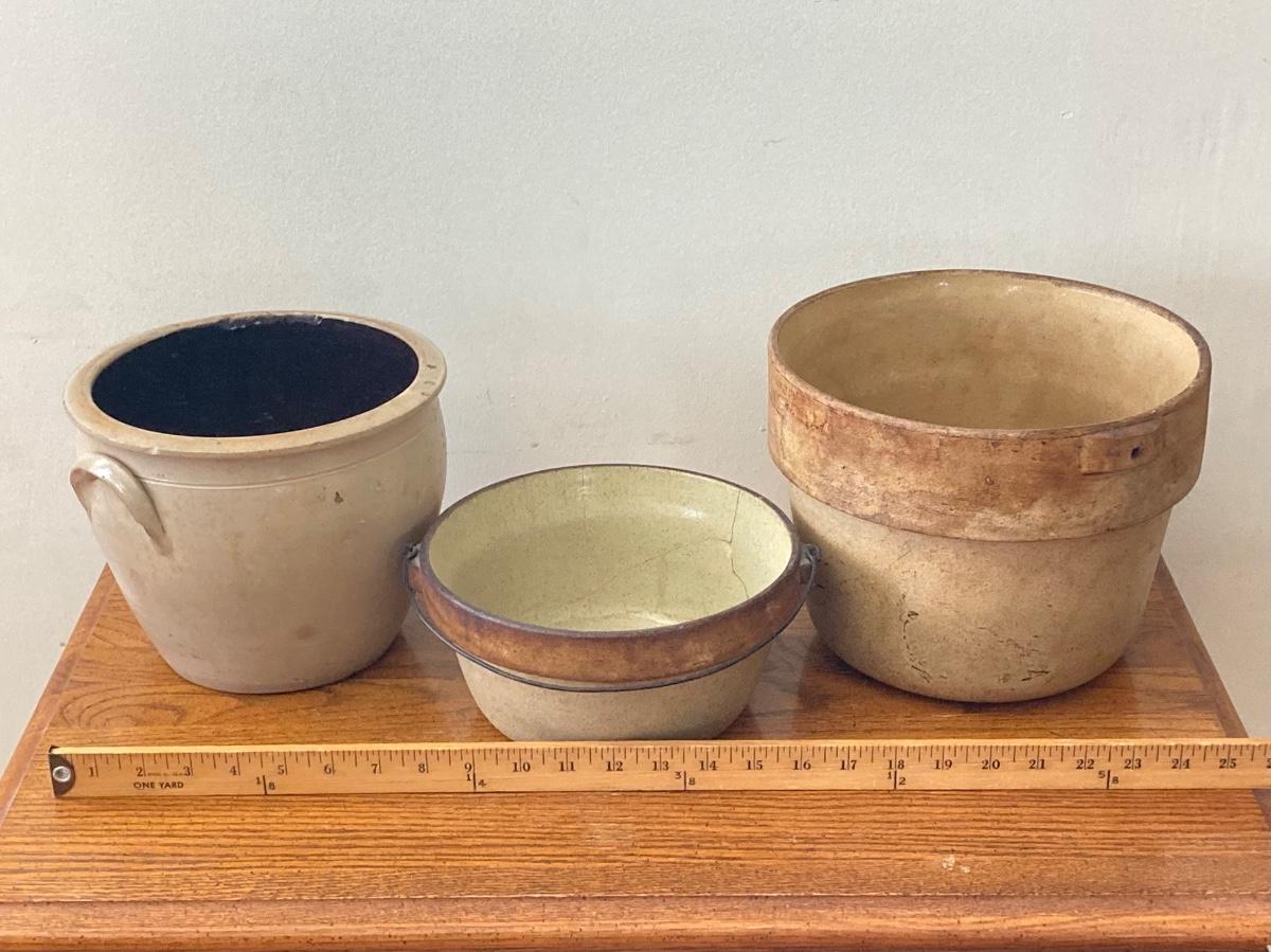 LOT 33: Vintage Painted Boiler / Wash Tub with Three Pottery Bowls