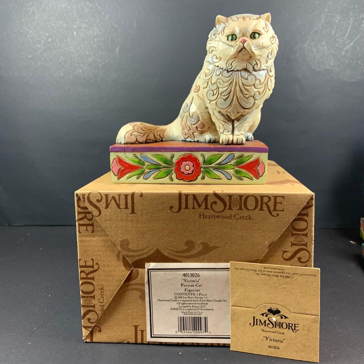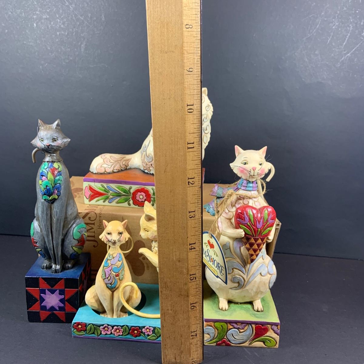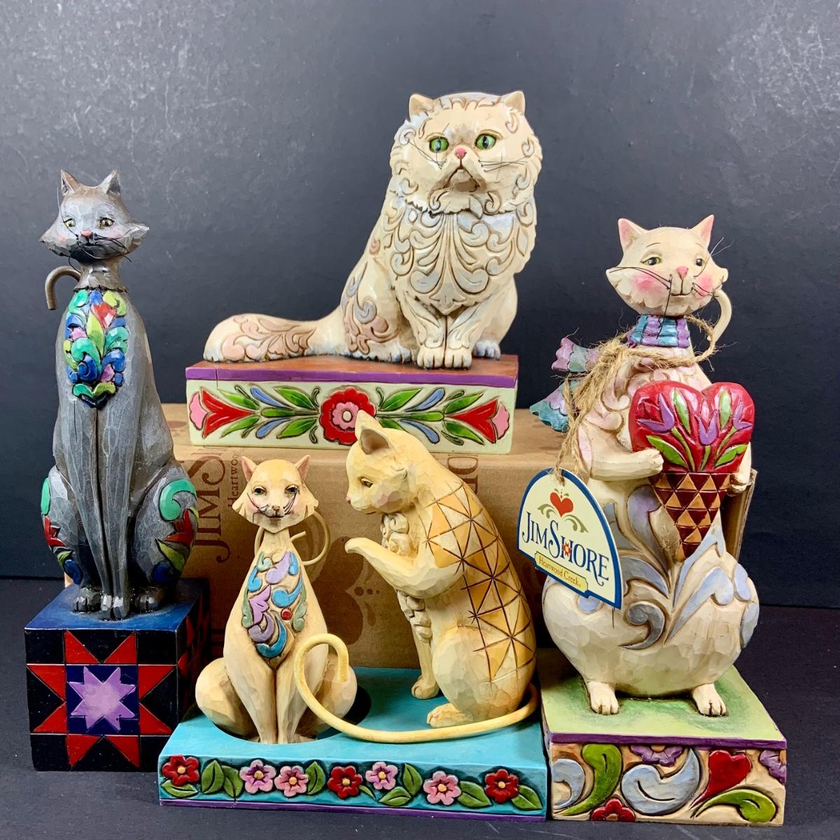 LOT:60: Collection of Jim Shore 5 Cats - "Victoria" Persian Cat, "Leona" Grey Cat, "Cozy Heart" and Cat Candle Holder with Boxes and One Smaller Cat Figurine More without a Box