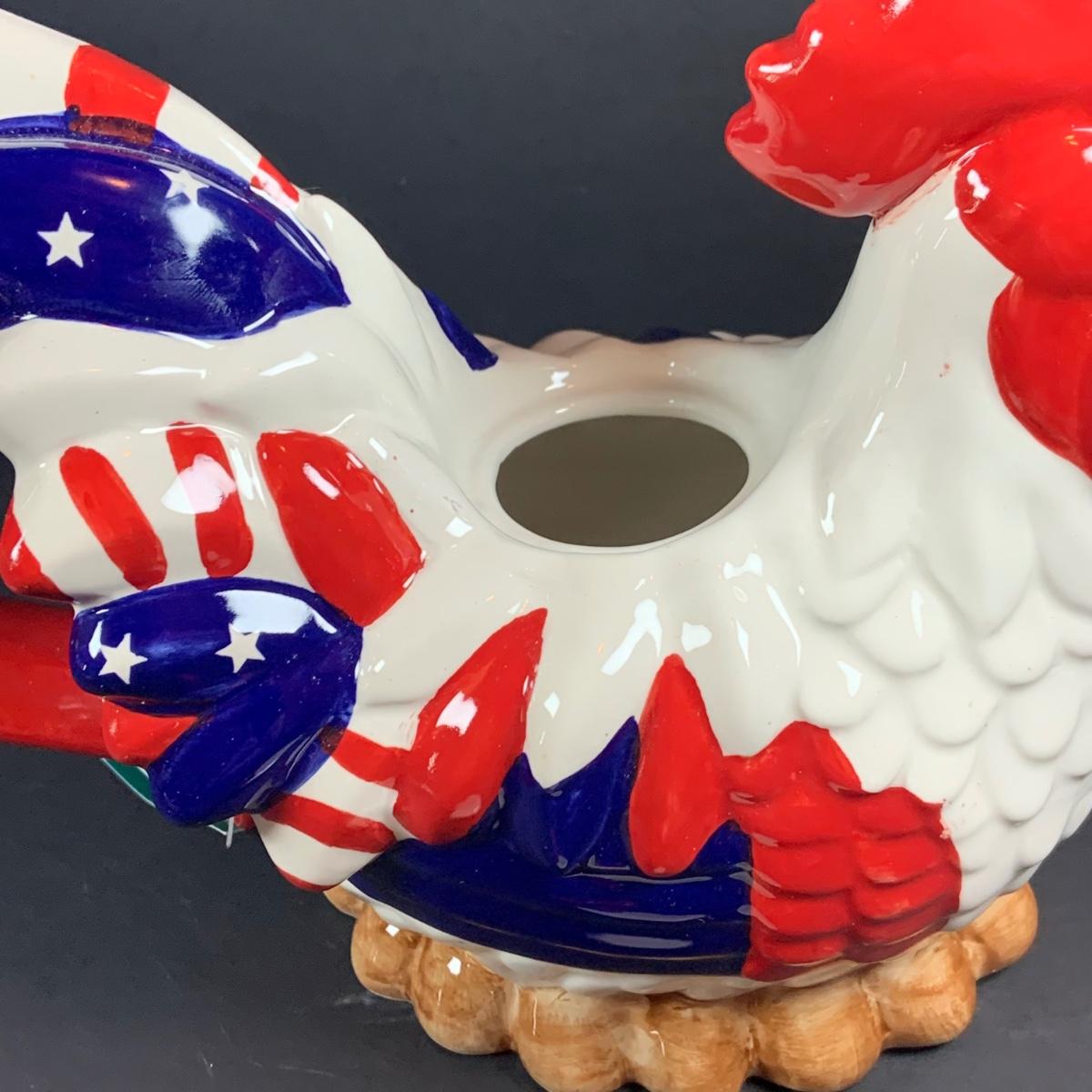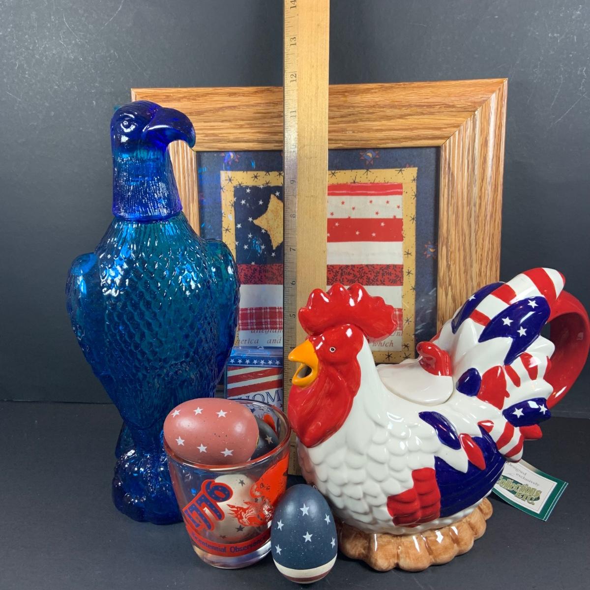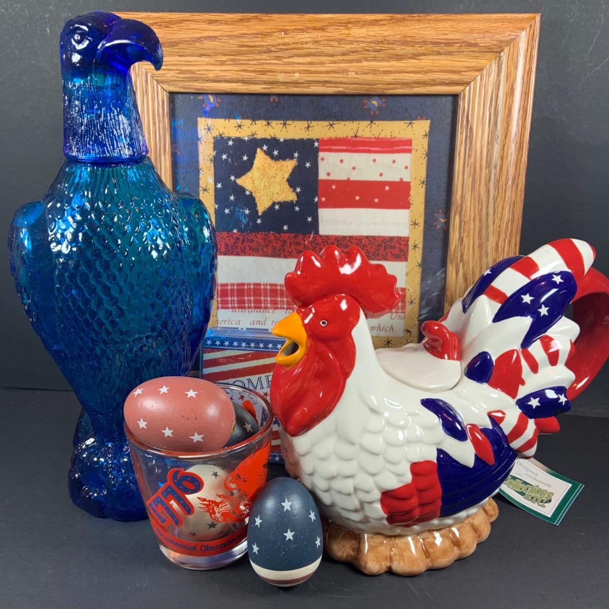 LOT:63: All American Fourth of July Inspired Collection Featuring a Blue Art Glass Eagle Decanter a Red, White and Blue Rooster Ceramic Tea Pot, Star & Stripes Wooden Eggs, Bicentennial Glass and More
