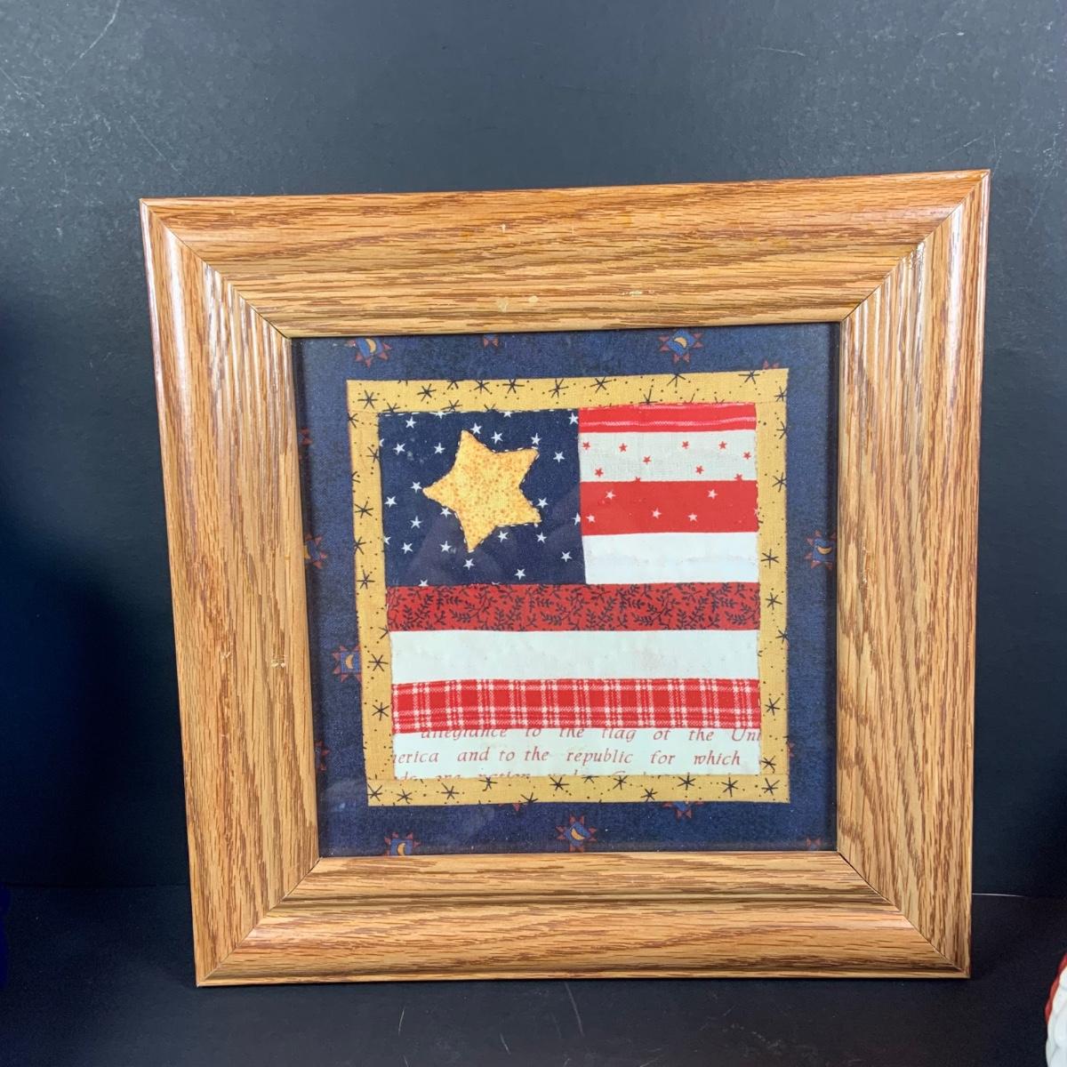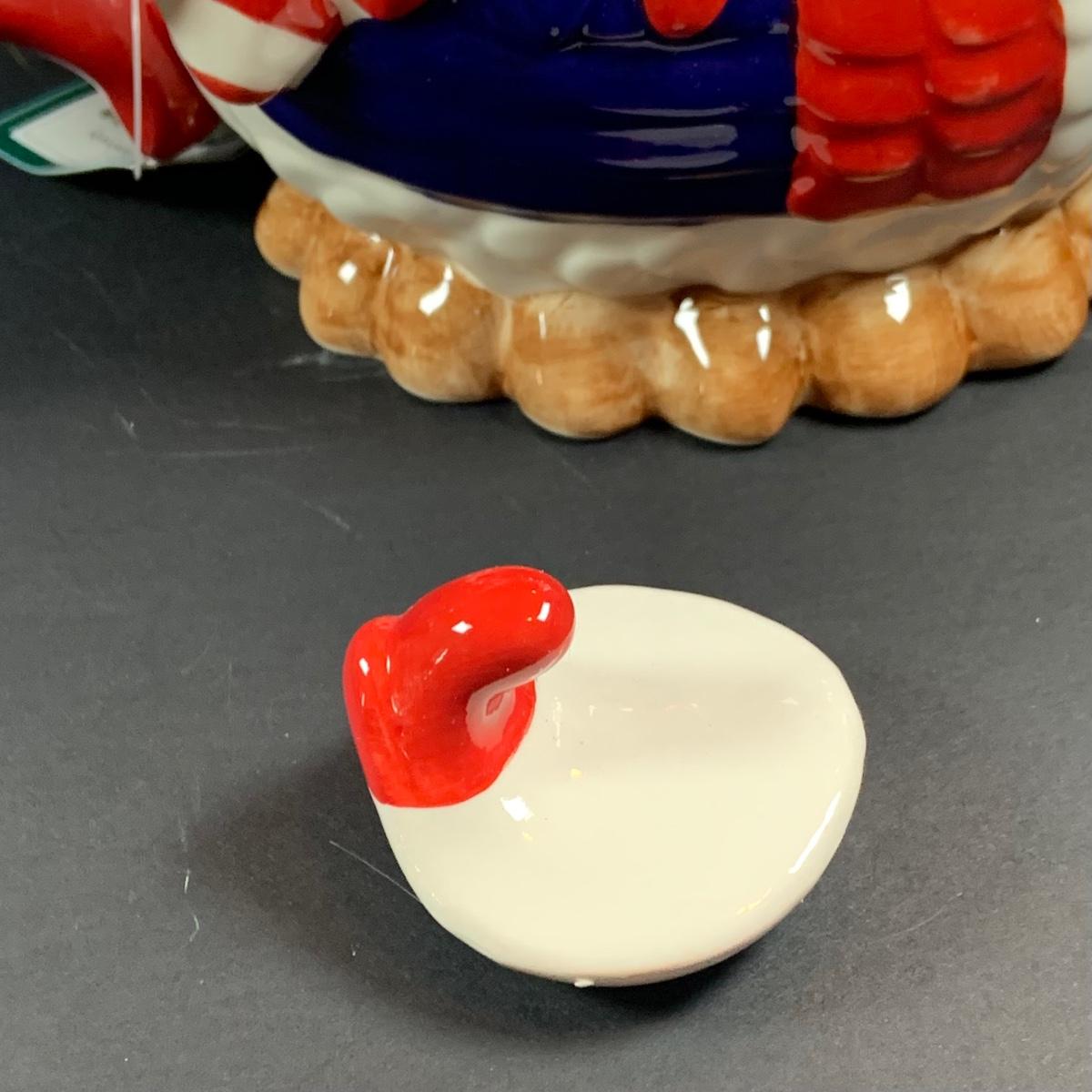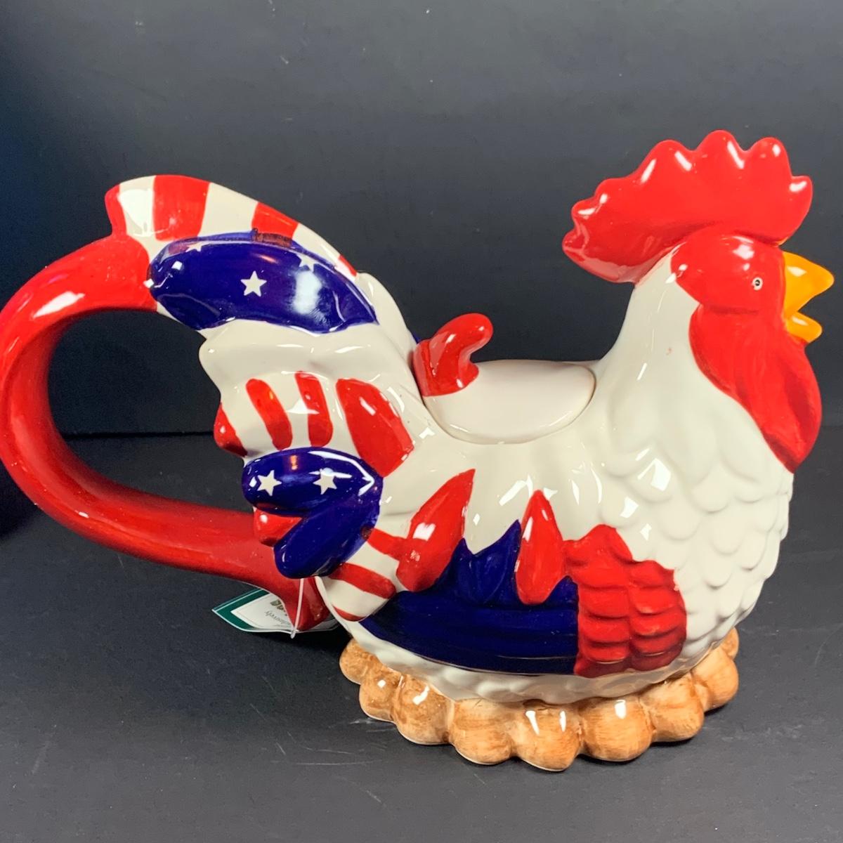 LOT:63: All American Fourth of July Inspired Collection Featuring a Blue Art Glass Eagle Decanter a Red, White and Blue Rooster Ceramic Tea Pot, Star & Stripes Wooden Eggs, Bicentennial Glass and More