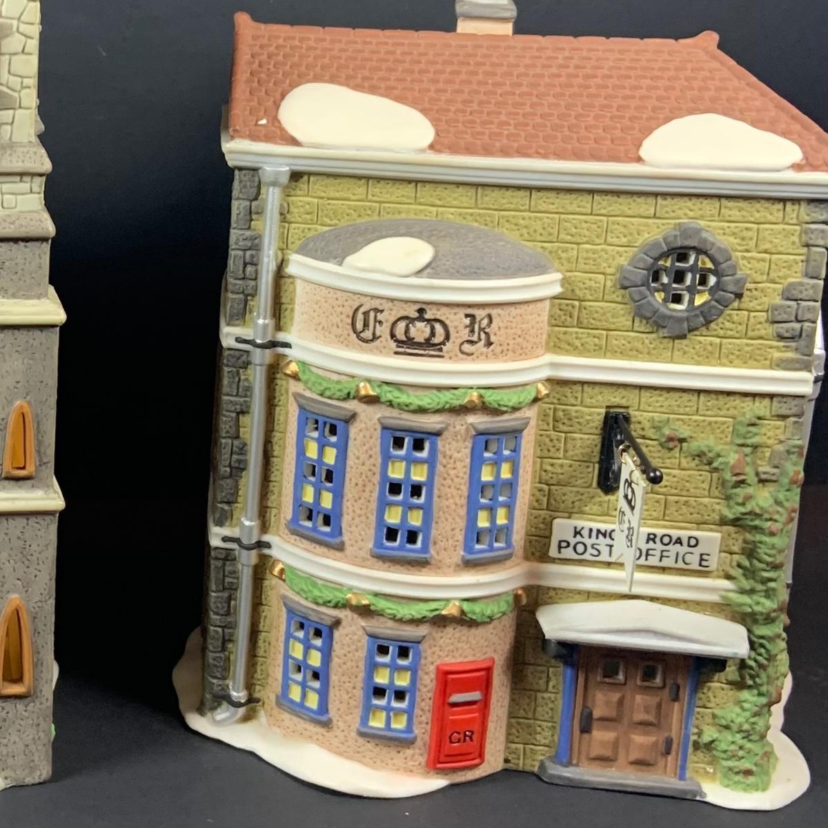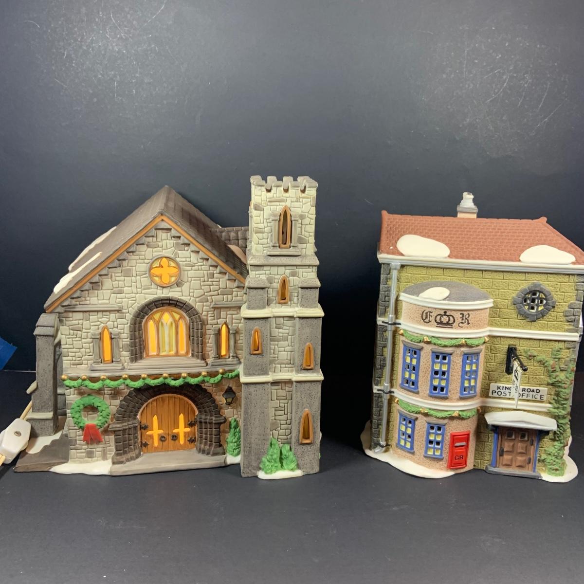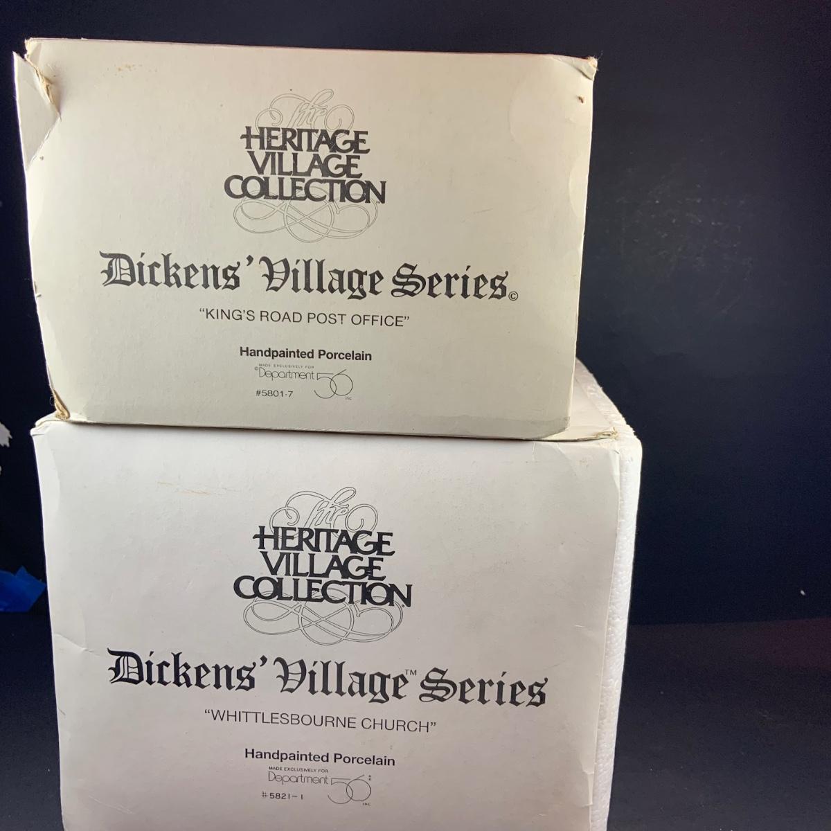 LOT:72: Set of 2 Department 56 Dicken's Village Porcelain Light Miniature Building - King's Road Post Office and Whittlebourn Church