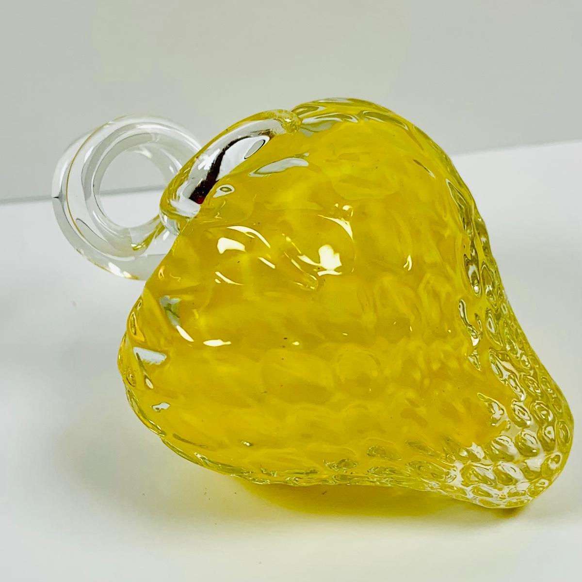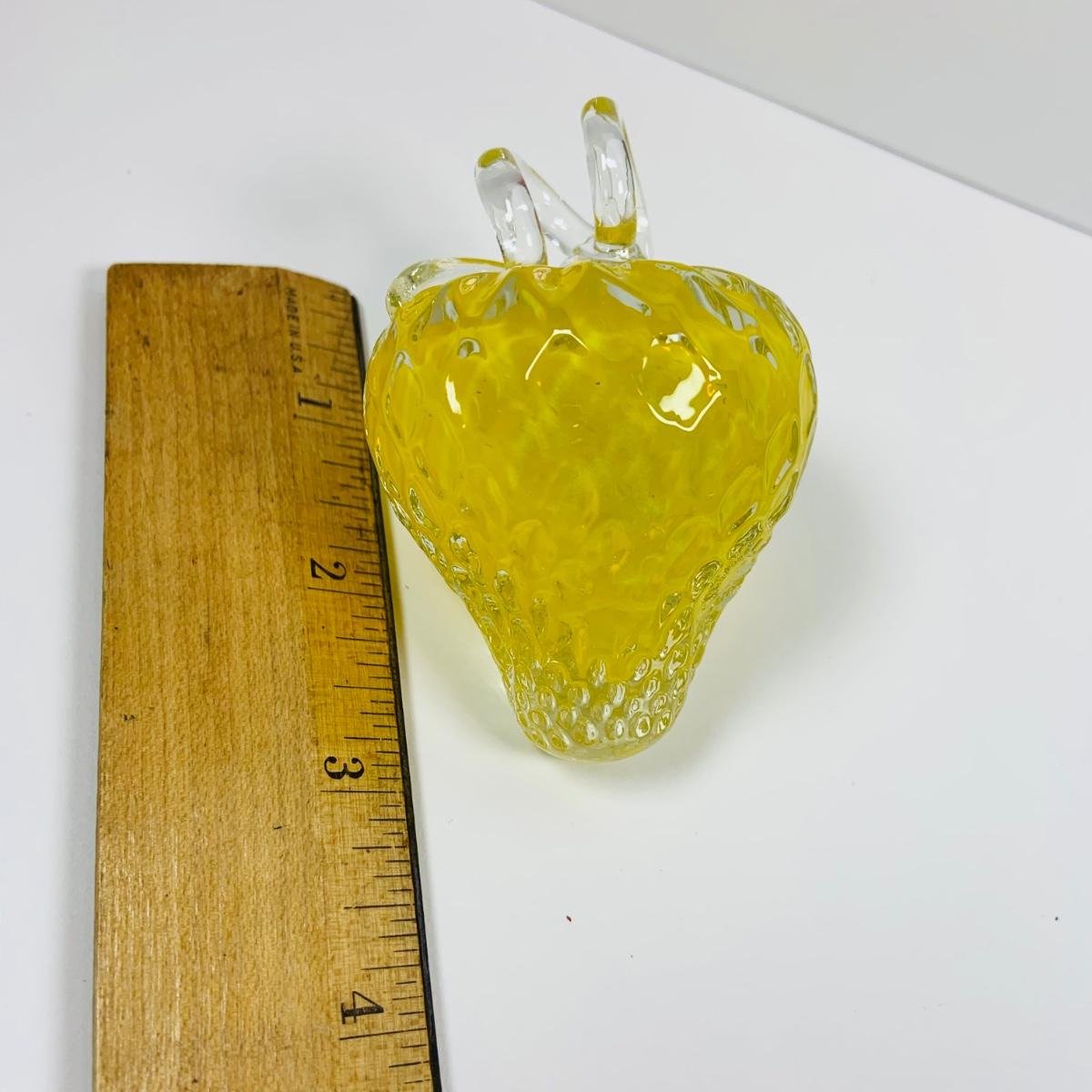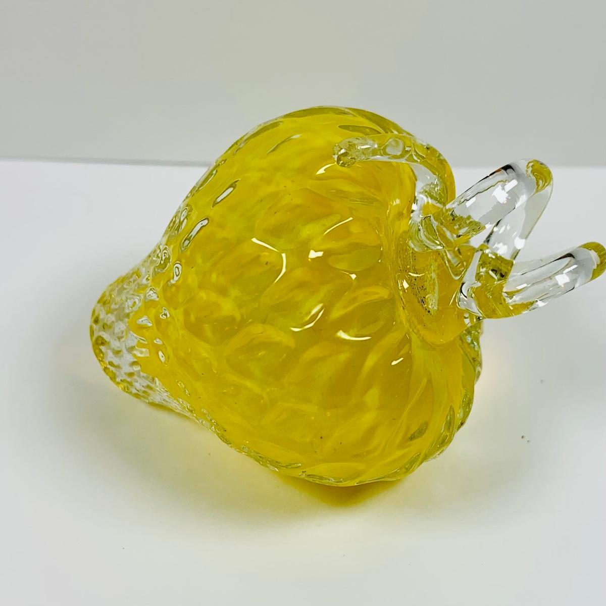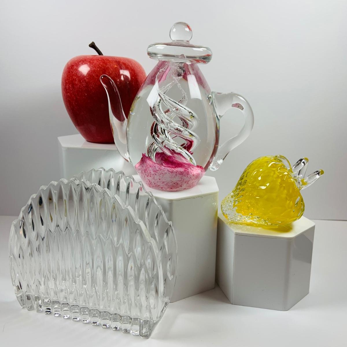 LOT:75: Retro Art Glass Collection Featuring Coffee Pot Paperweight, Levay Anton Style Yellow Strawberry, Glass Apple and Princess House Napkin Holder