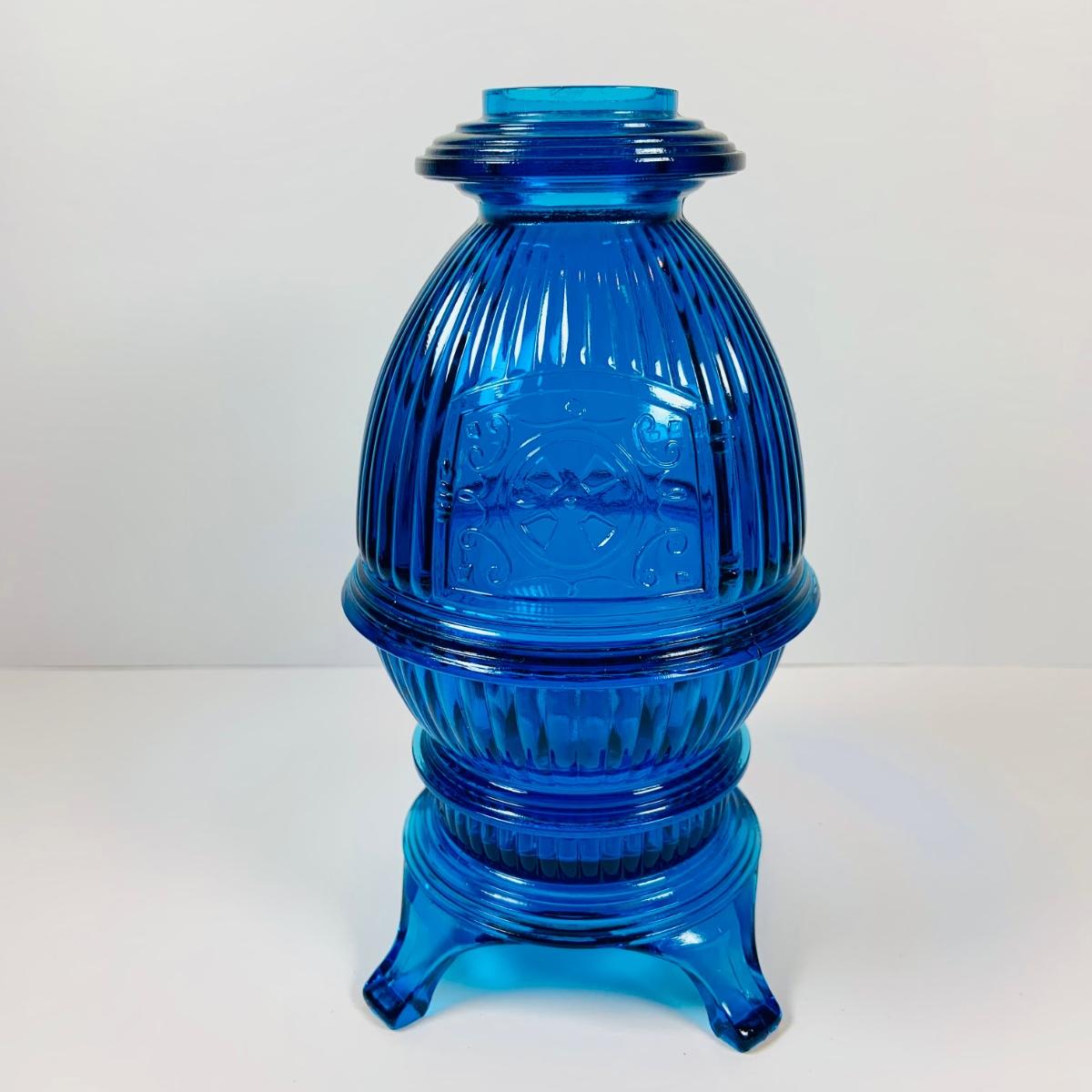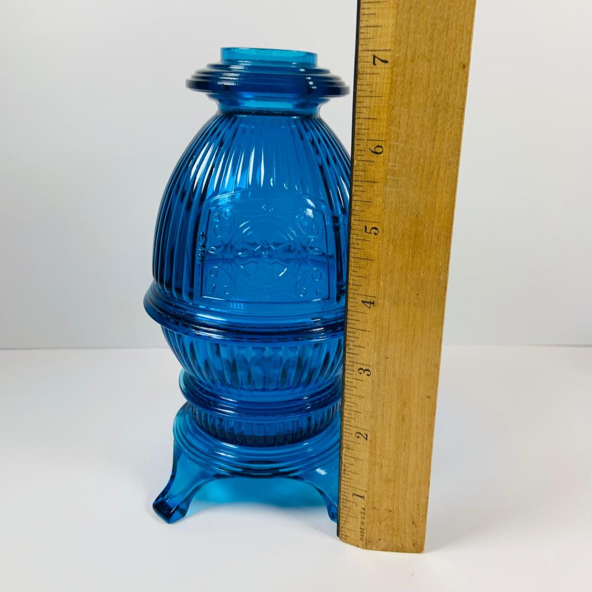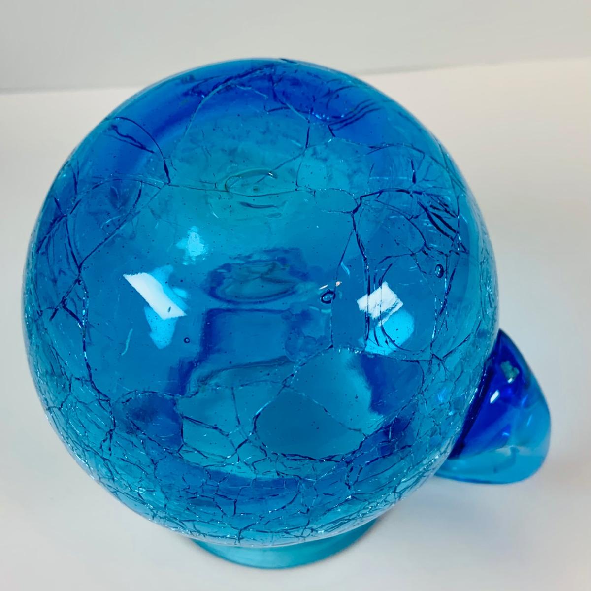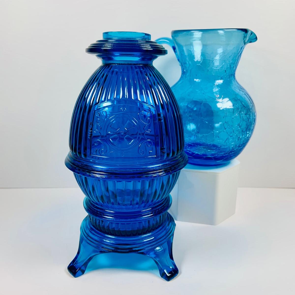 LOT:77: Vintage Viking Blue Glass Pot Belly Stove Fairy Light and Small Blue Crackle Glass Pitcher