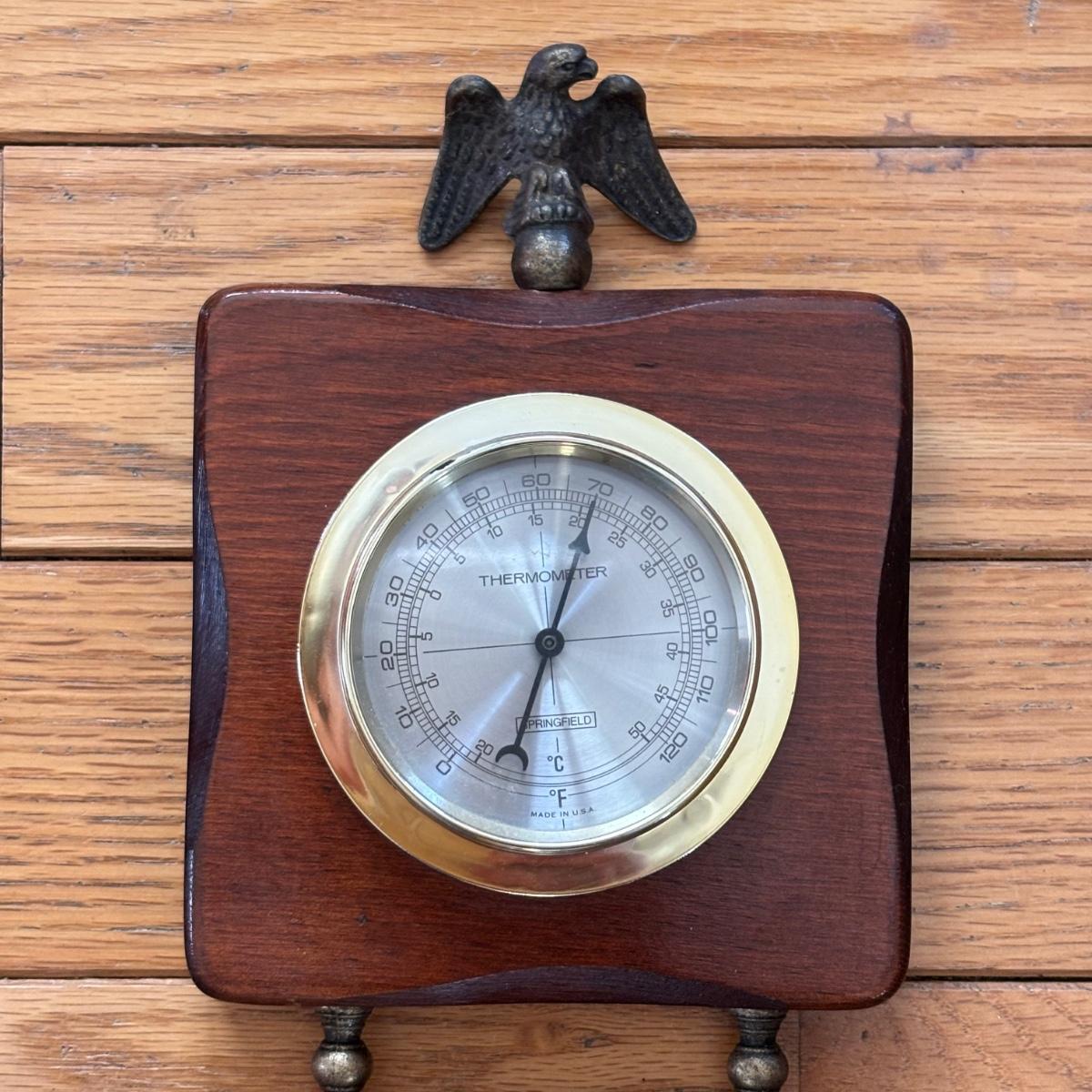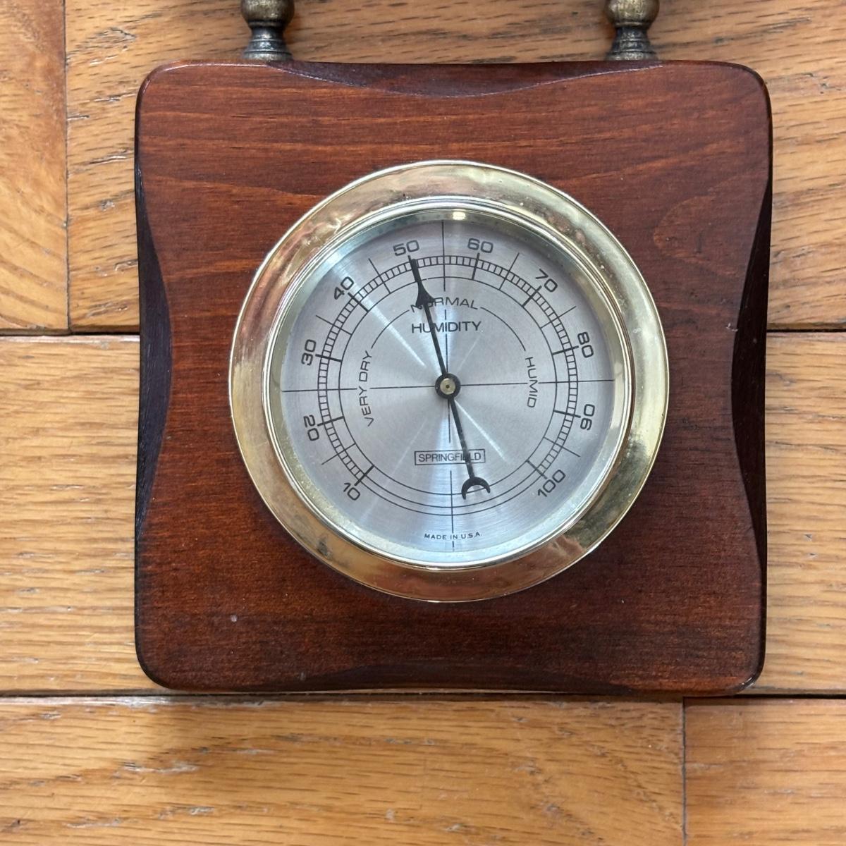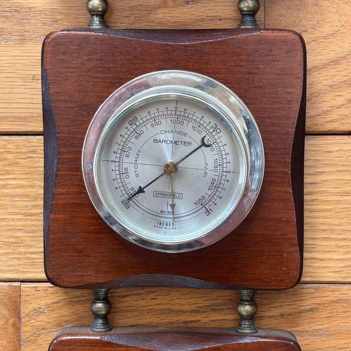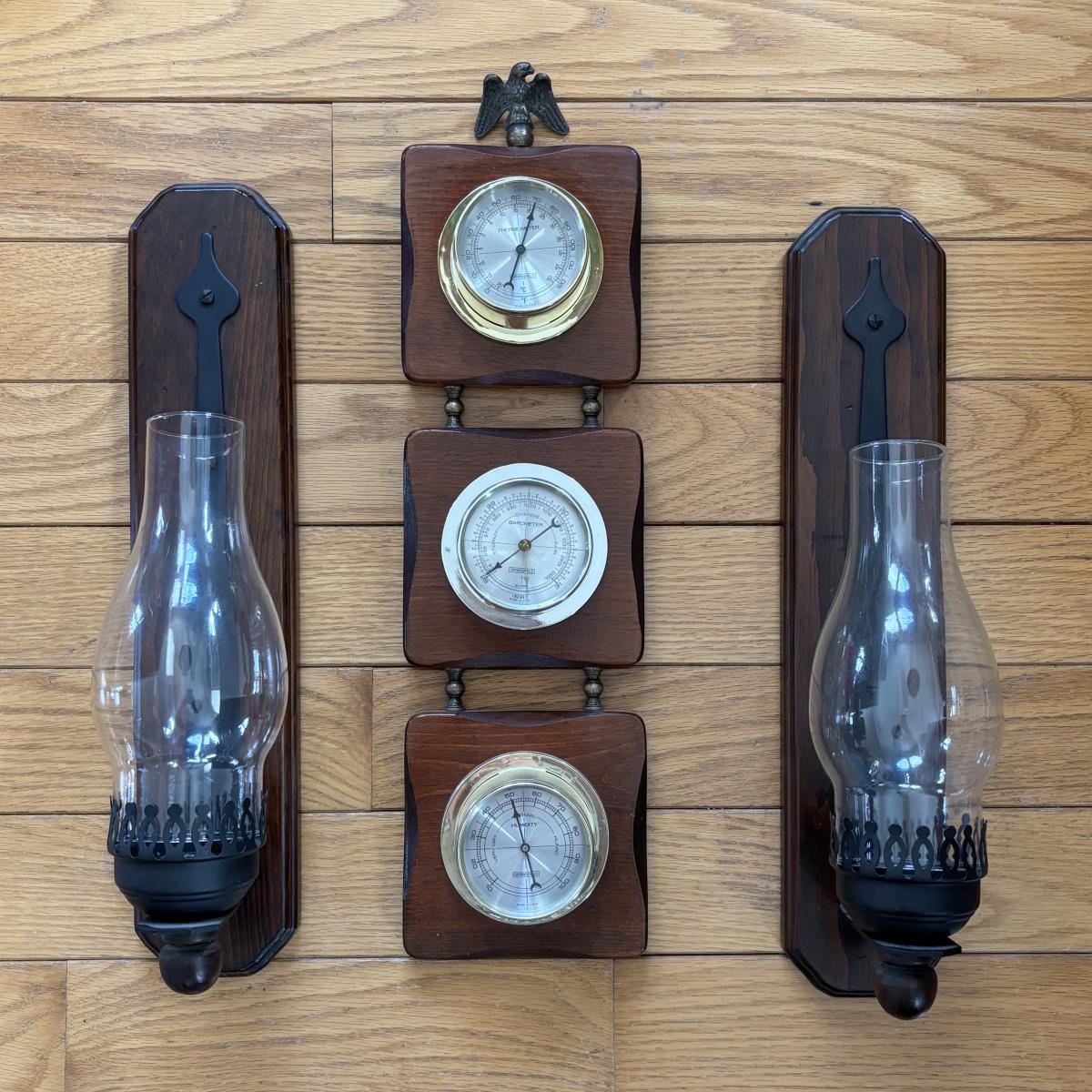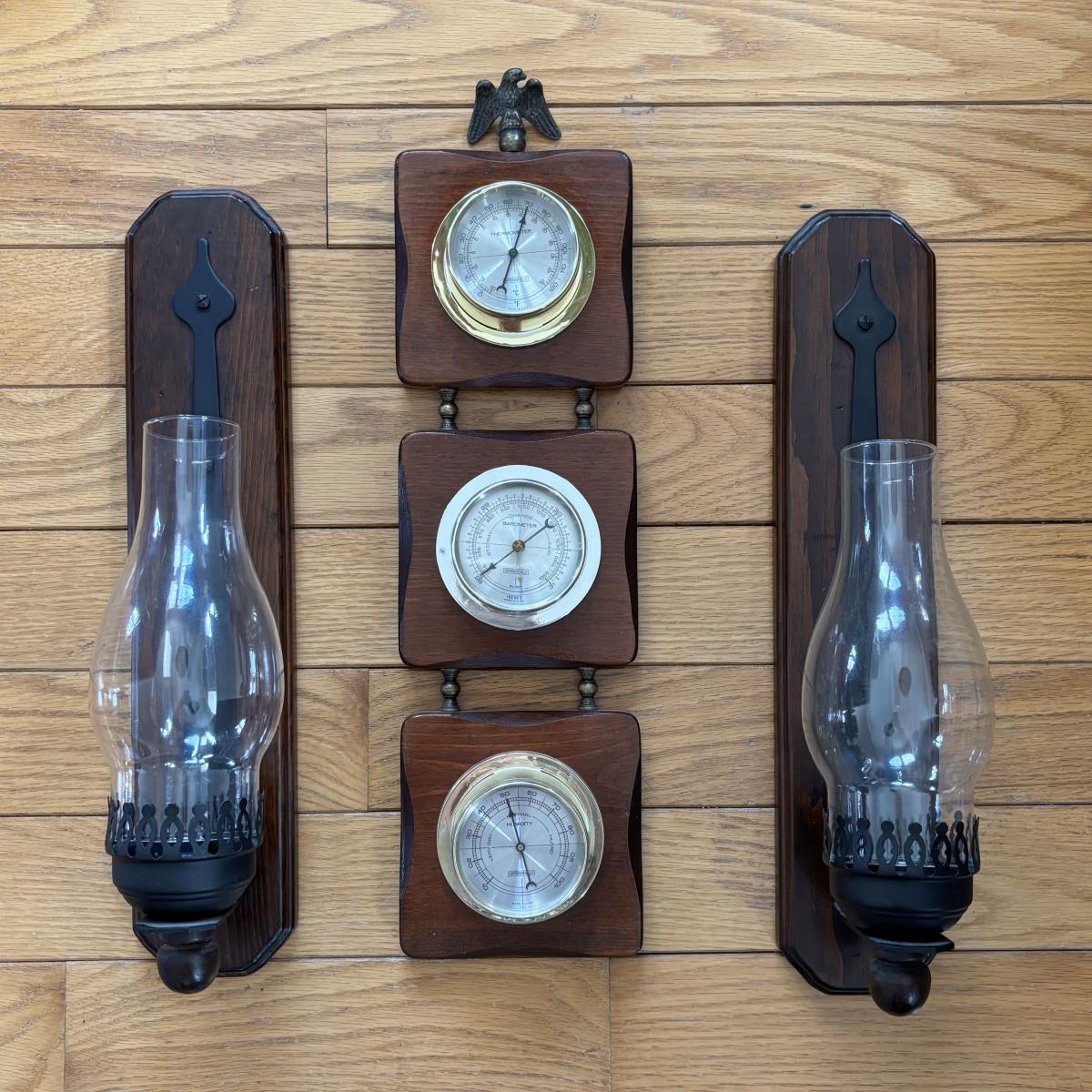LOT 95: Springfield Wall Weather Station: Thermometer, Humidity, Barometer along with Wooden Colonial Style Wall Sconces