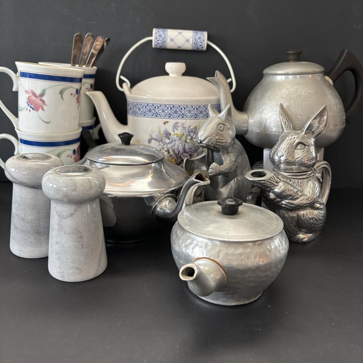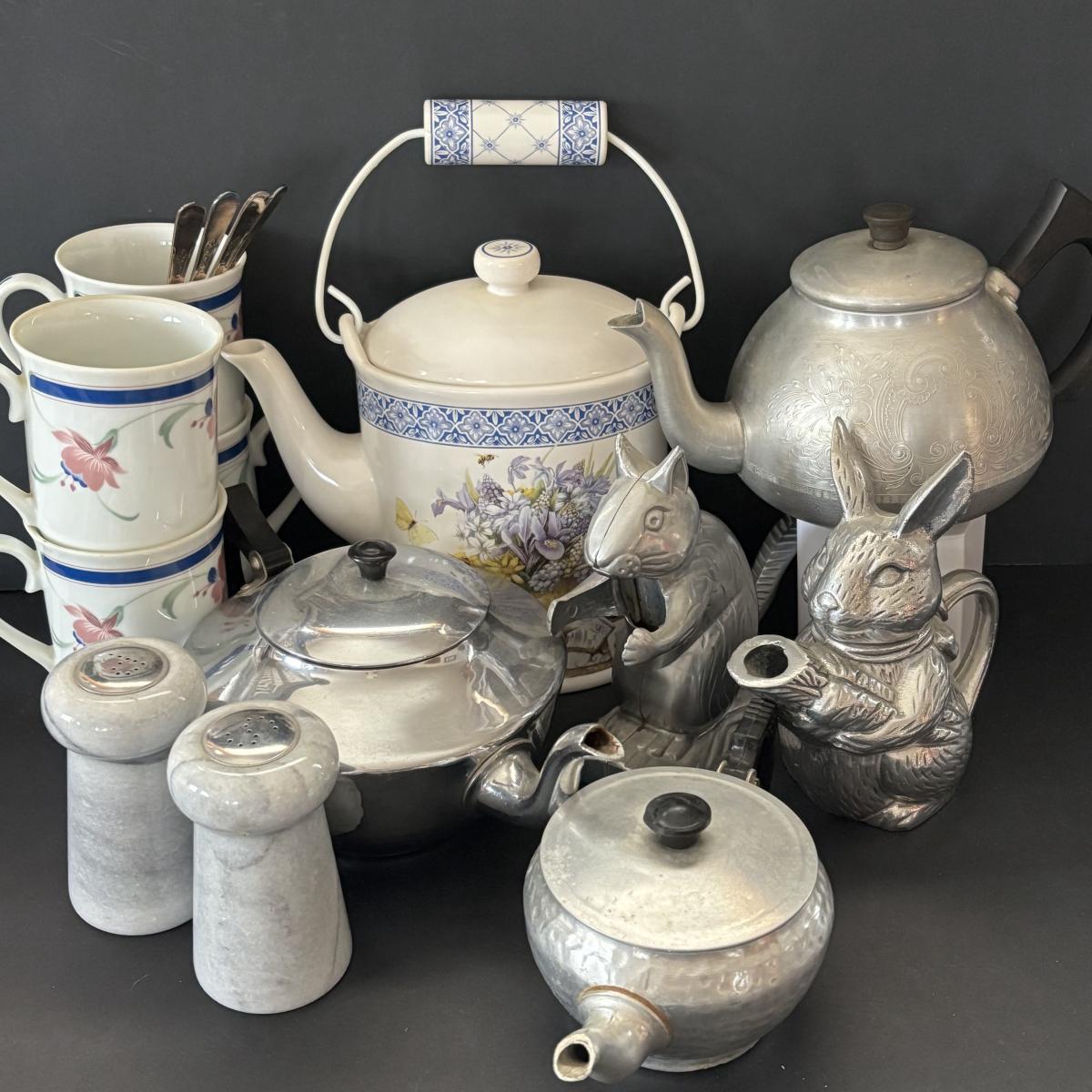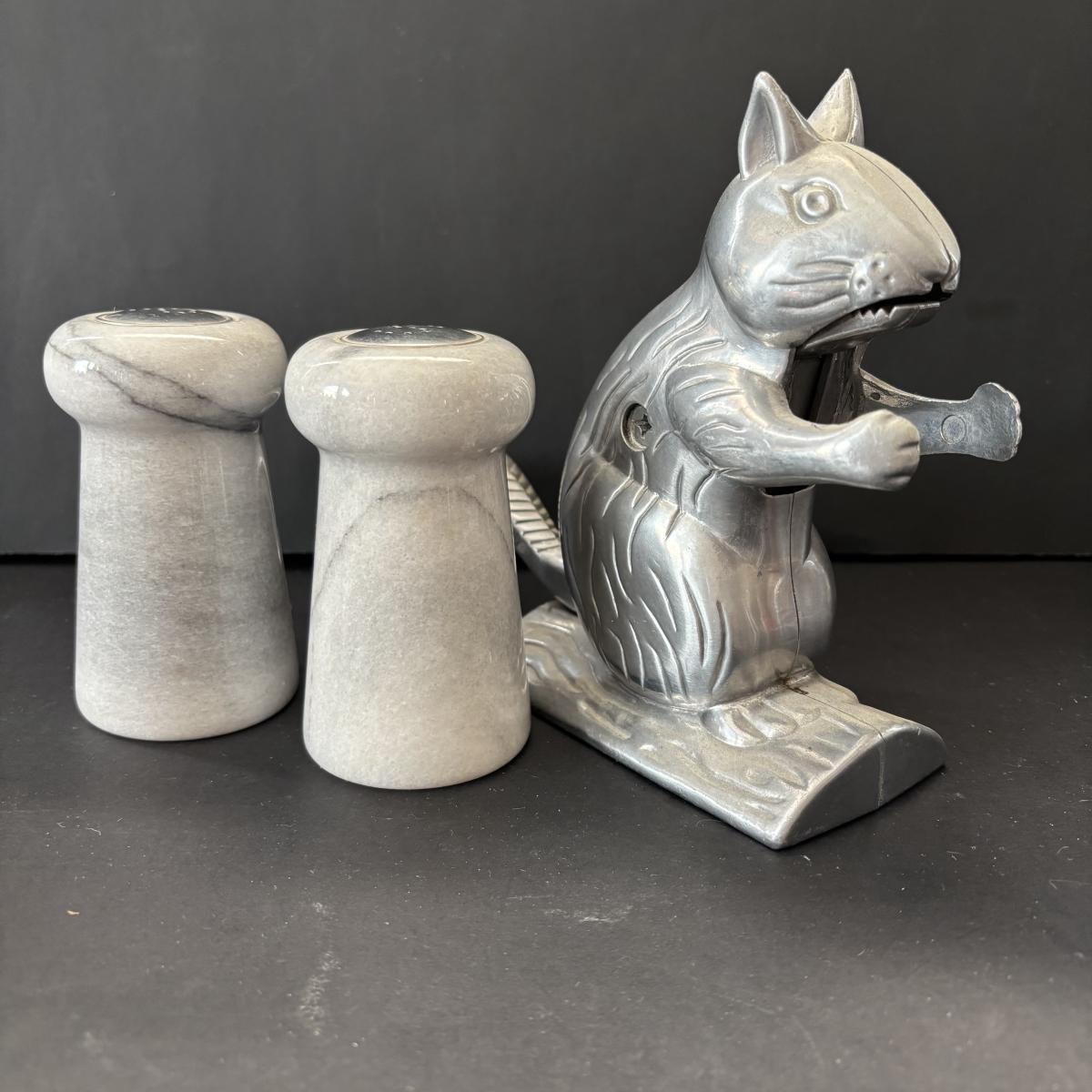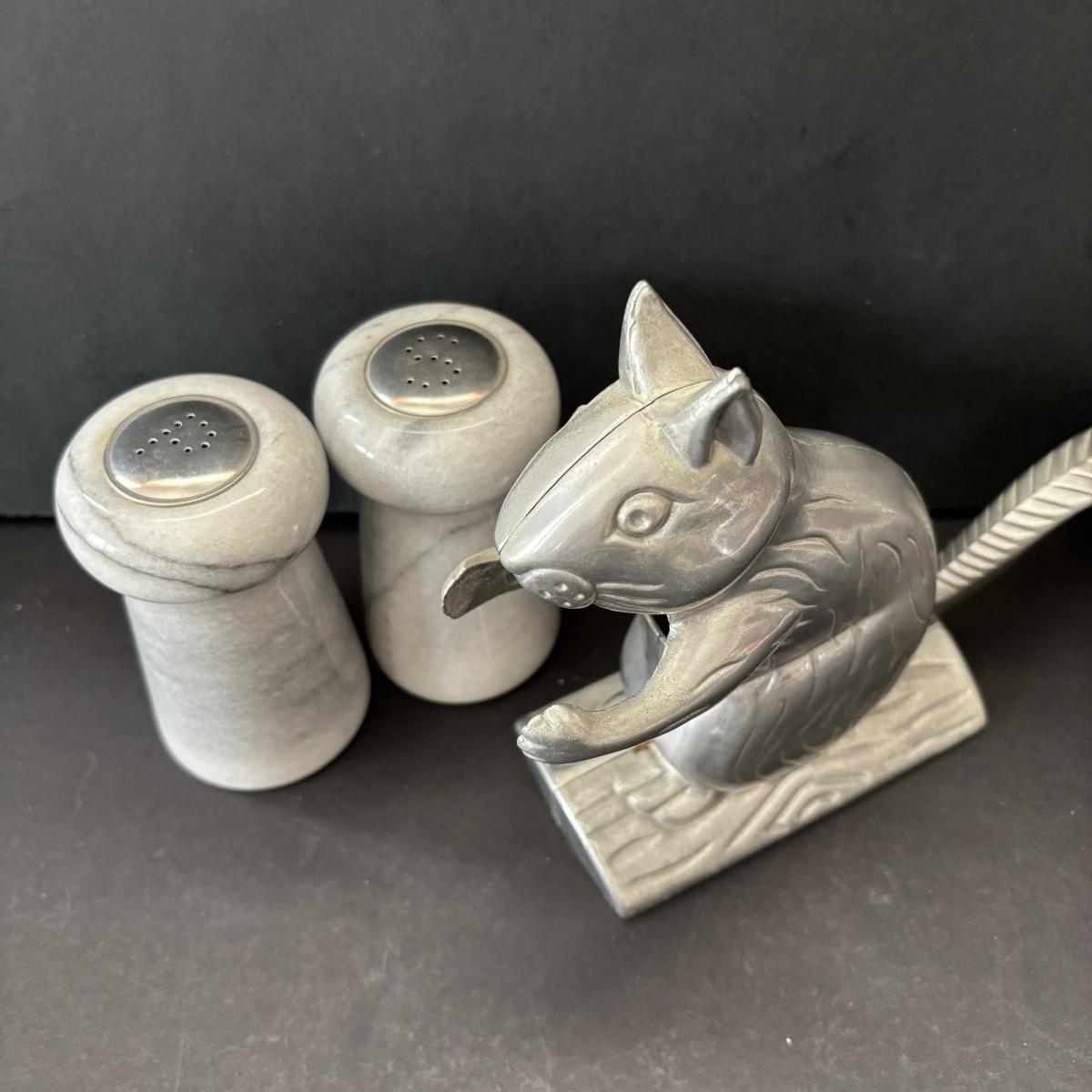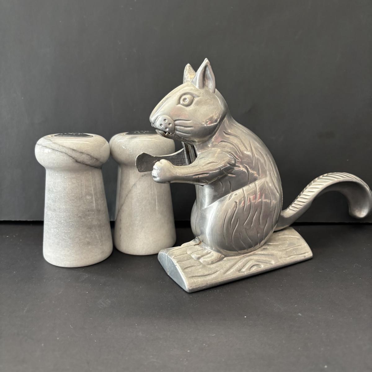 LOT 96: Aluminum Squirrel Nutcracker, CBK 1992 Metal Rabbit Teapot, Marble Salt/Pepper, Vintage Aluminum Teapot by NC Joseph Ltd Stratford-on Avon, Swan Brand Teapot, The Carlton & More