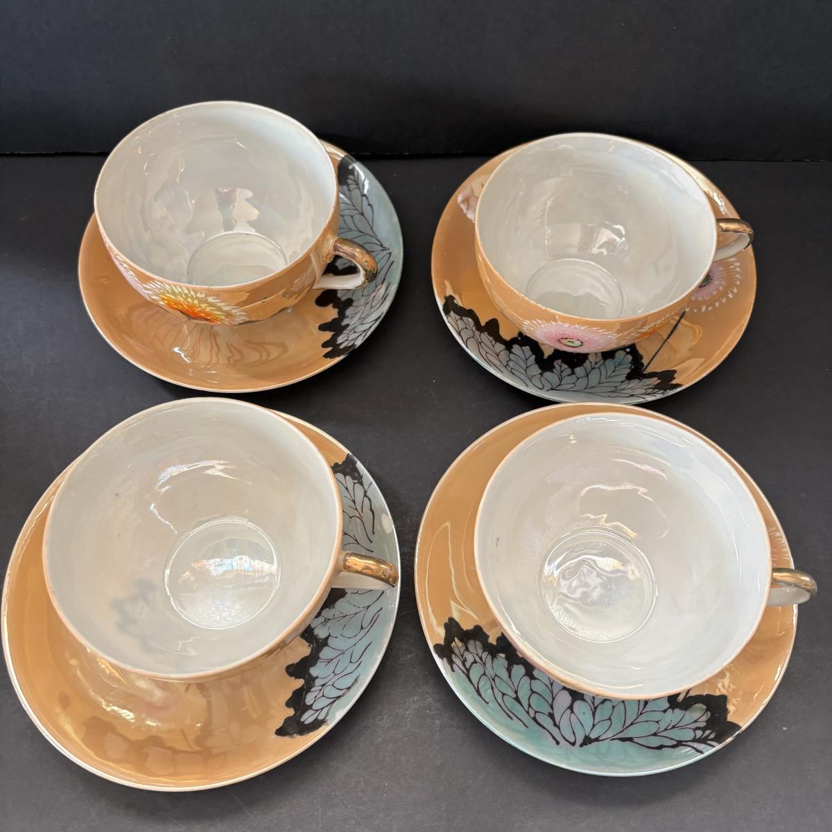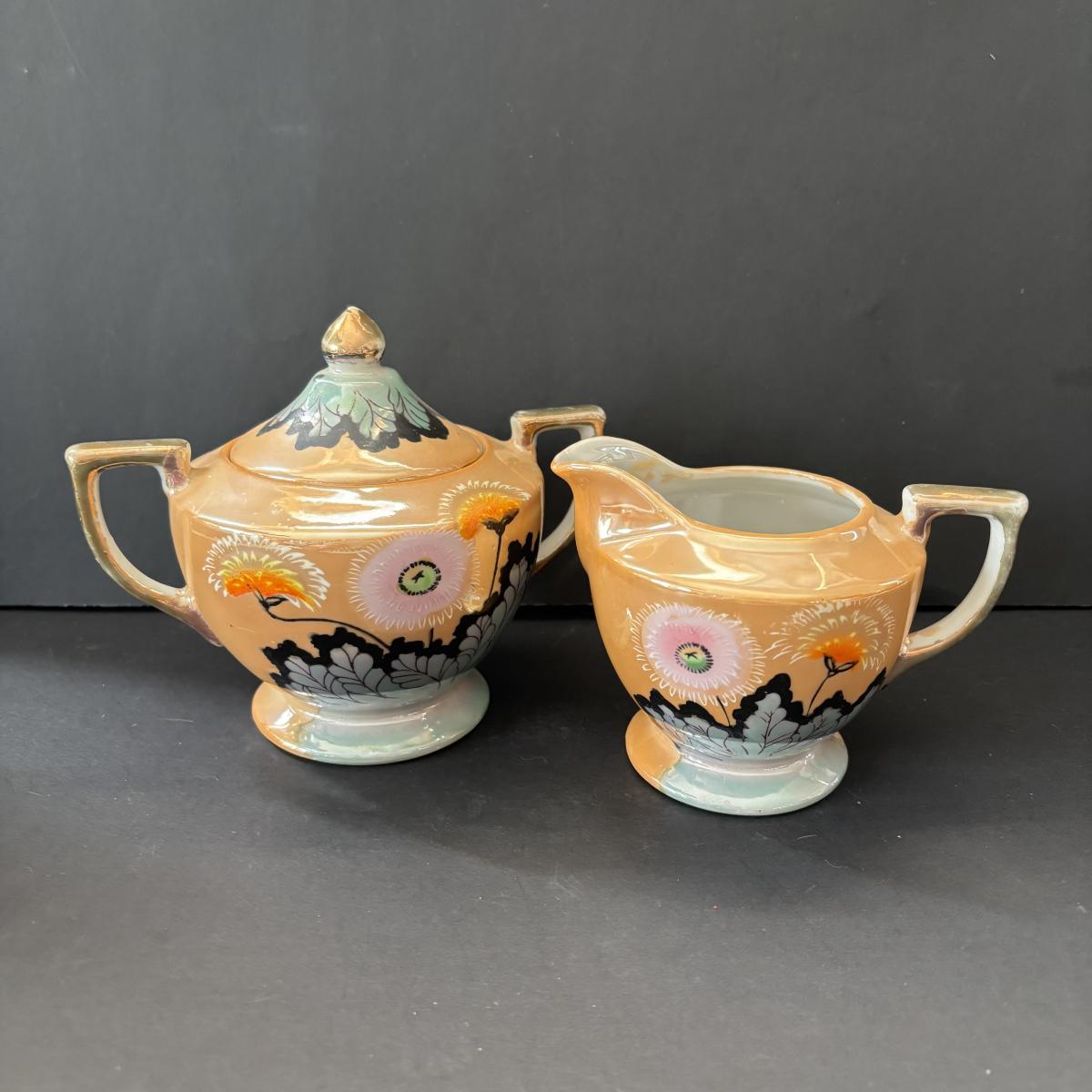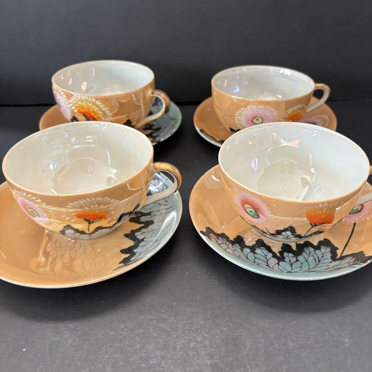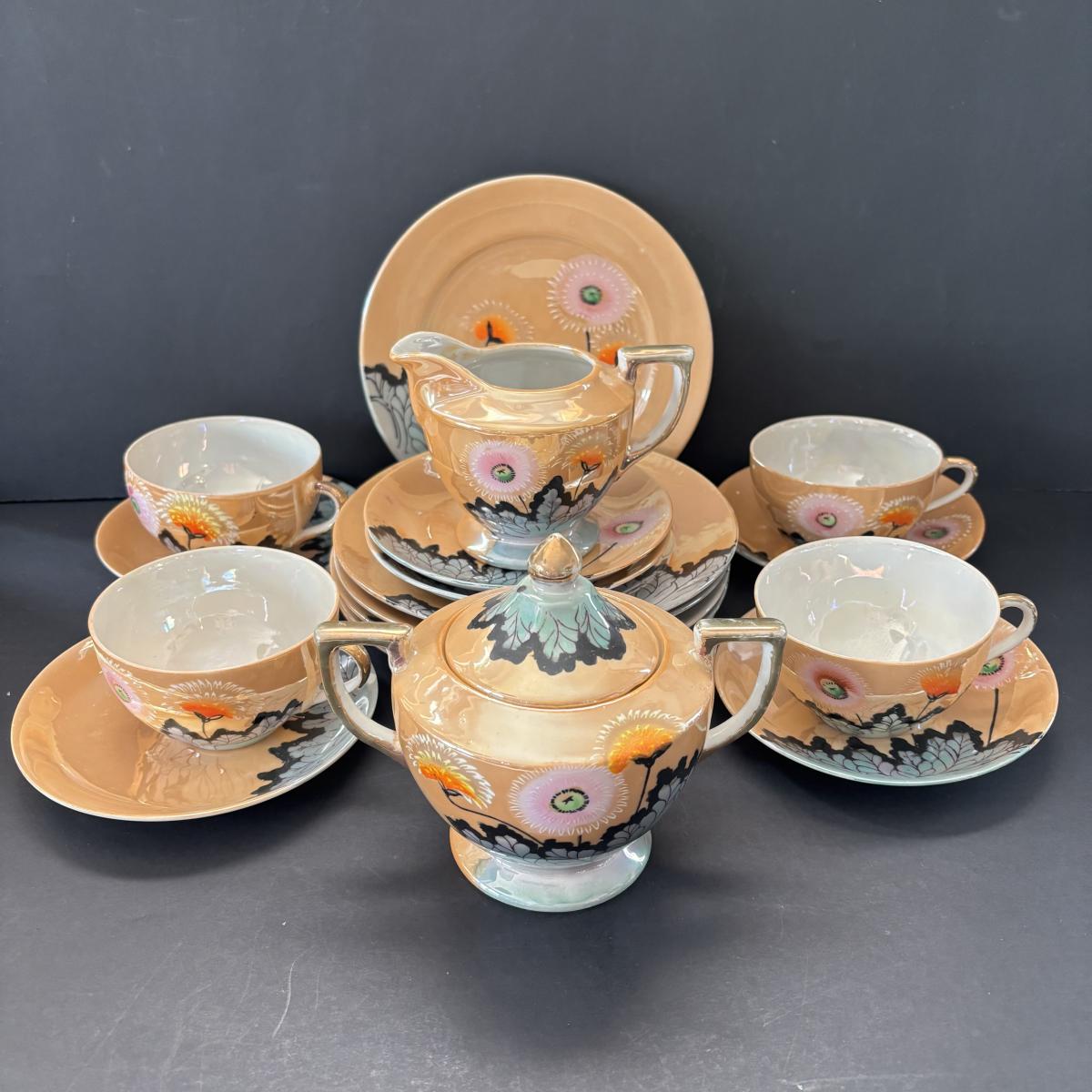 LOT 99: Vintage Hand Painted Lusterware Tea Service: Cups, Saucers, Dessert Plates, Creamer & Sugar Bowl (no Teapot)