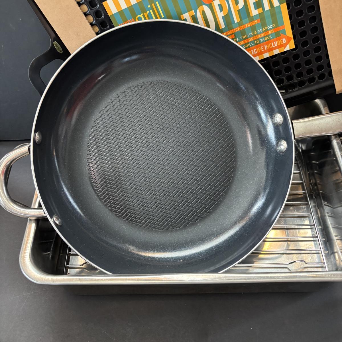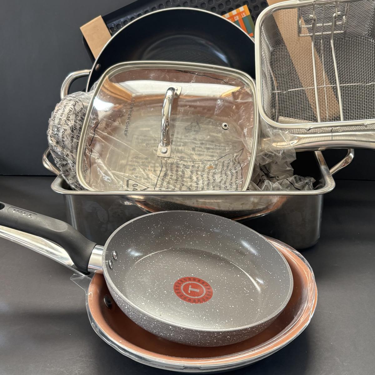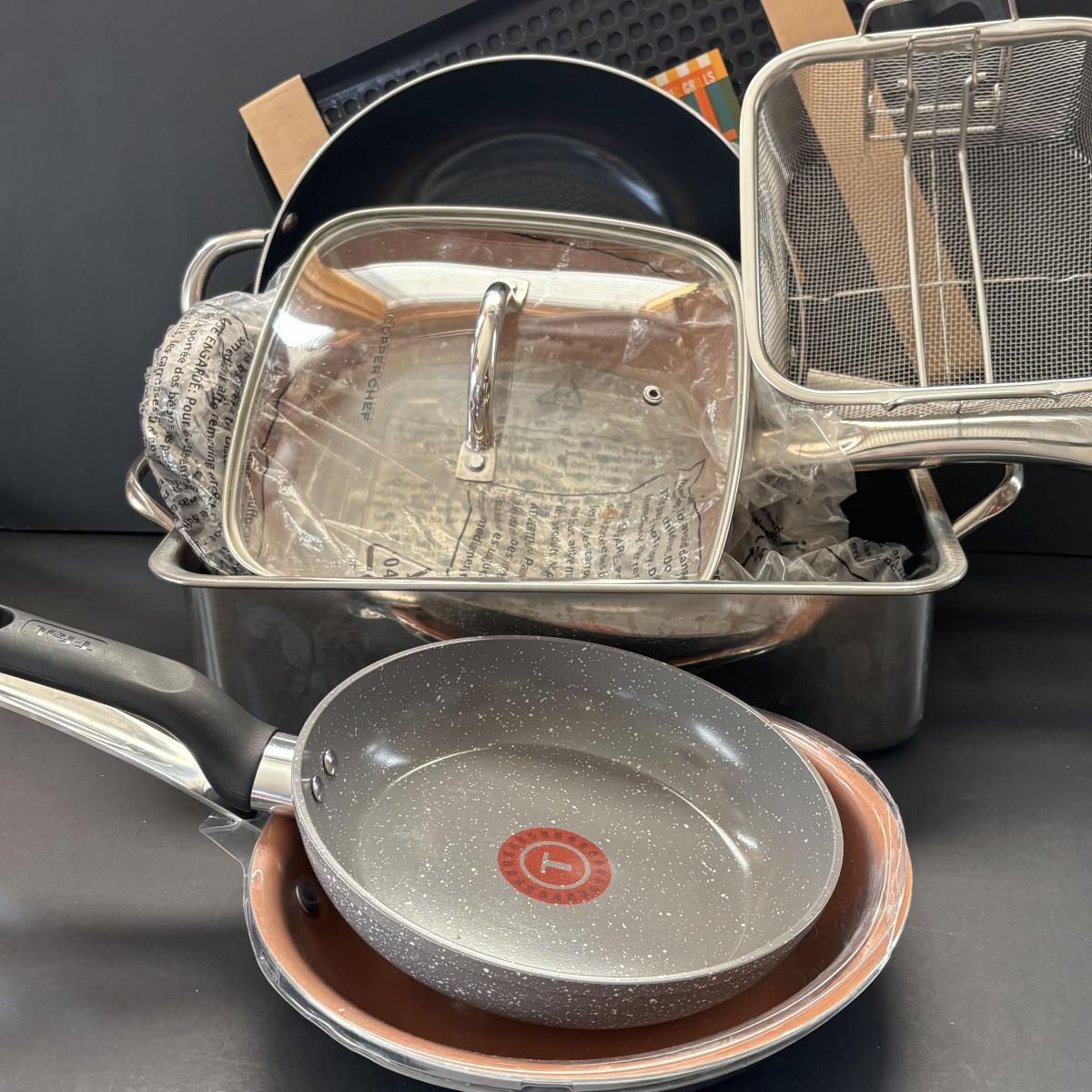 LOT 100: Cooper Chef, T-Fal, Gotham Steel, Martha Grill Topper & Stainless-Steel Pan/Roaster & Rack (no lid)