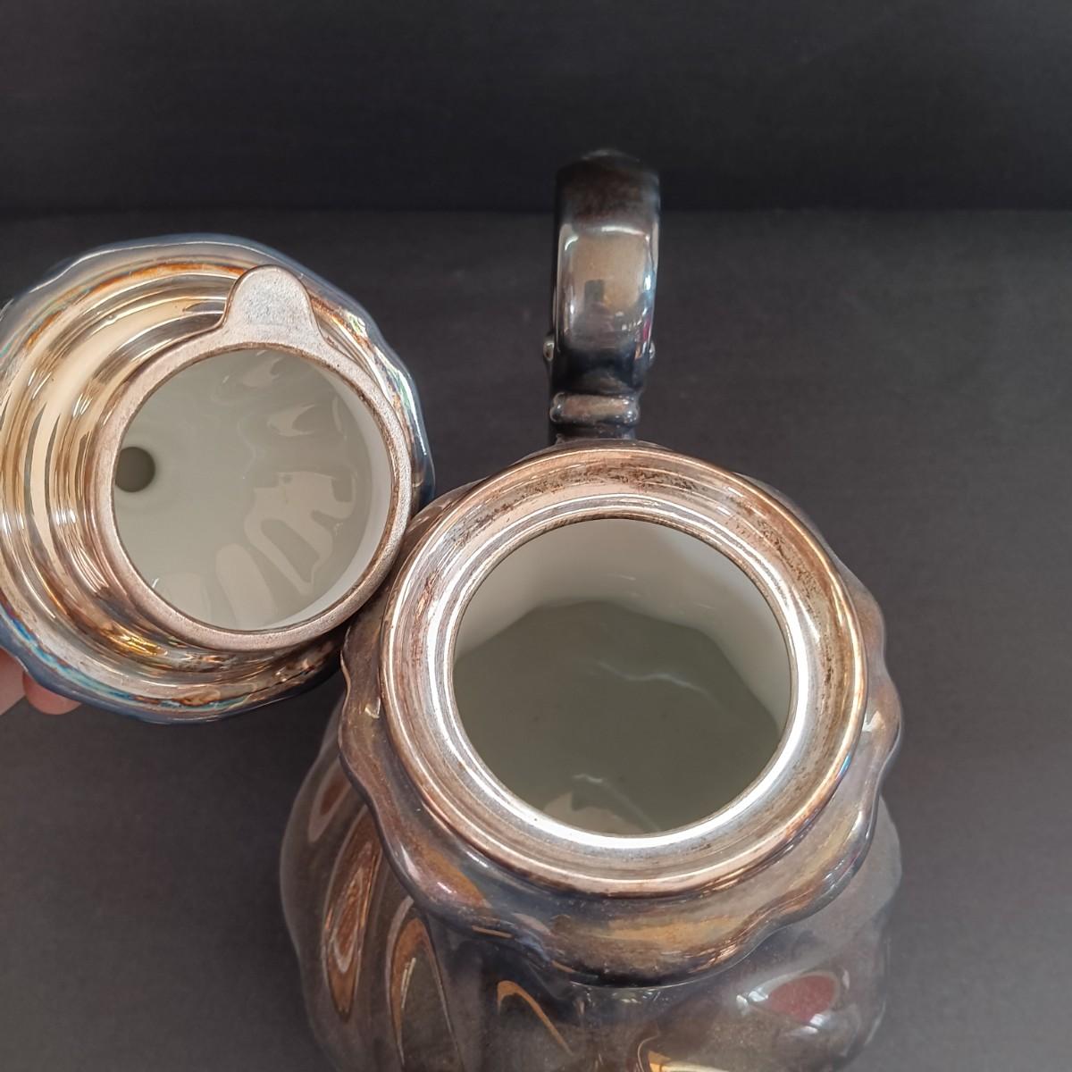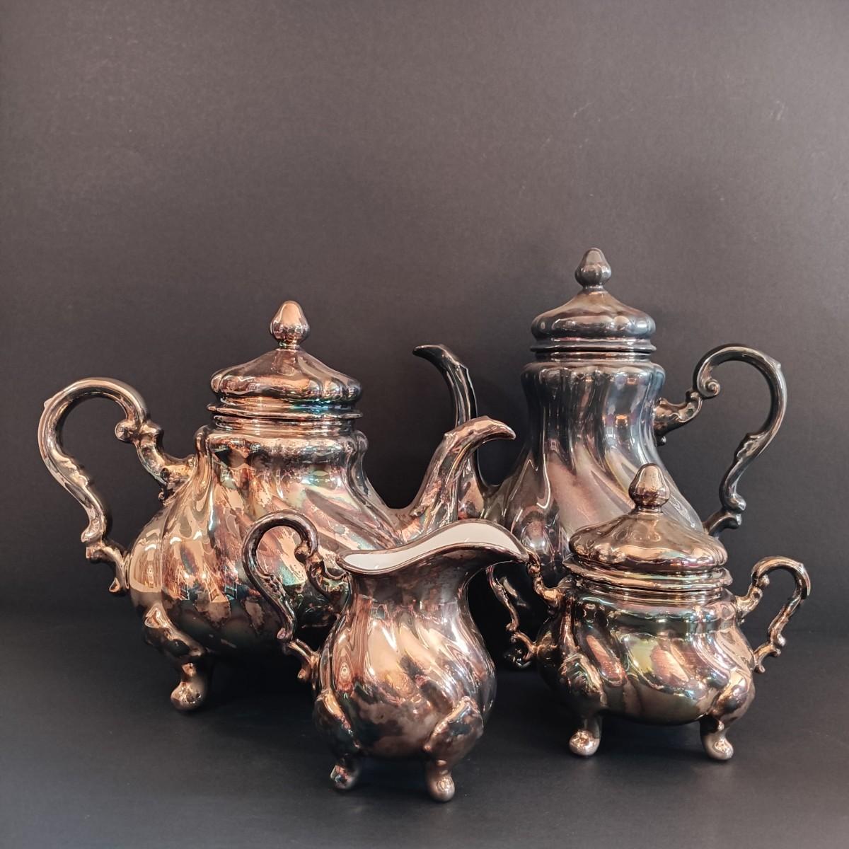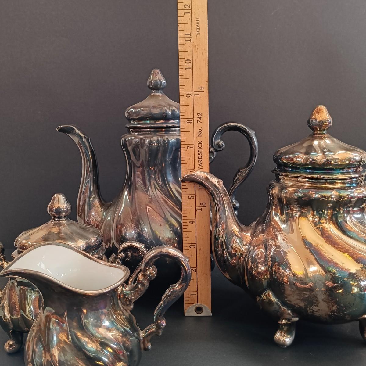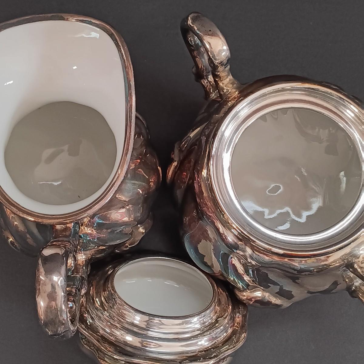 LOT 139: Feinsilber Auflage German Silver Overlay on Porcelain Tea Pot, Coffee Pot, Creamer & Sugar Dish