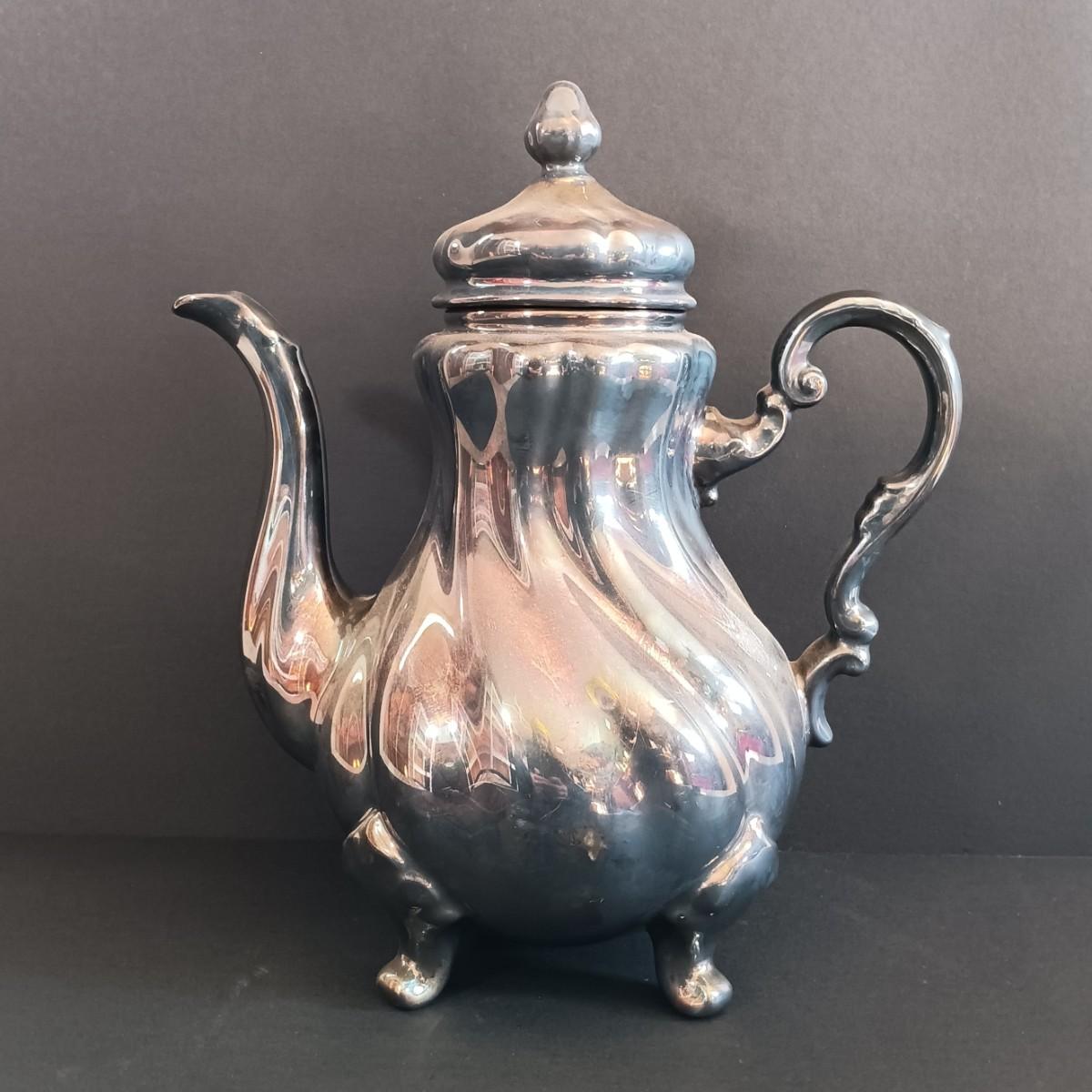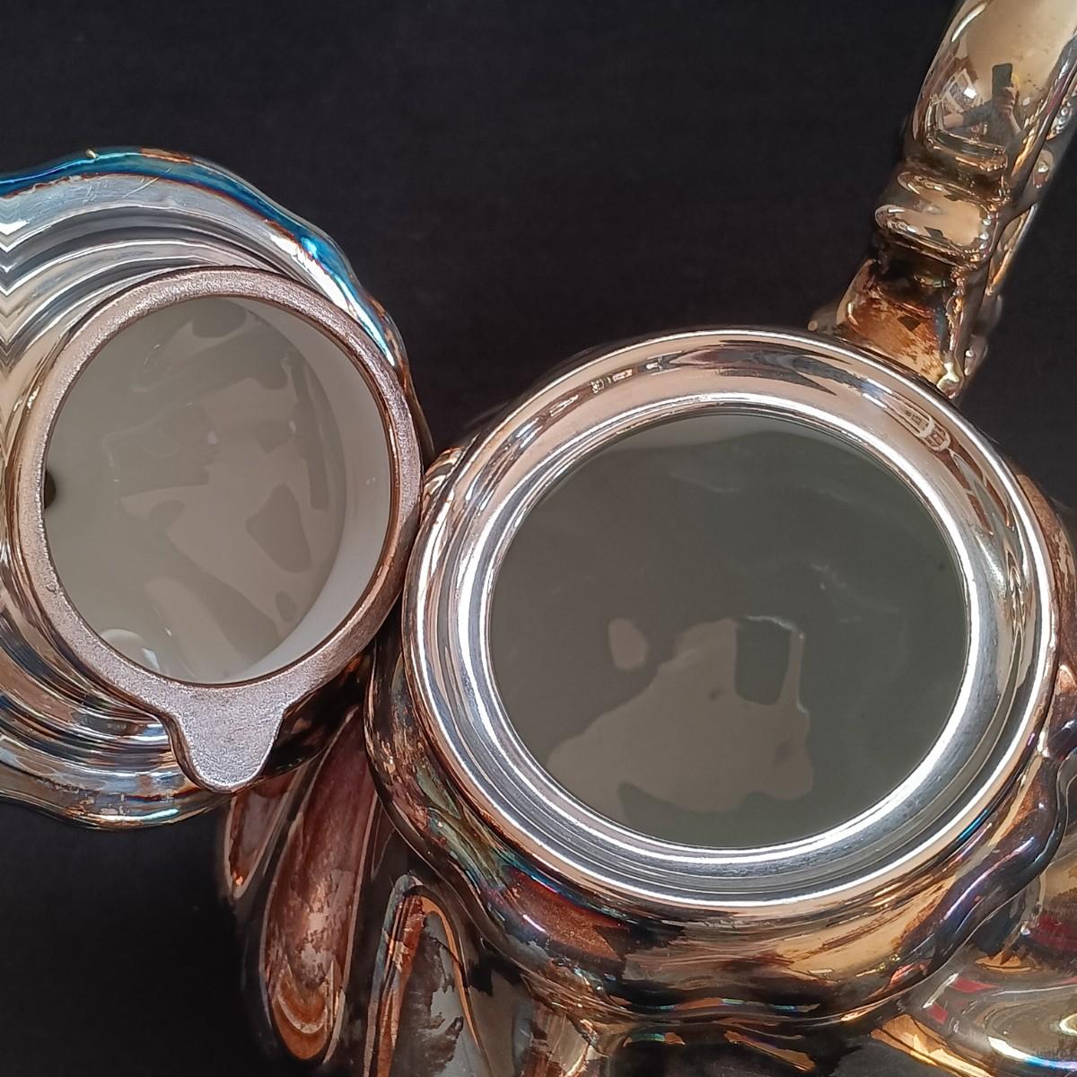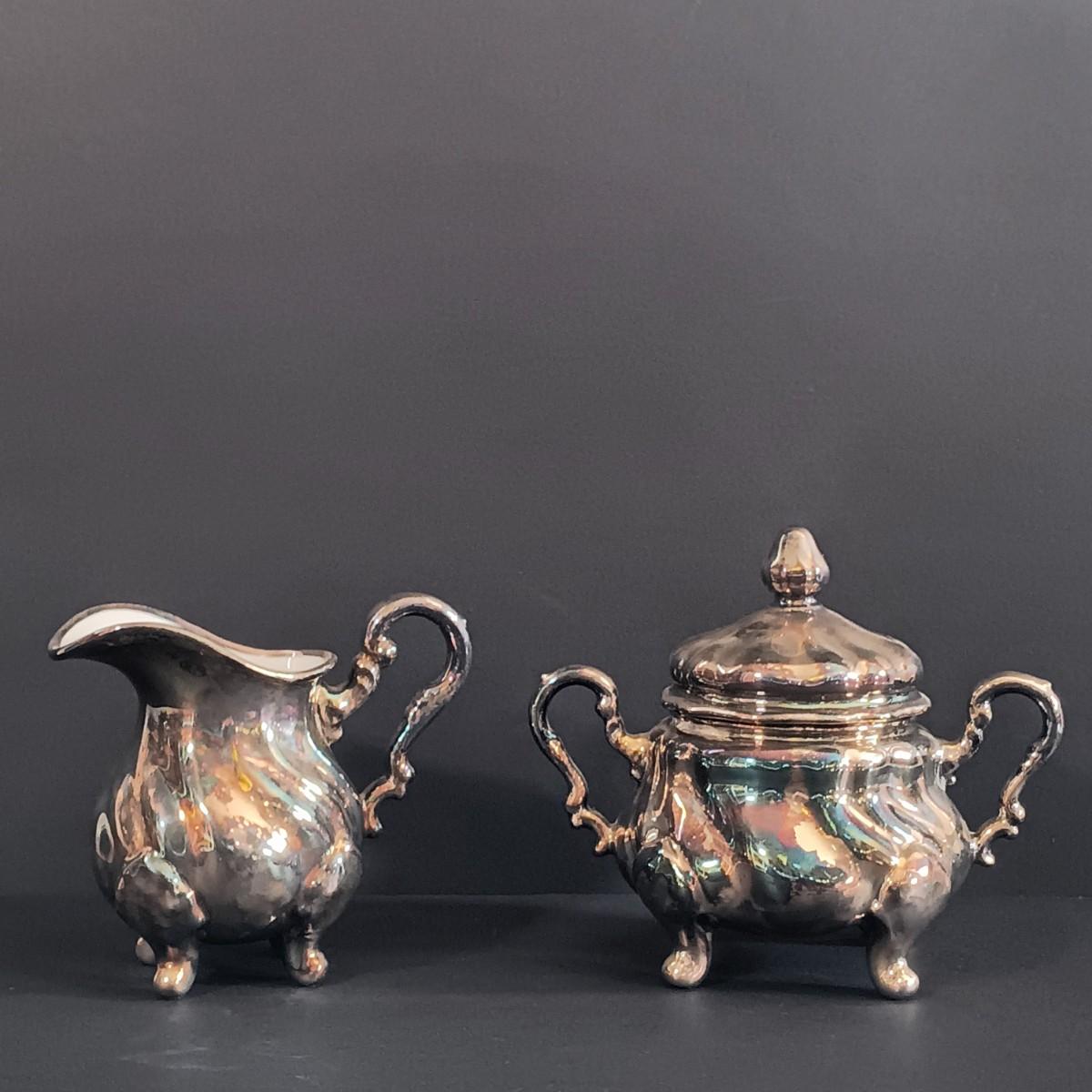 LOT 139: Feinsilber Auflage German Silver Overlay on Porcelain Tea Pot, Coffee Pot, Creamer & Sugar Dish