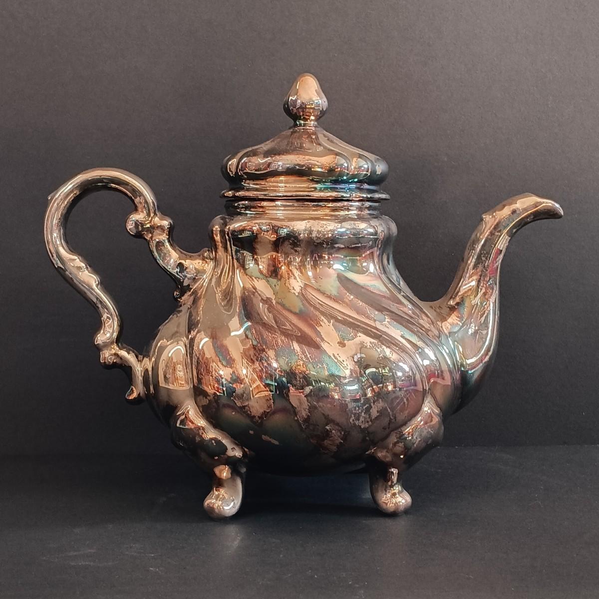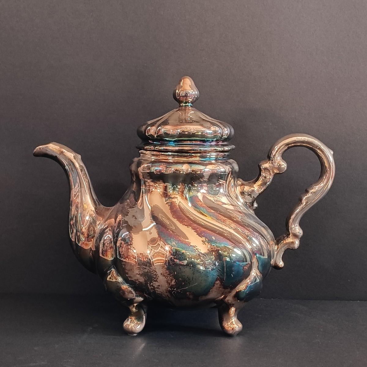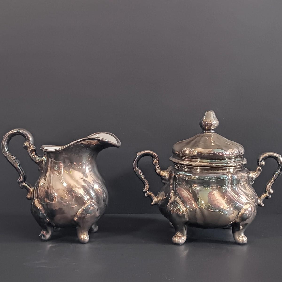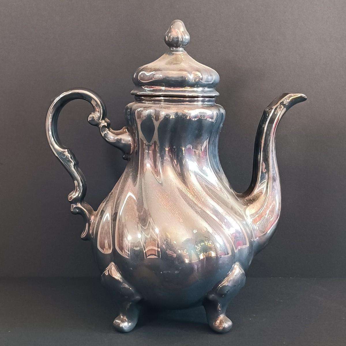 LOT 139: Feinsilber Auflage German Silver Overlay on Porcelain Tea Pot, Coffee Pot, Creamer & Sugar Dish