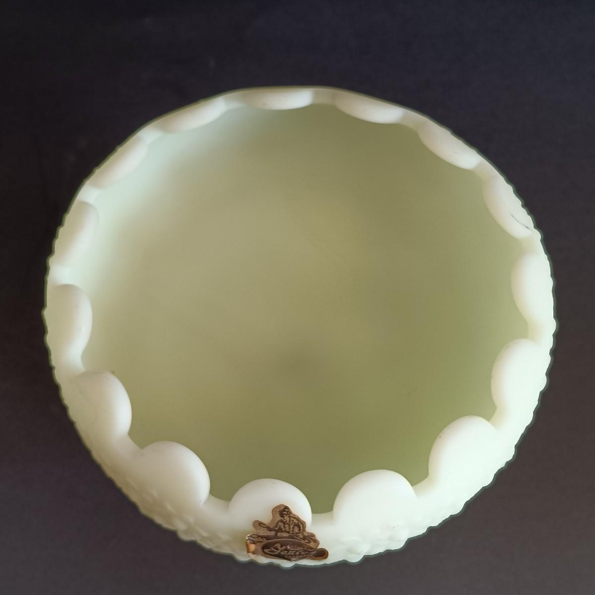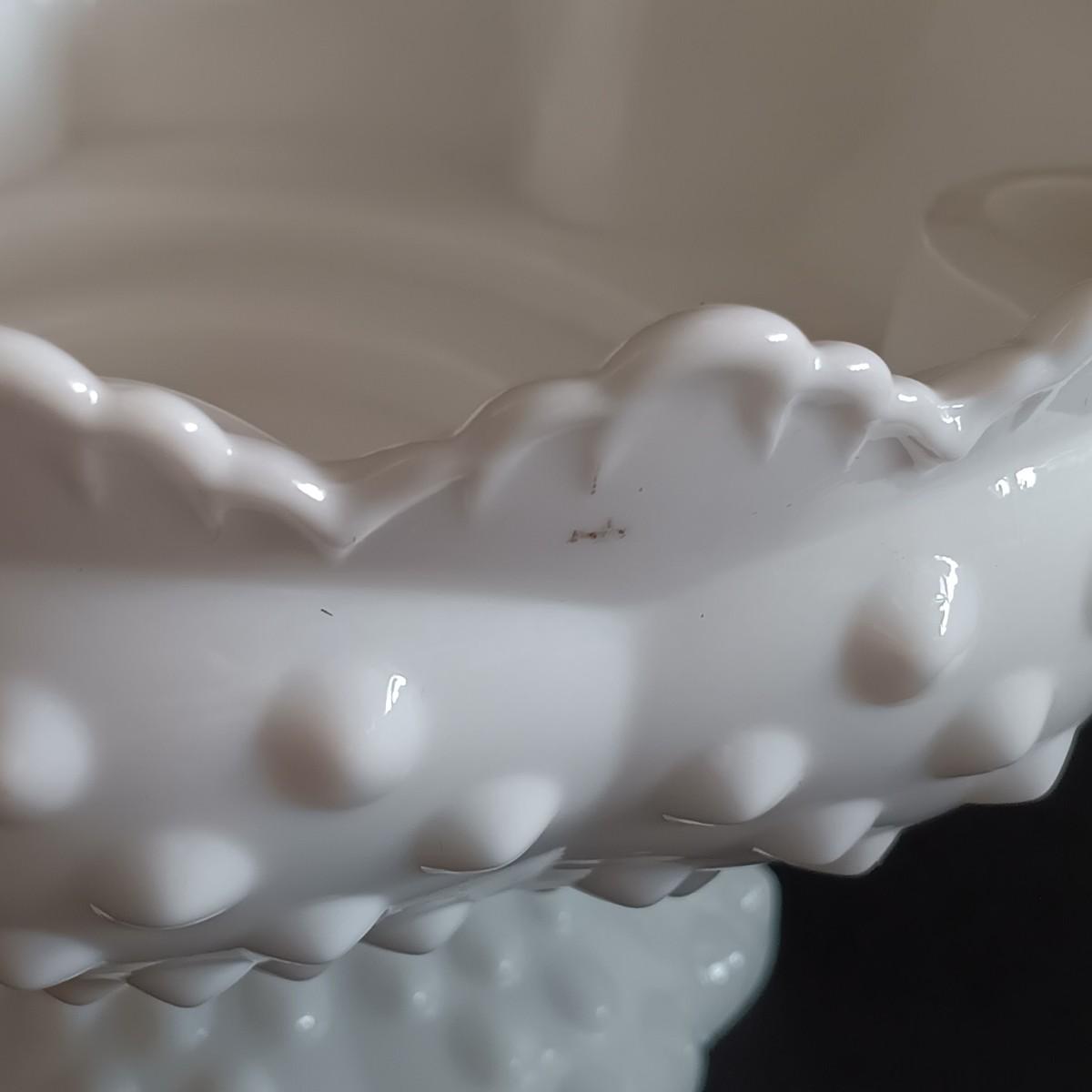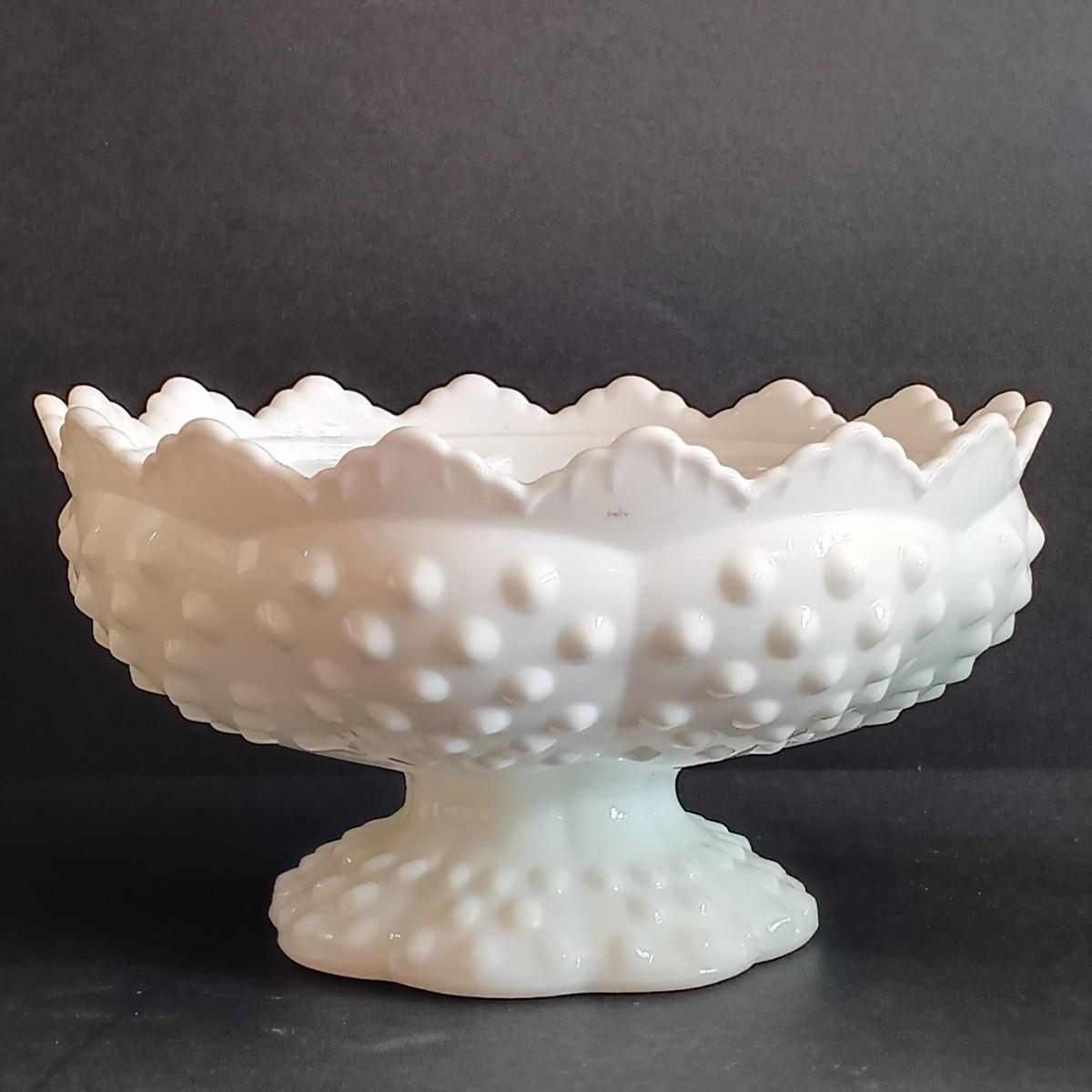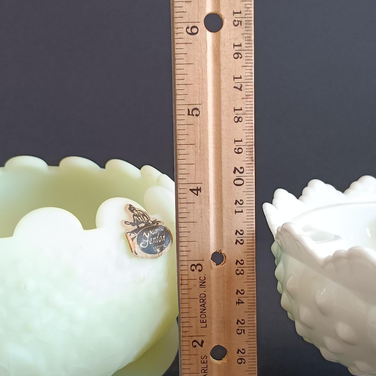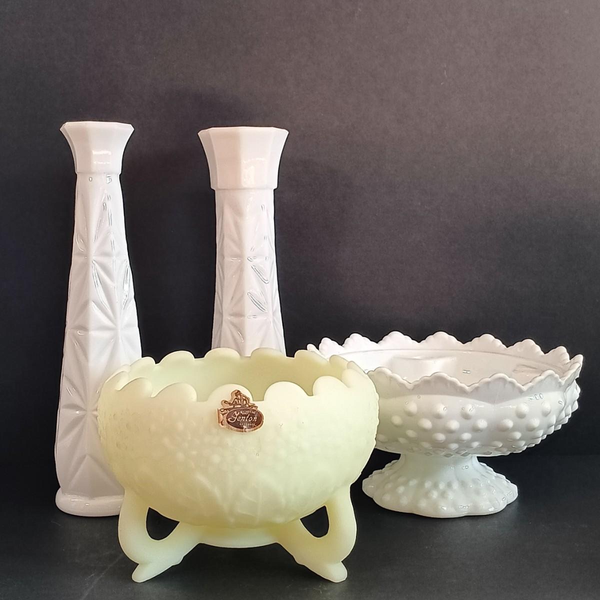 LOT 141: Fenton Uranium Custard Glass Footed Rose Bowl, Fenton Hobnail Milk Glass Pedestal Candle Bowl & Two Milk Glass Vases
