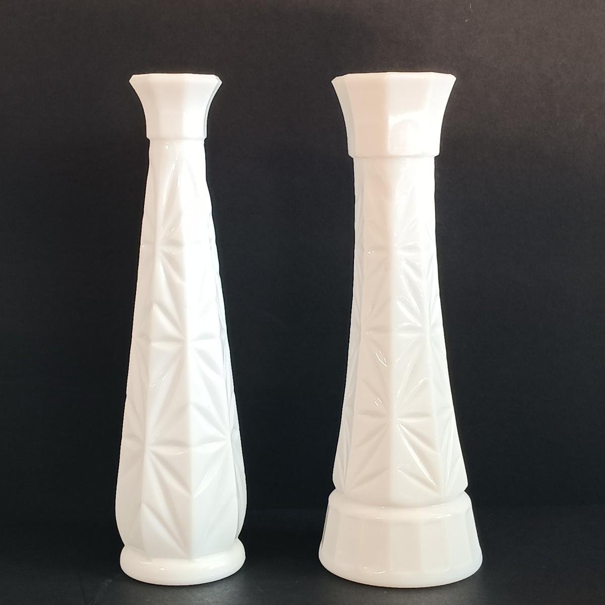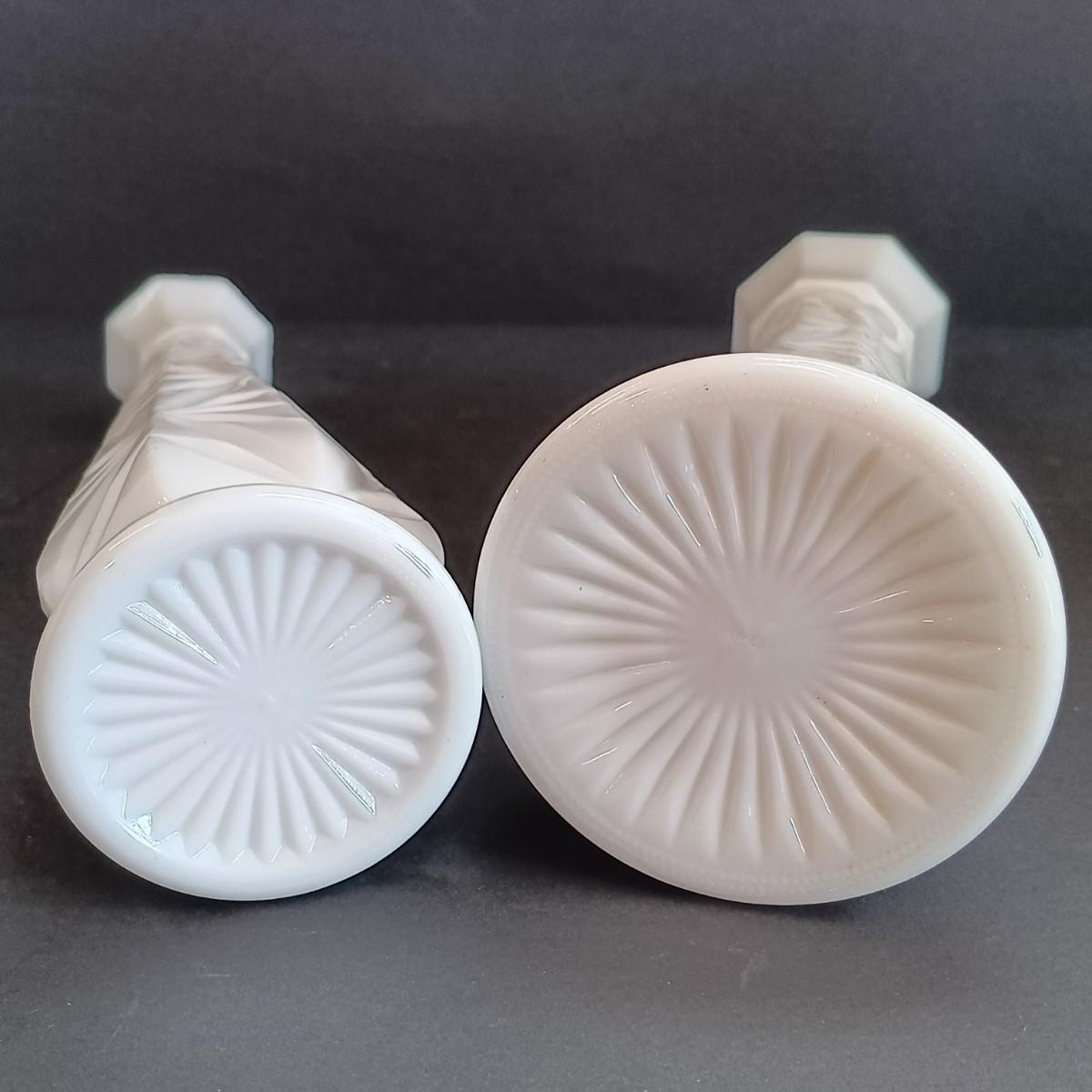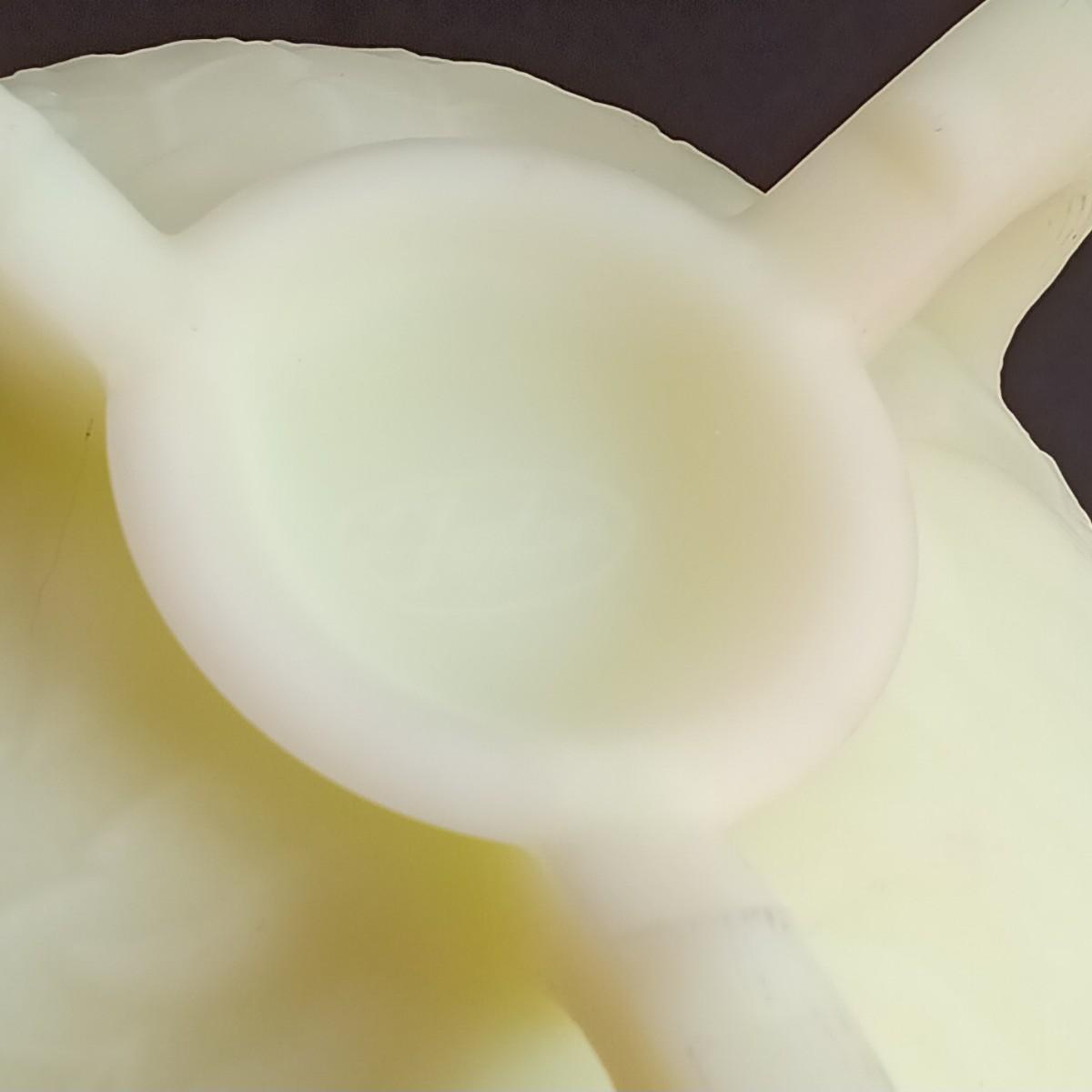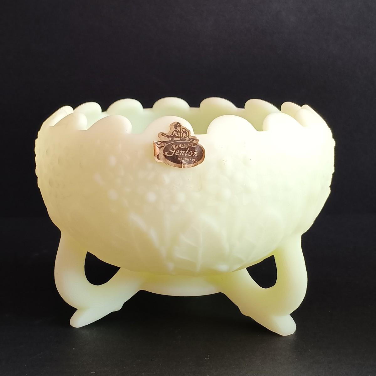 LOT 141: Fenton Uranium Custard Glass Footed Rose Bowl, Fenton Hobnail Milk Glass Pedestal Candle Bowl & Two Milk Glass Vases