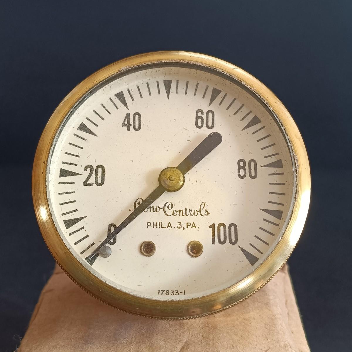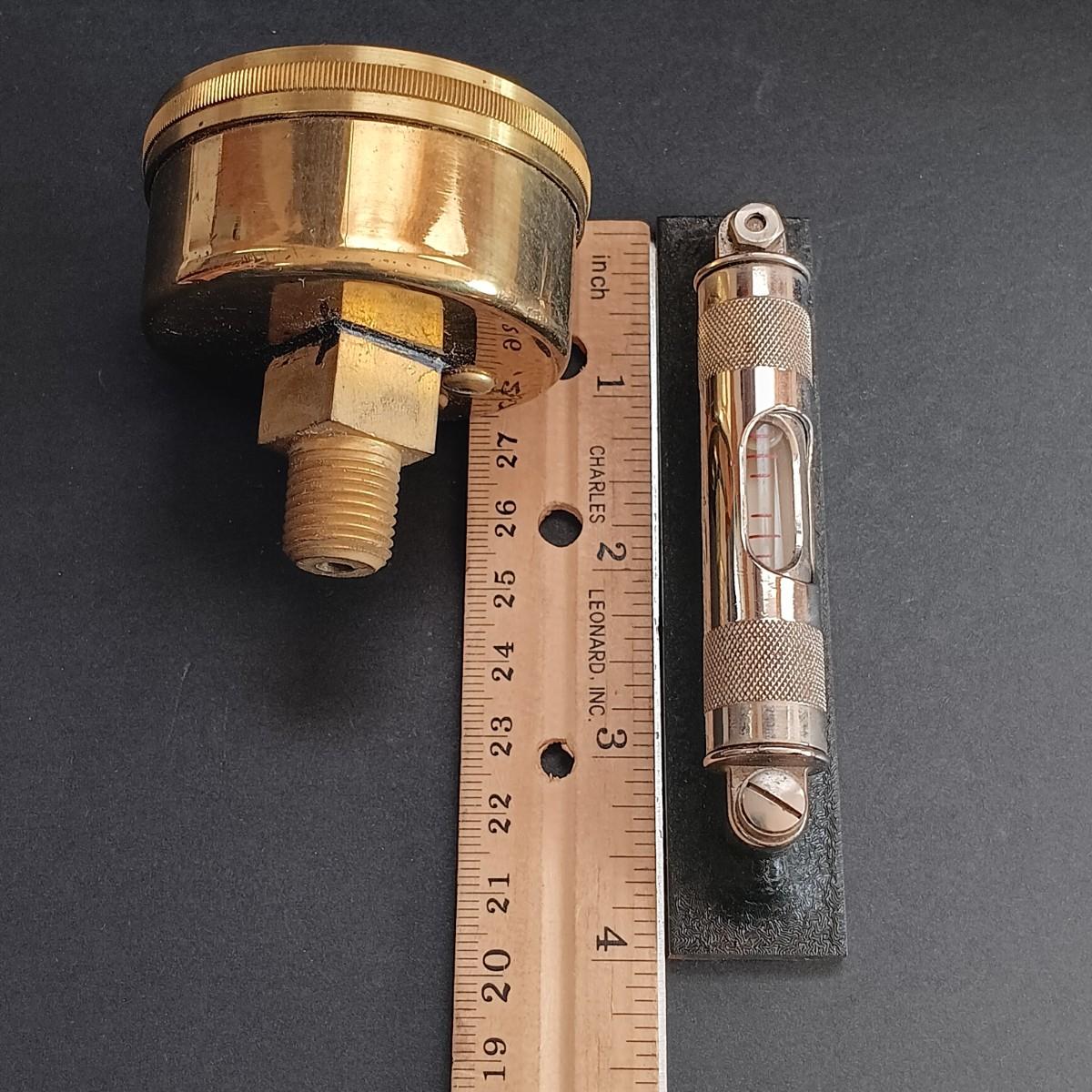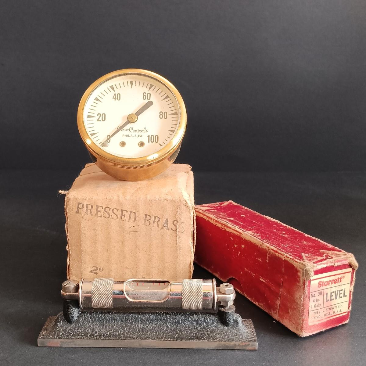 LOT 146: Vintage Cono-Controls Pressed Brass Pressure Gauge 17833-1 & Starrett 98-4 Machinists Level