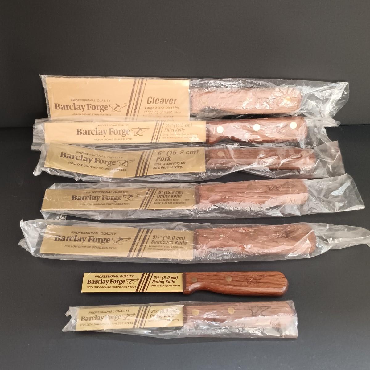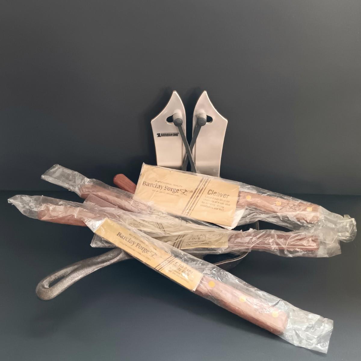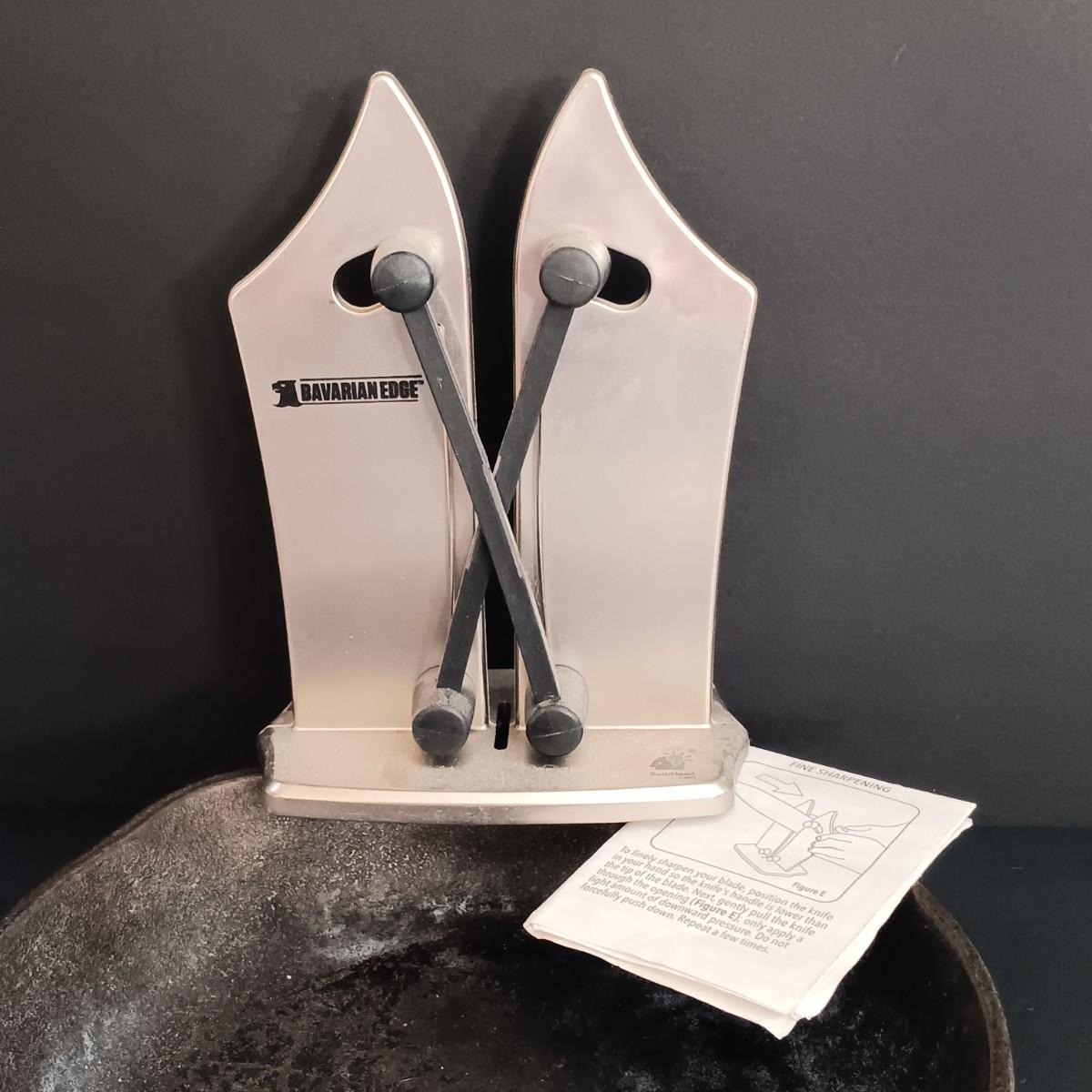 LOT 152: Barclay Forge Stainless Steel Knife Set, Bavarian Edge Knife Sharpener & 8" Wagner Cast Iron Skillet