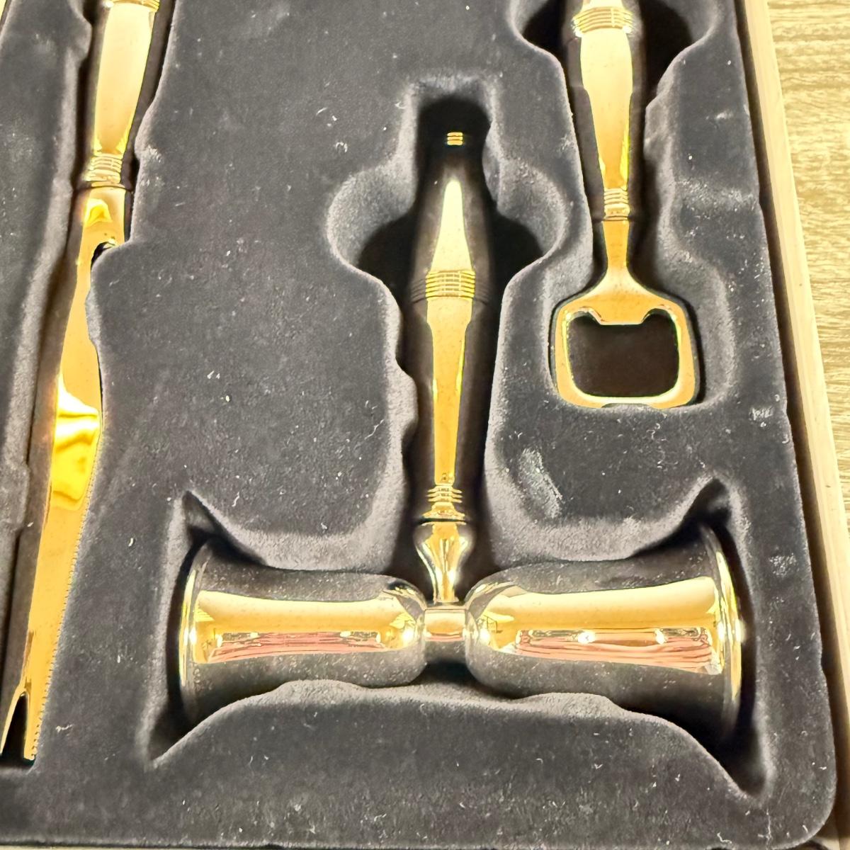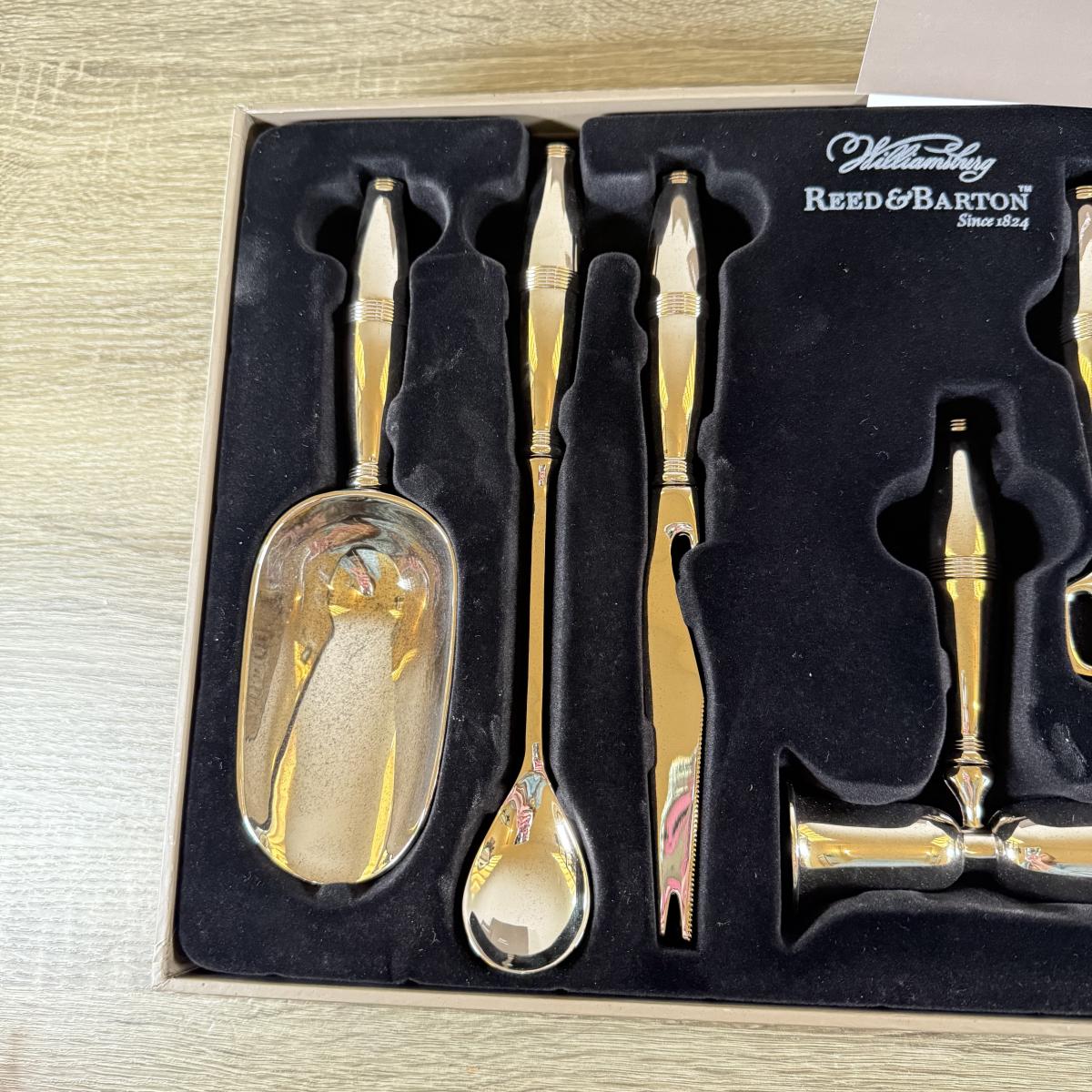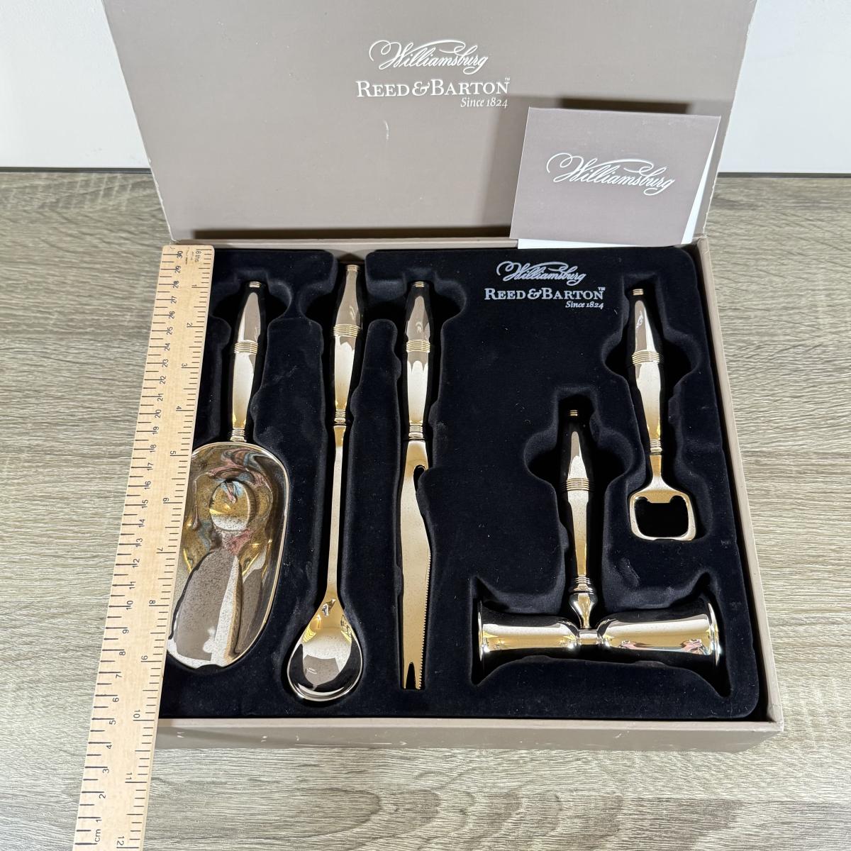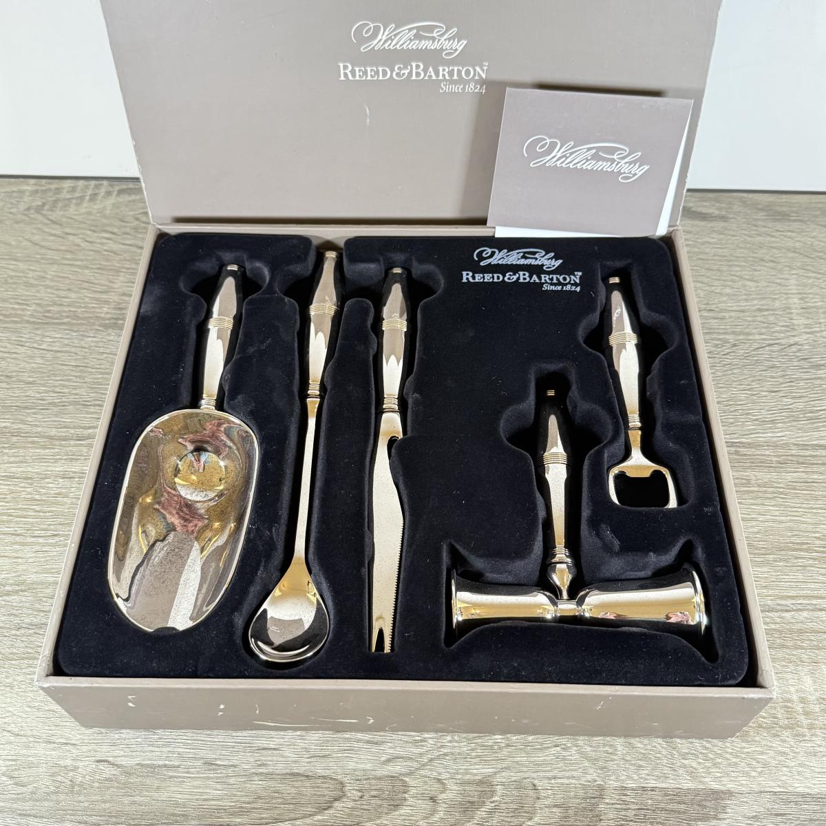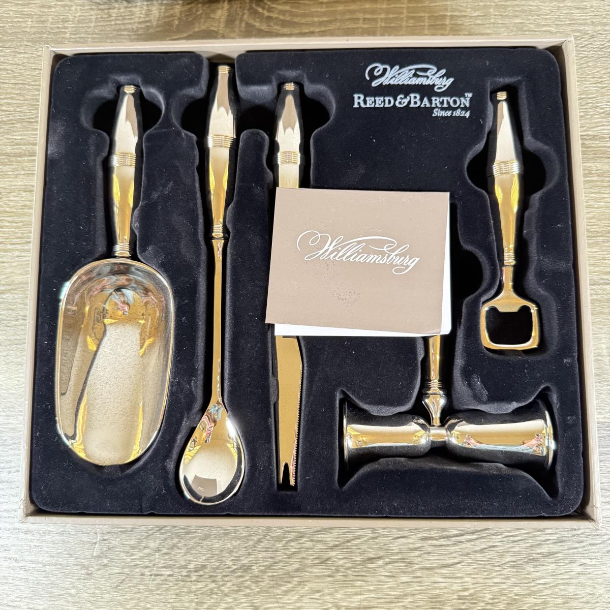 LOT 50L: Reed & Barton Williamsburg Silver Plate Bar Tool Set w/ Box