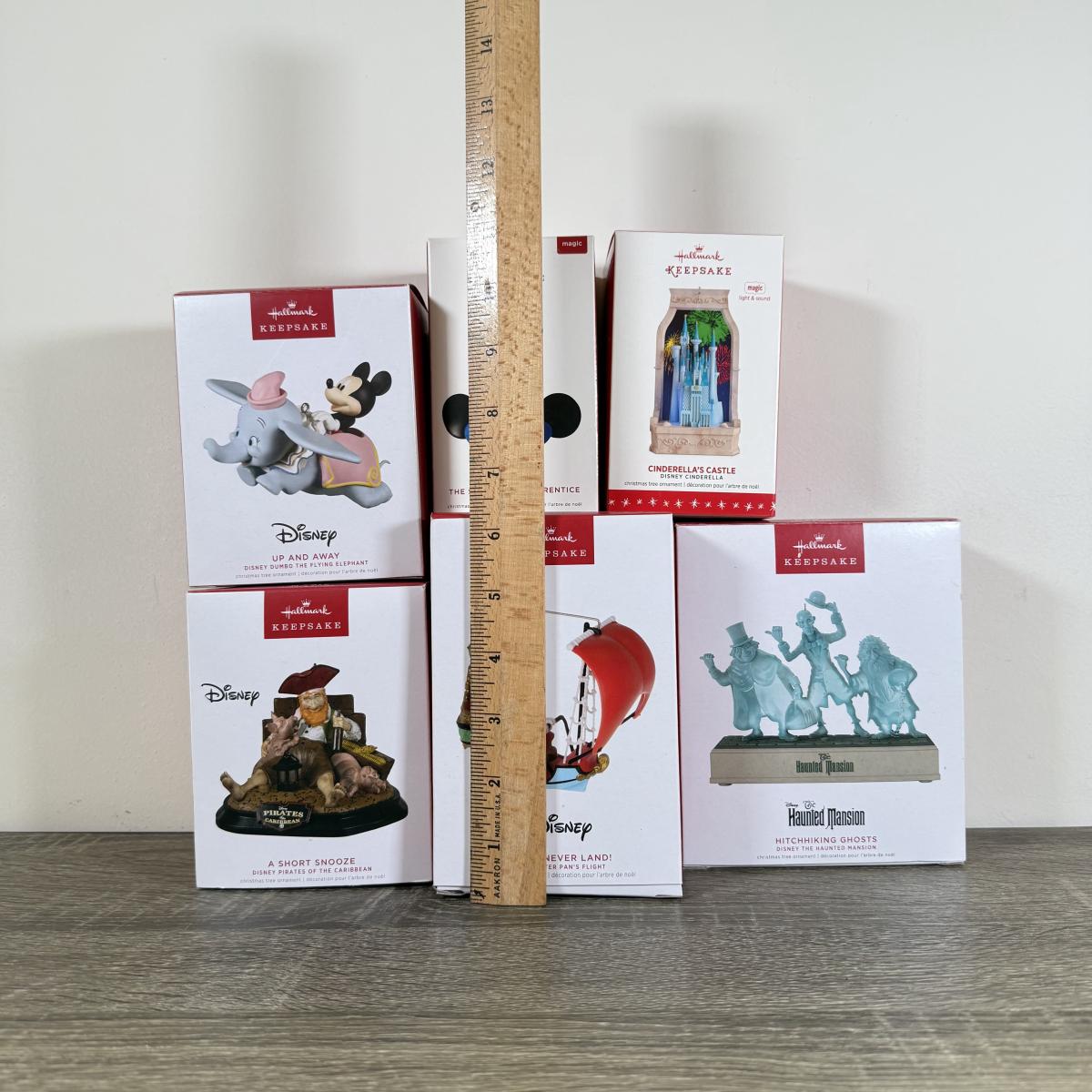 LOT 79M: Disney Hallmark Keepsake Ornaments w/ Boxes - Haunted Mansion, Peter Pan's Flight, Cinderella's Castle, Sorcerer's Apprentice, Pirates of the Caribbean & Dumbo