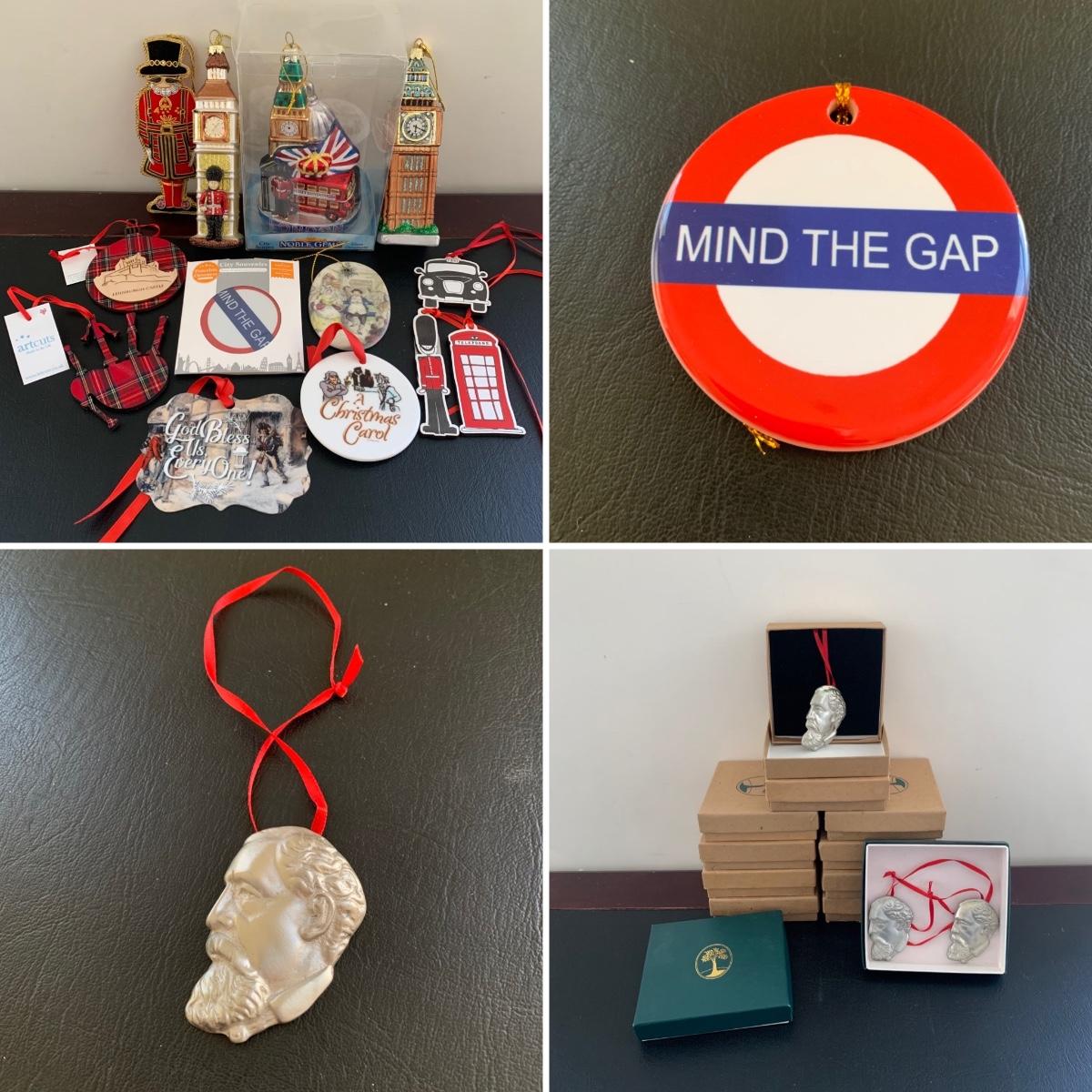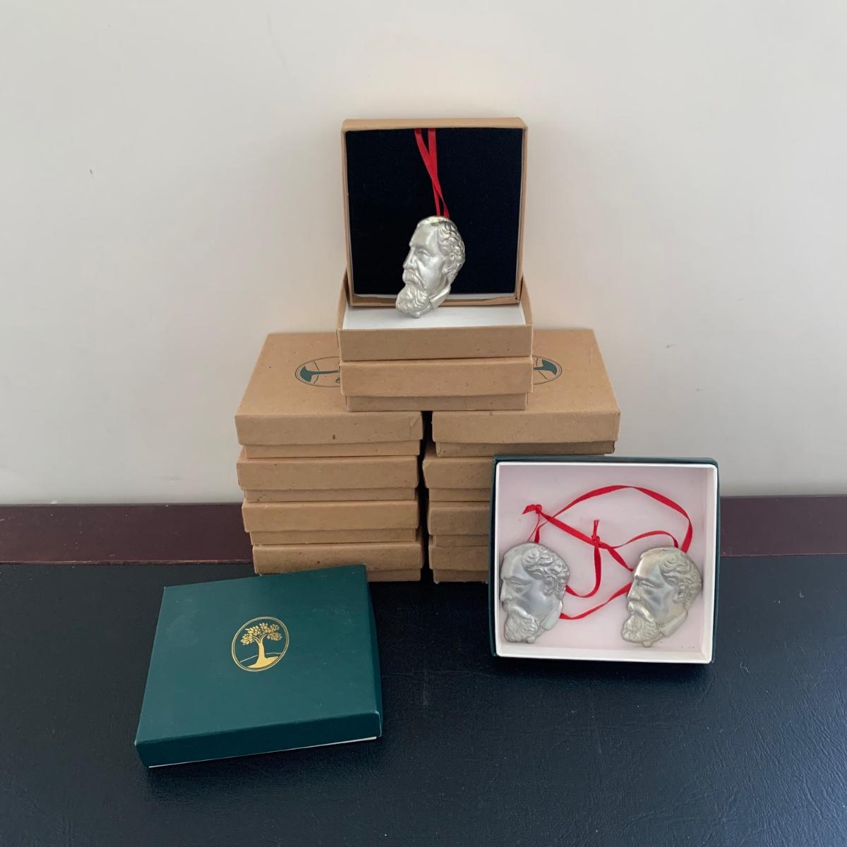 LOT 117 M: UK Christmas Ornaments & 13 Levenger Pewter Charles Dickens Head Ornaments